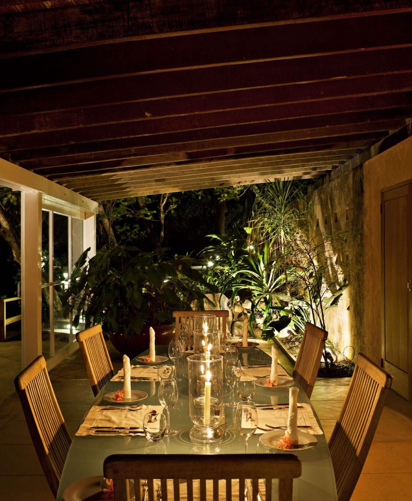 One could imagine this villa, in particular the main open plan living area and infinity pool being the backdrop of a movie. The crisp, white interior with subtle recesses filled with books and pieces of art surrounds the central seating area and is quite simply stunning. The elegant infinity pool set amongst mature tropical gardens connects to a lovely exterior dining area with wooden table & chairs for 8 guests.