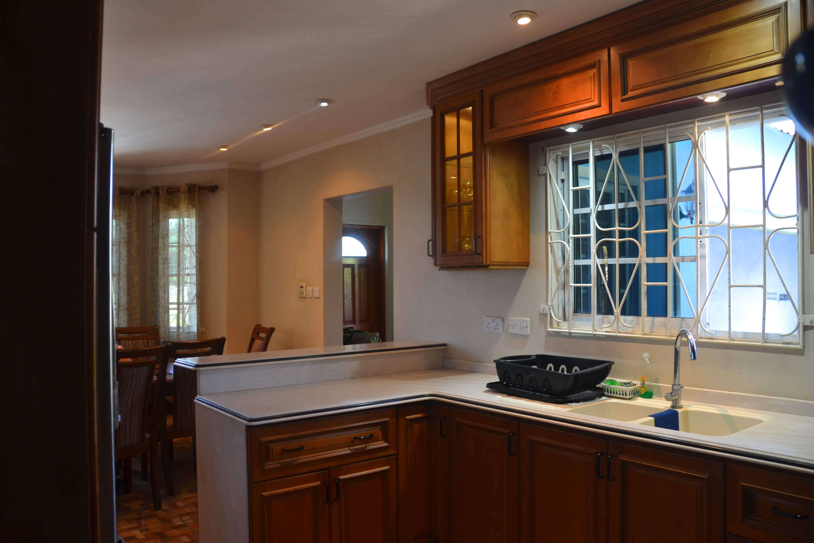 Modern technology, materials and techniques have been used in the construction of this building. The general finishes are as follows: - Roof: Gable with galvanize cladding - Ceiling: Sheet rock and reinforced concrete slab - Floors: Ceramic tiles and laminate on the stairs - Walls: Reinforced concrete block walls which are rendered and finished appropriately with paint - Doors: Solid, hollow panel and aluminum doors - Windows: Sliding sash.