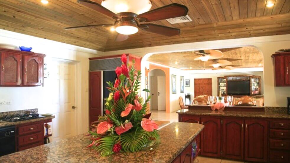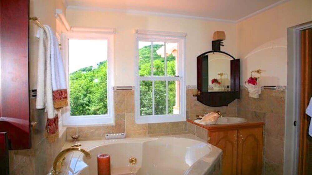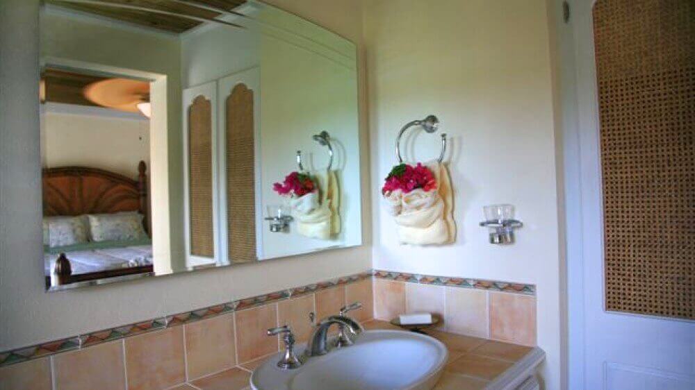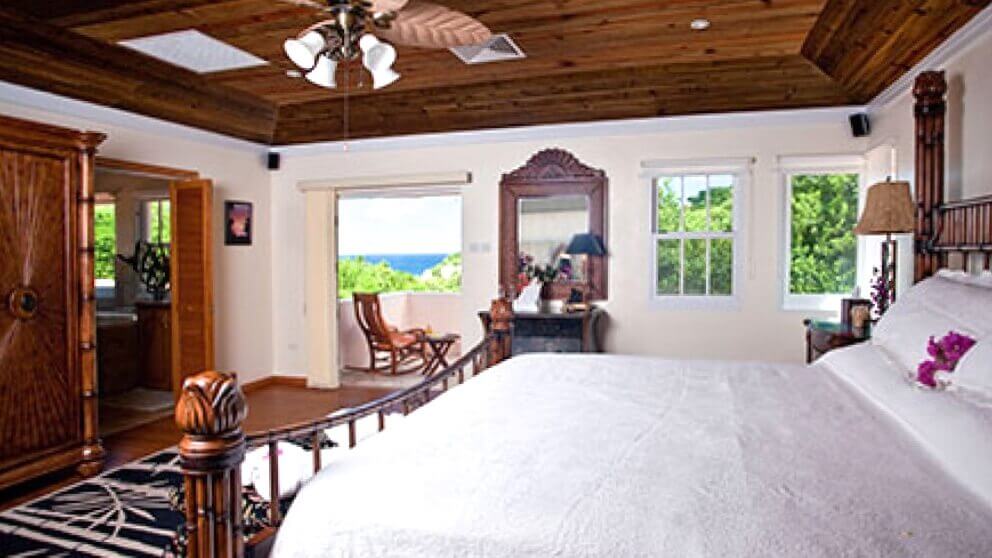 Stairs from the hall lead to the master suite with A/C. Ensuite is a Jacuzzi tub, large walk-in shower, twin w.b.'s and w.c.Spacious walk-in closet, with wall safe. Double doors from the bedroom open onto a small balcony with views of the garden & the sea beyond.