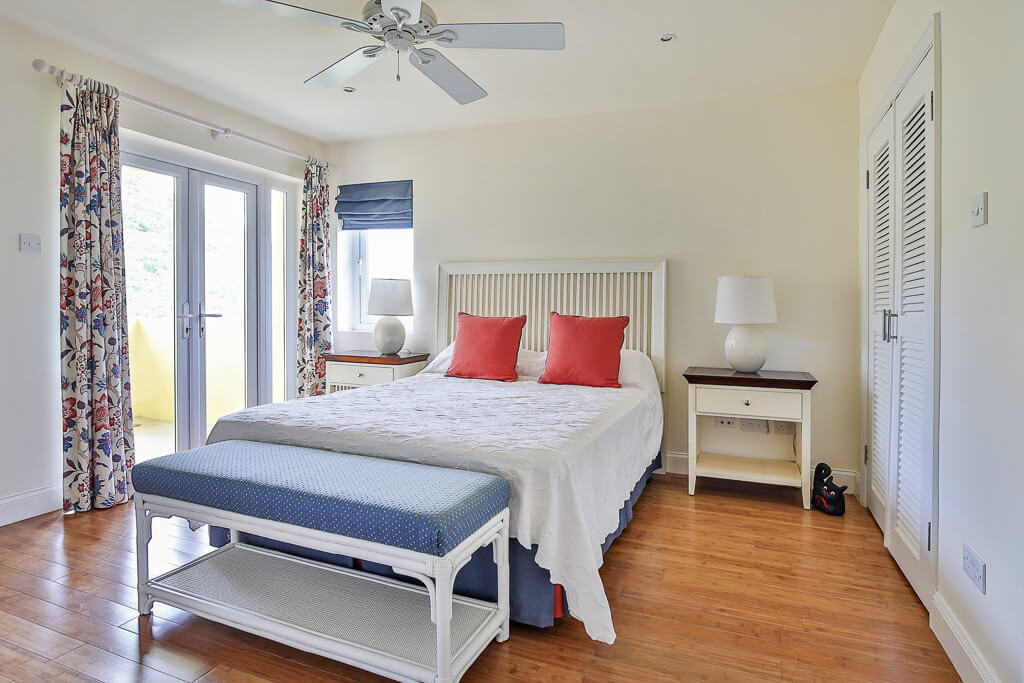King-size bed, fitted wardrobes, hardwood floors, cathedral ceiling, A/C and overhead fan. Balcony with views of the Atlantic Ocean and Martinique. Large ensuite with full bath, walk-in shower and a two basin vanity unit.