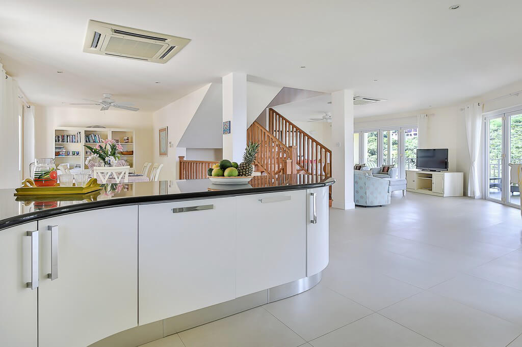 Open plan Kitchen/Living/Dining. Fully fitted Italian modern kitchen. Granite work surface & breakfast bar. Electric hob and oven, dishwasher, fridge/freezer, and microwave. Living & dining room with A/C and overhead fans opens. Two sets of sliding doors open onto a very large balcony for indoor/outdoor living, with views of the Atlantic Ocean, and in the distance Martinique.
