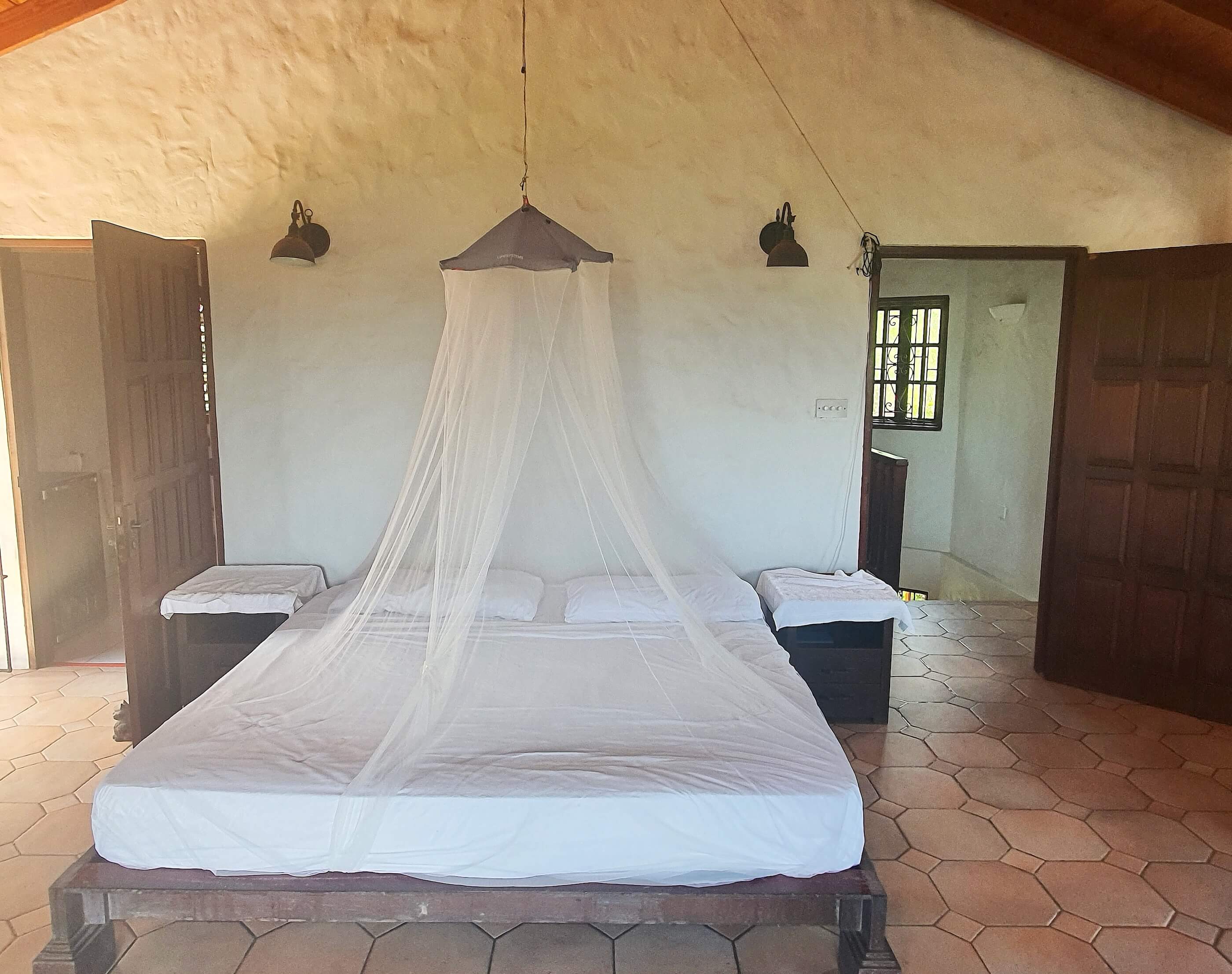 Guest Bedroom: with en-suite bathroom (shower over tub), built-in wardrobes, and direct access to the pool terrace.