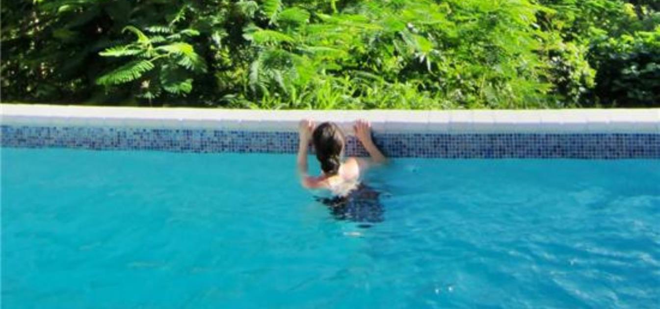 Outside there is a 33 ft salt water swimming pool with plenty of outdoor space for relaxing in the sunshine and a beautiful tropical garden.