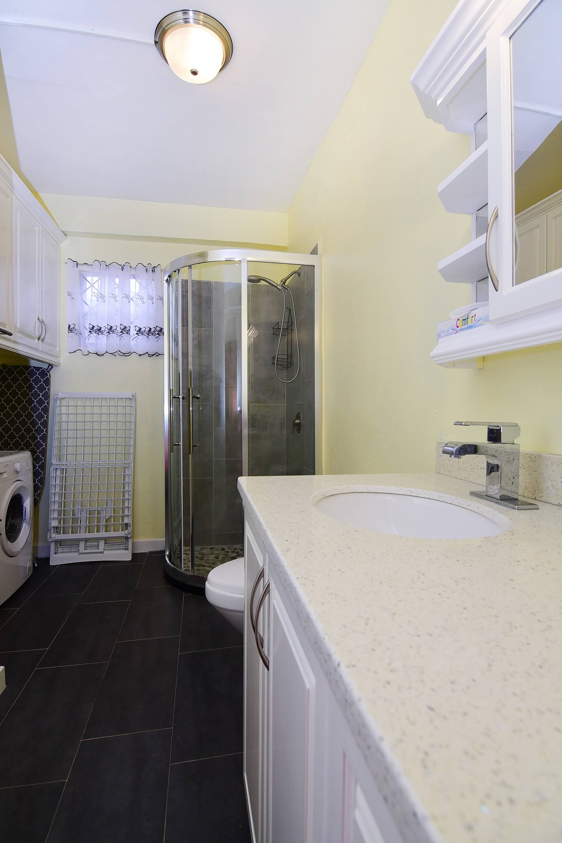- Guest shower room with shower, WC, twin basins, and washing machine