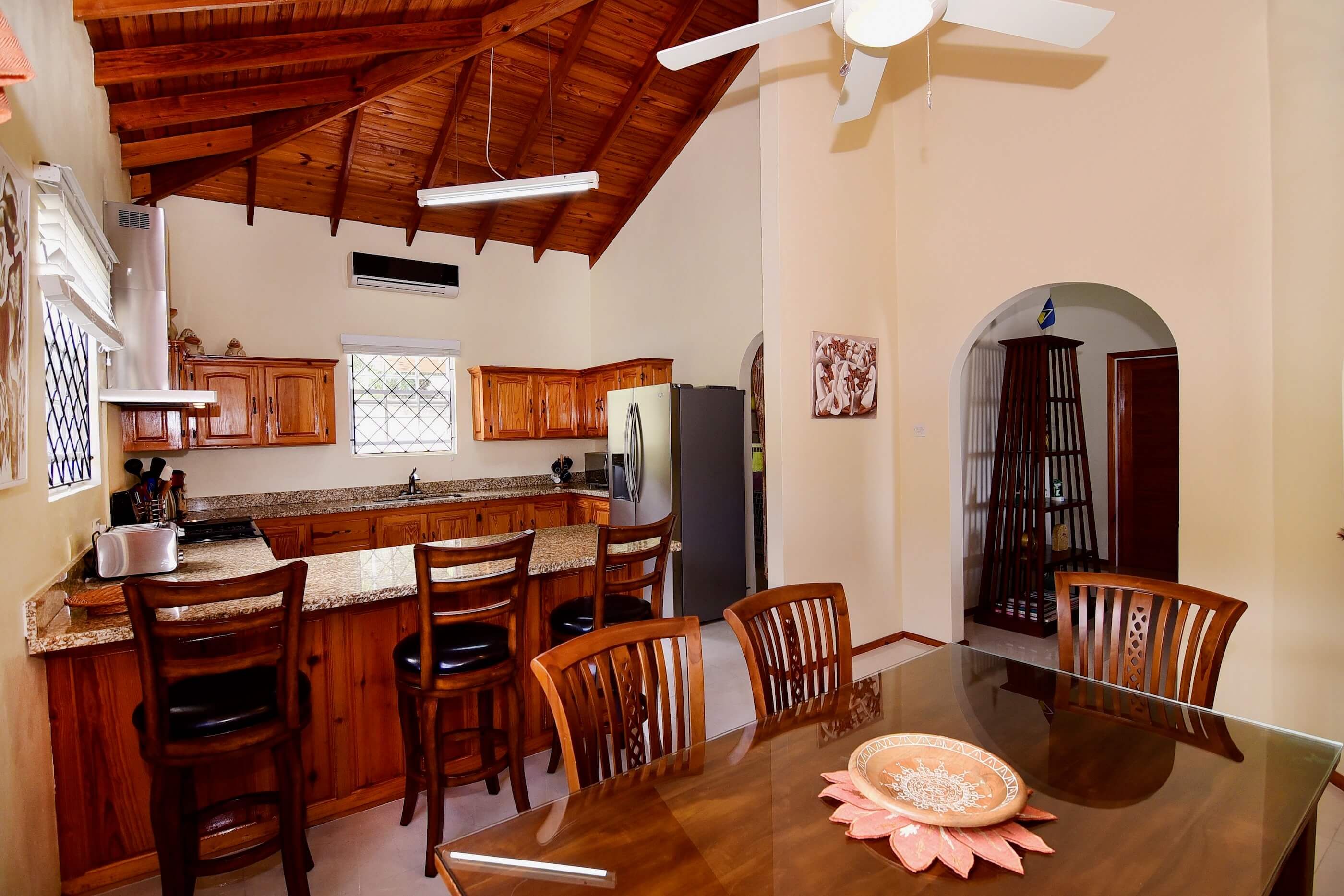 - Open-plan kitchen with gas cooker, double sinks, large fridge-freezer, microwave, breakfast bar, dining table for six, and A/C