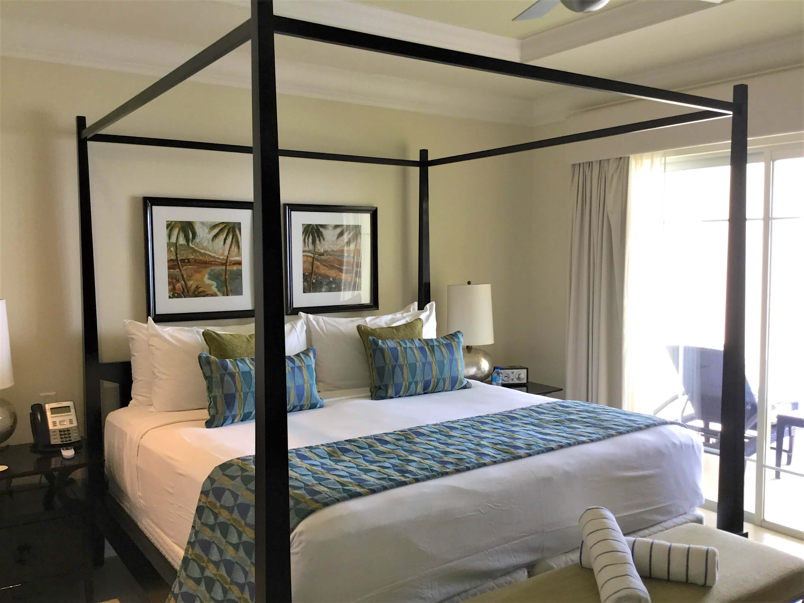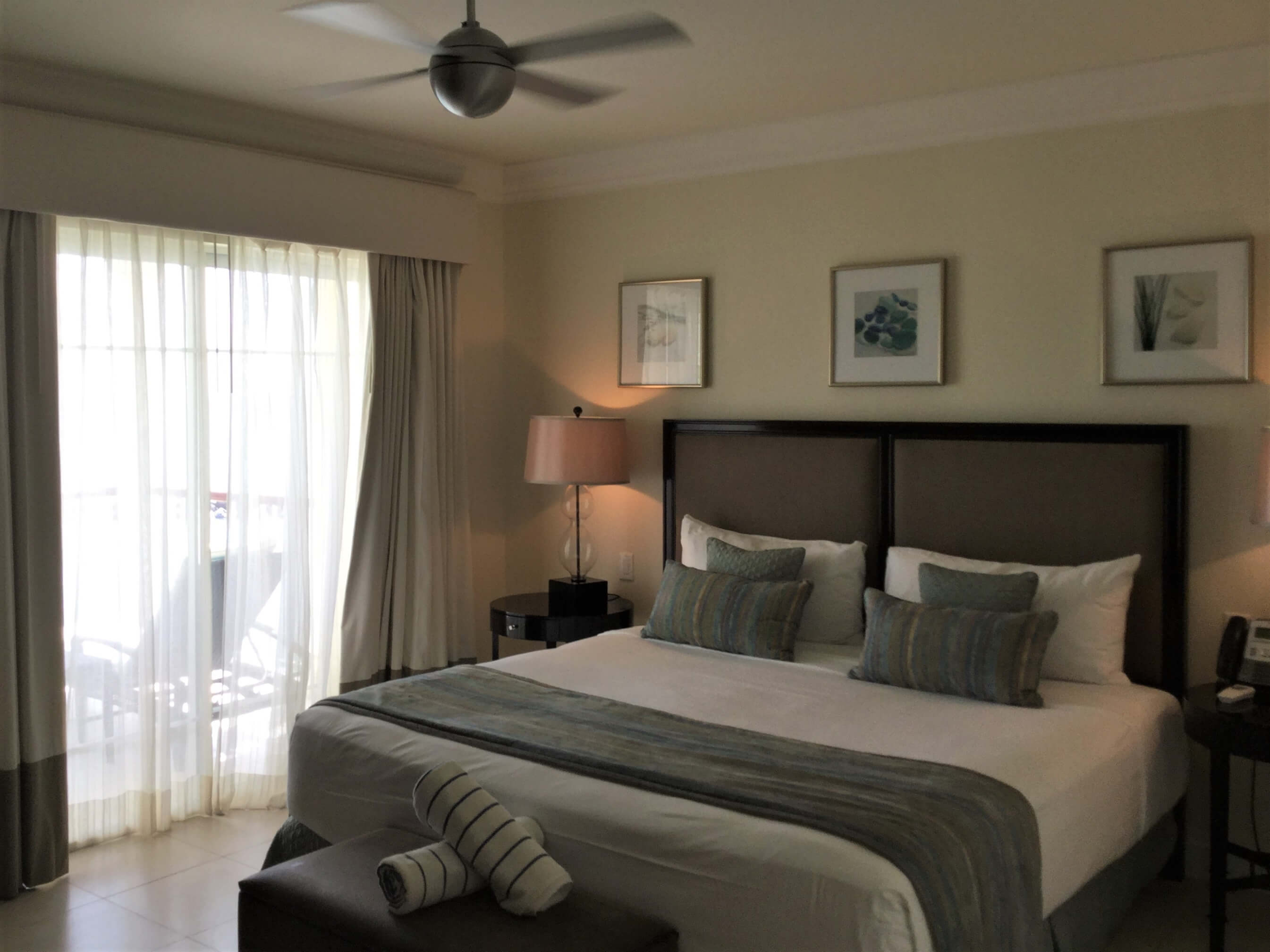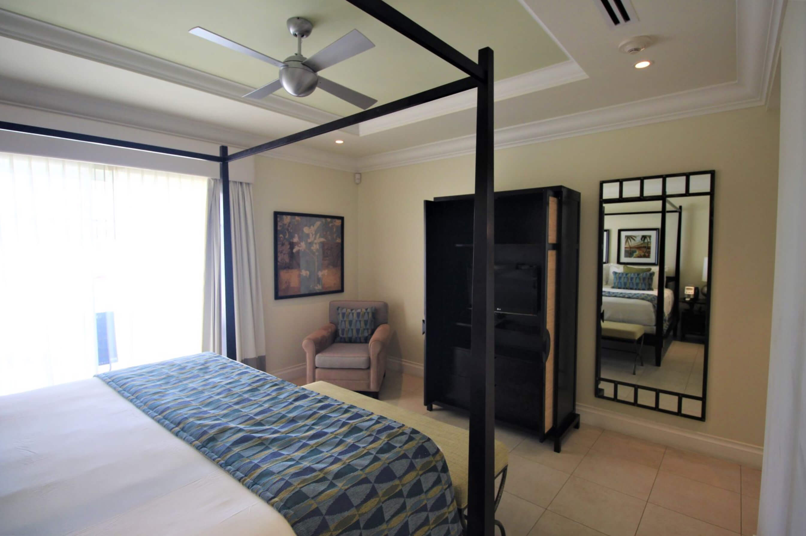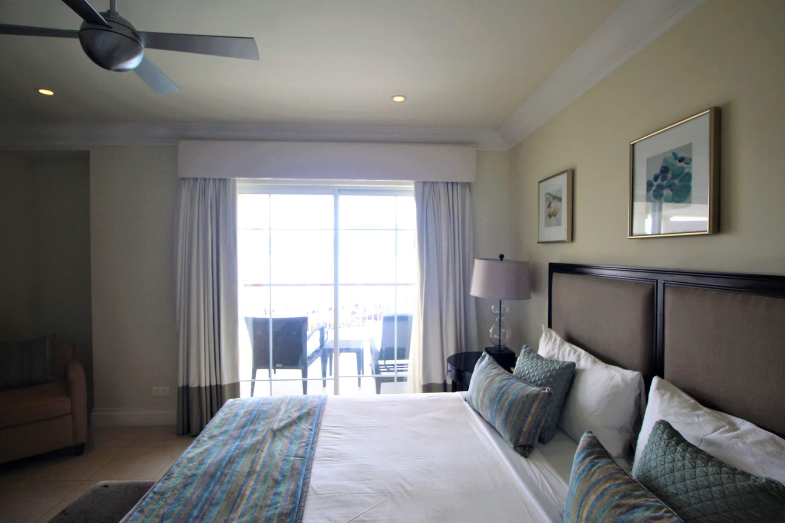 King size bed, walk-in closet with safe, ceiling fan, entertainment unit with flat screen TV, doors leading to wrap around balcony with ocean and beach bar view.