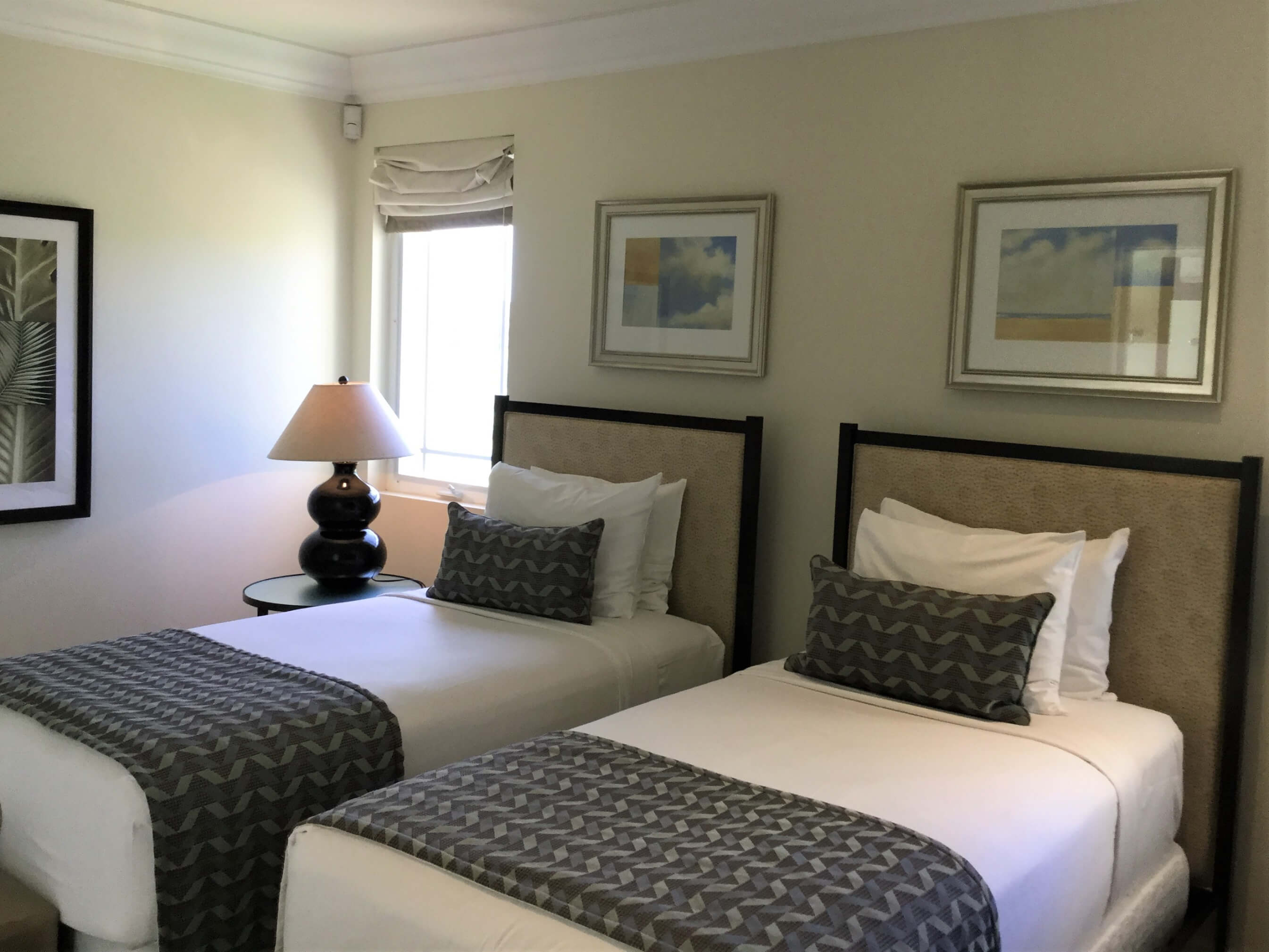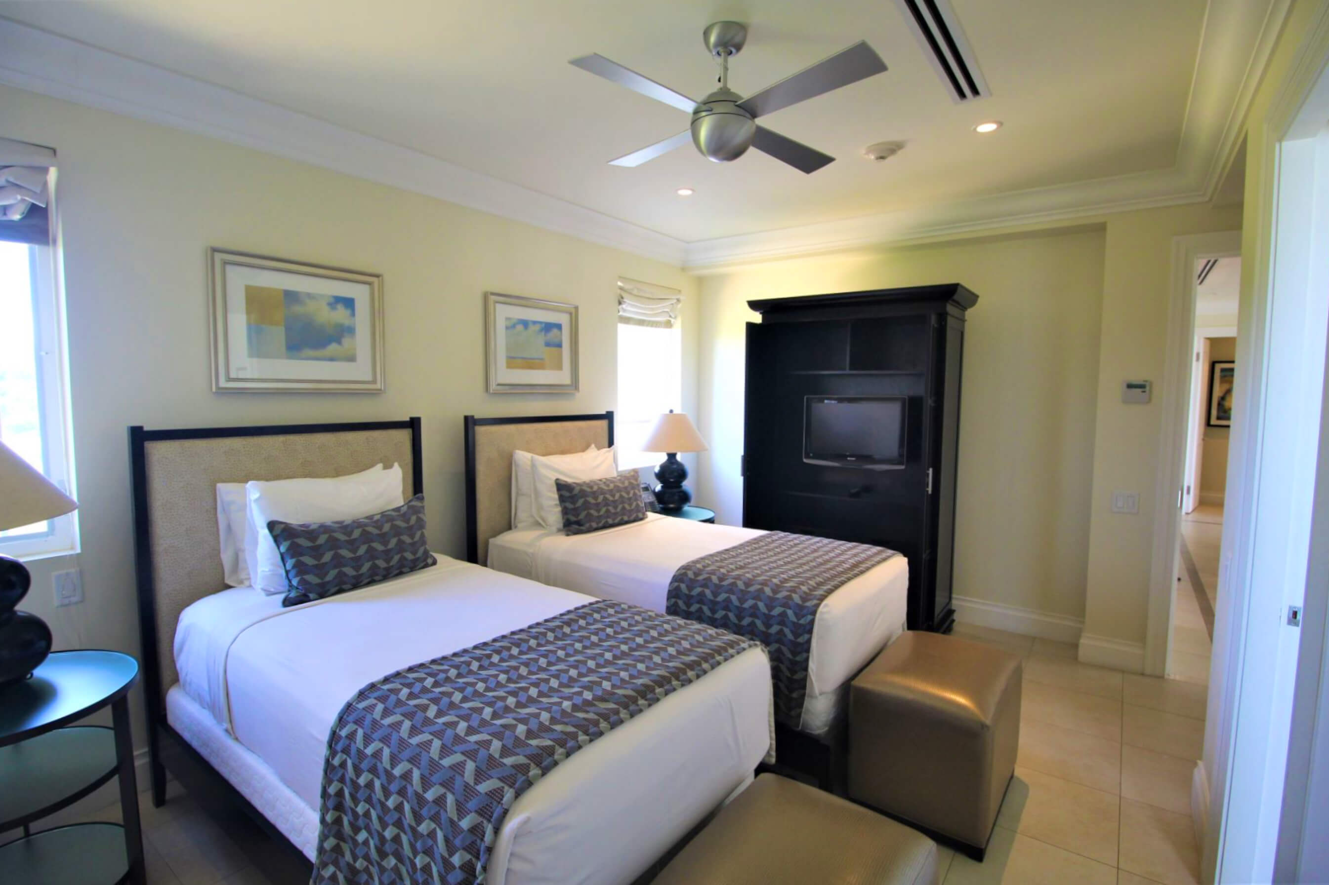 Twin beds, flat screen TV, ceiling fan, fitted cupboards, ensuite shower room.