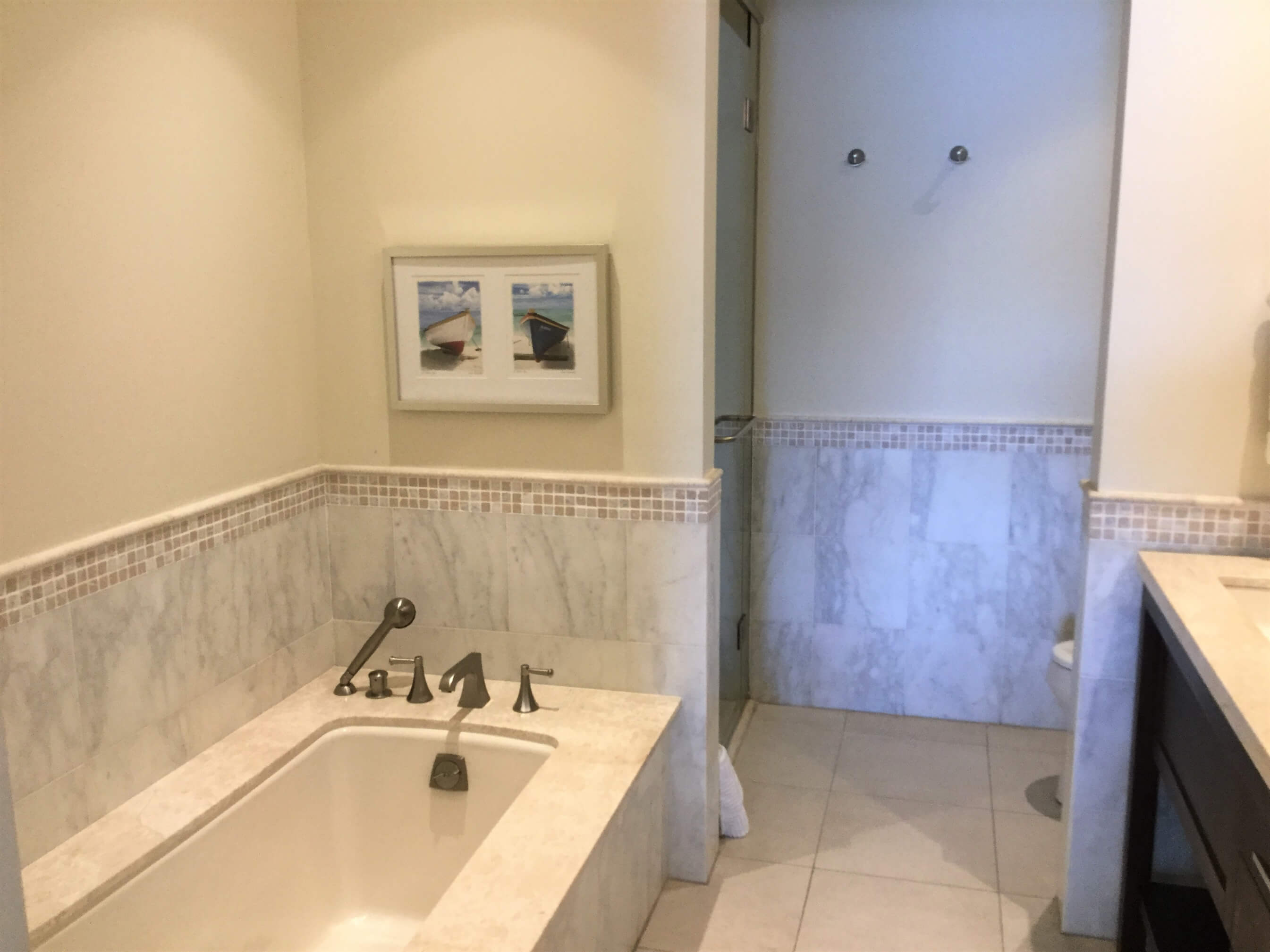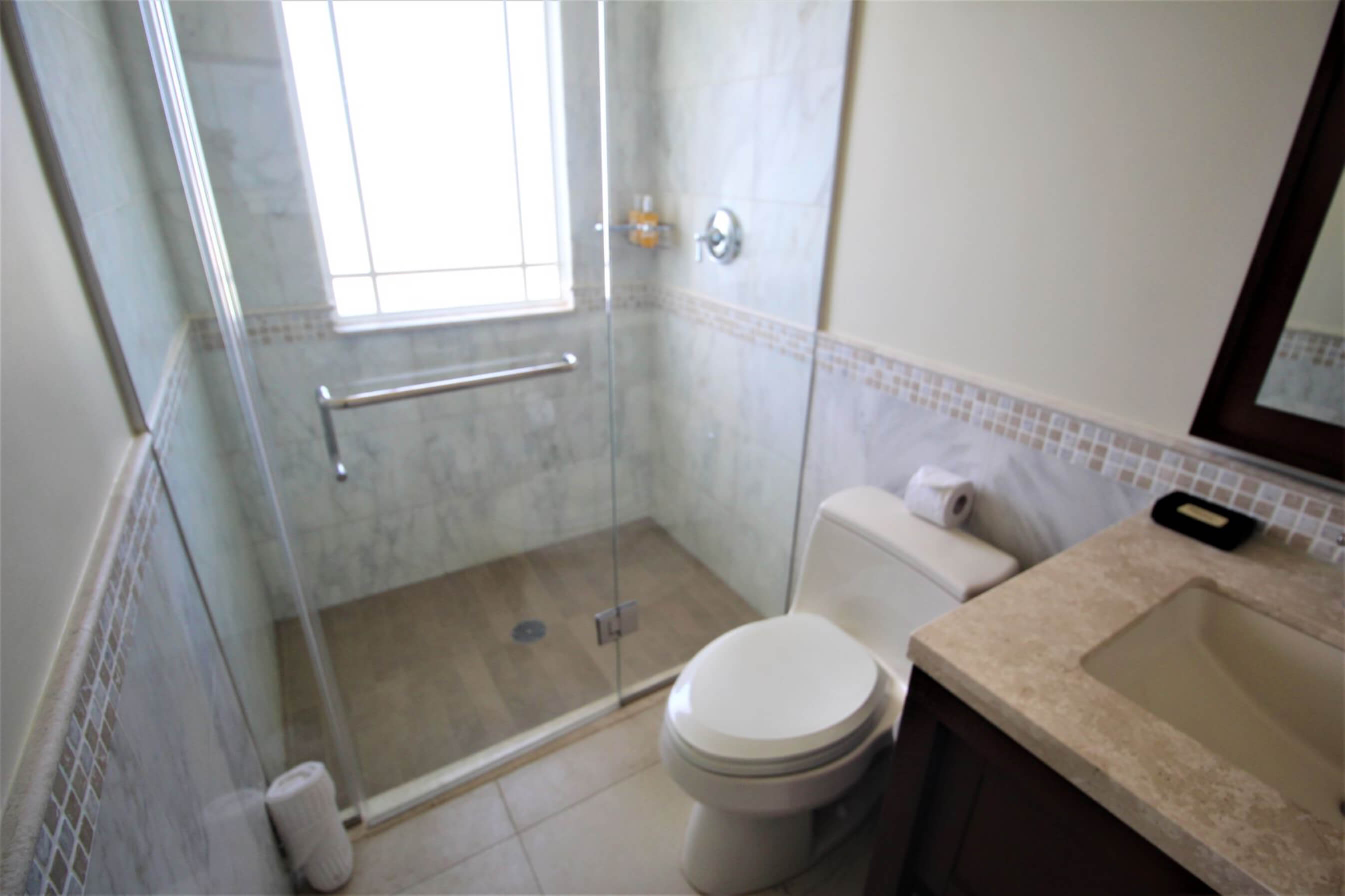 Large separate shower cubicle, bathtub, twin sinks, w.c. granite surfaces and tiled walls.
