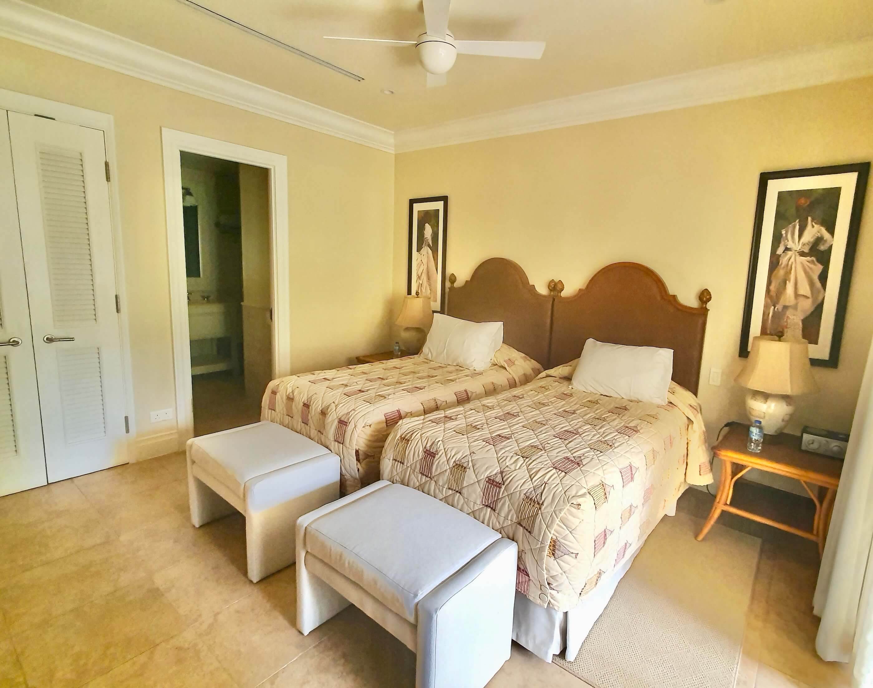 Guest Ensuite Bedroom: twin beds, sliding doors onto the front entrance terrace. Fitted wardrobes and ensuite shower room with w.c and w.b.