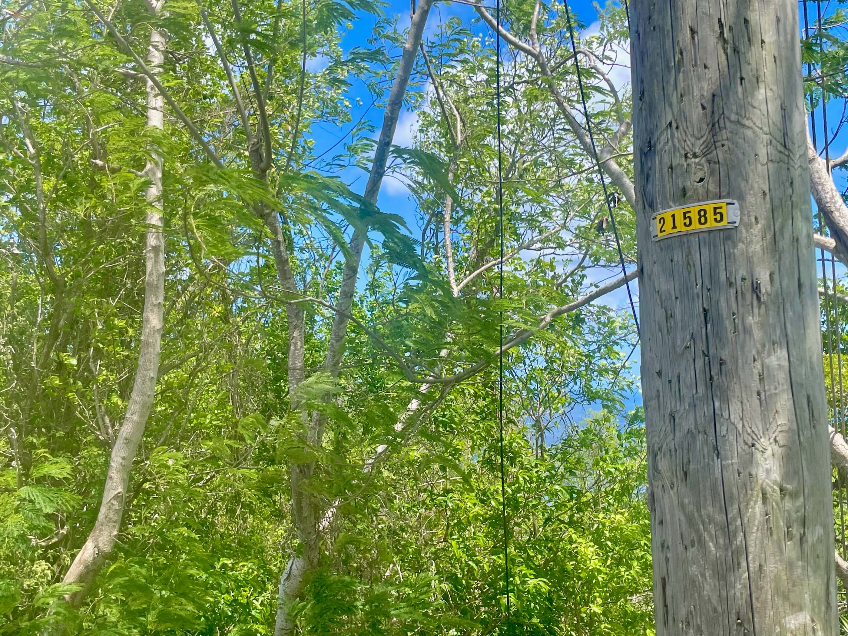Access: From Sugar Hill crossroads heading toward the harbour, take the left uphill road. After the first flat area, the plot sits on the right as the slope rises again — marked from electricity pole no. 21585 and extending uphill approximately 95 ft to a metal stake at the start of a concrete parking area.