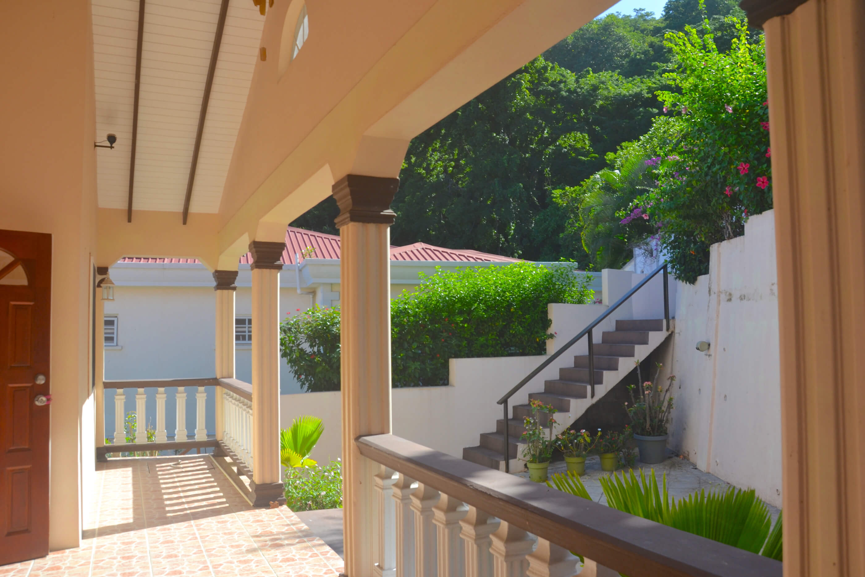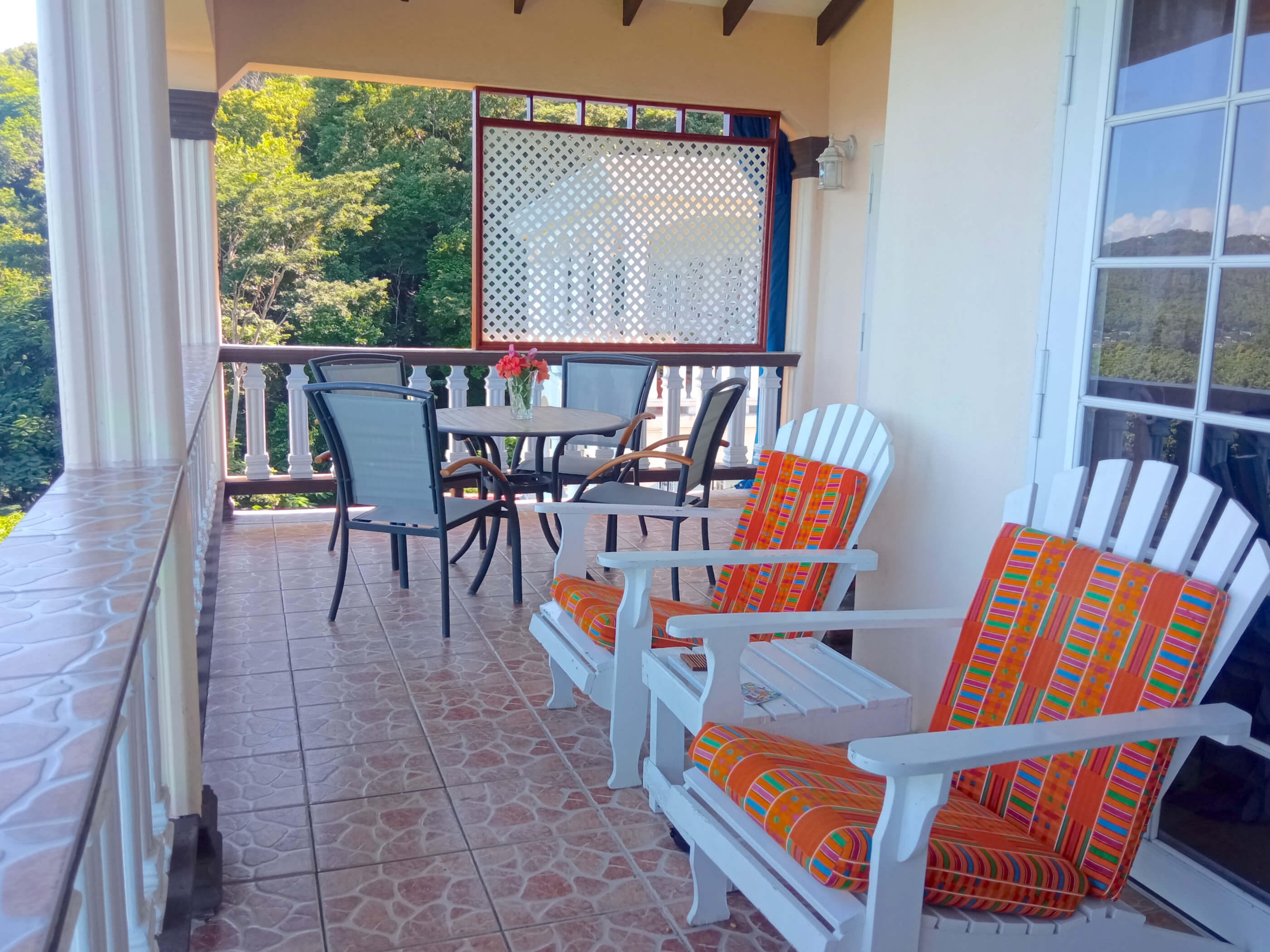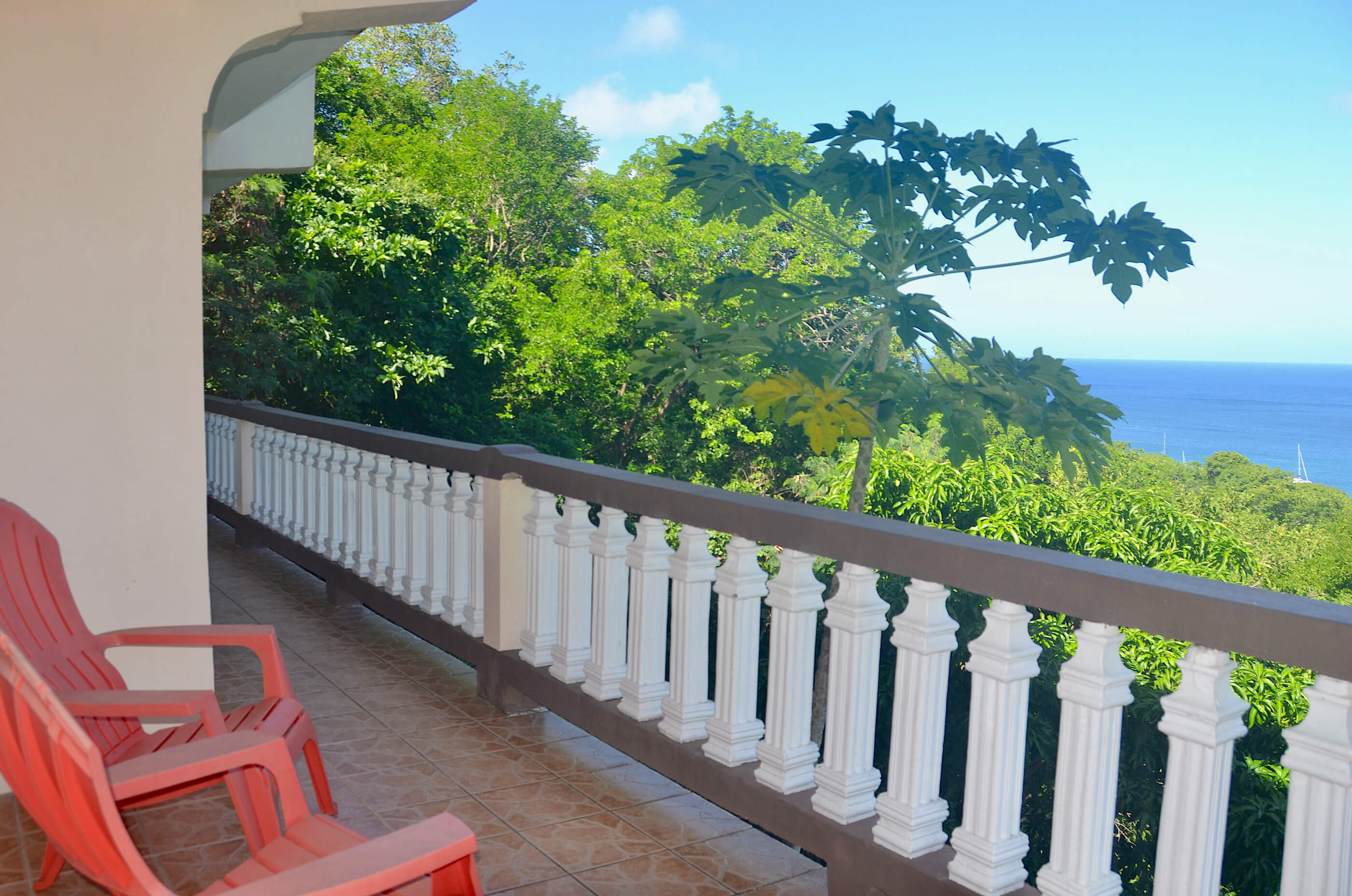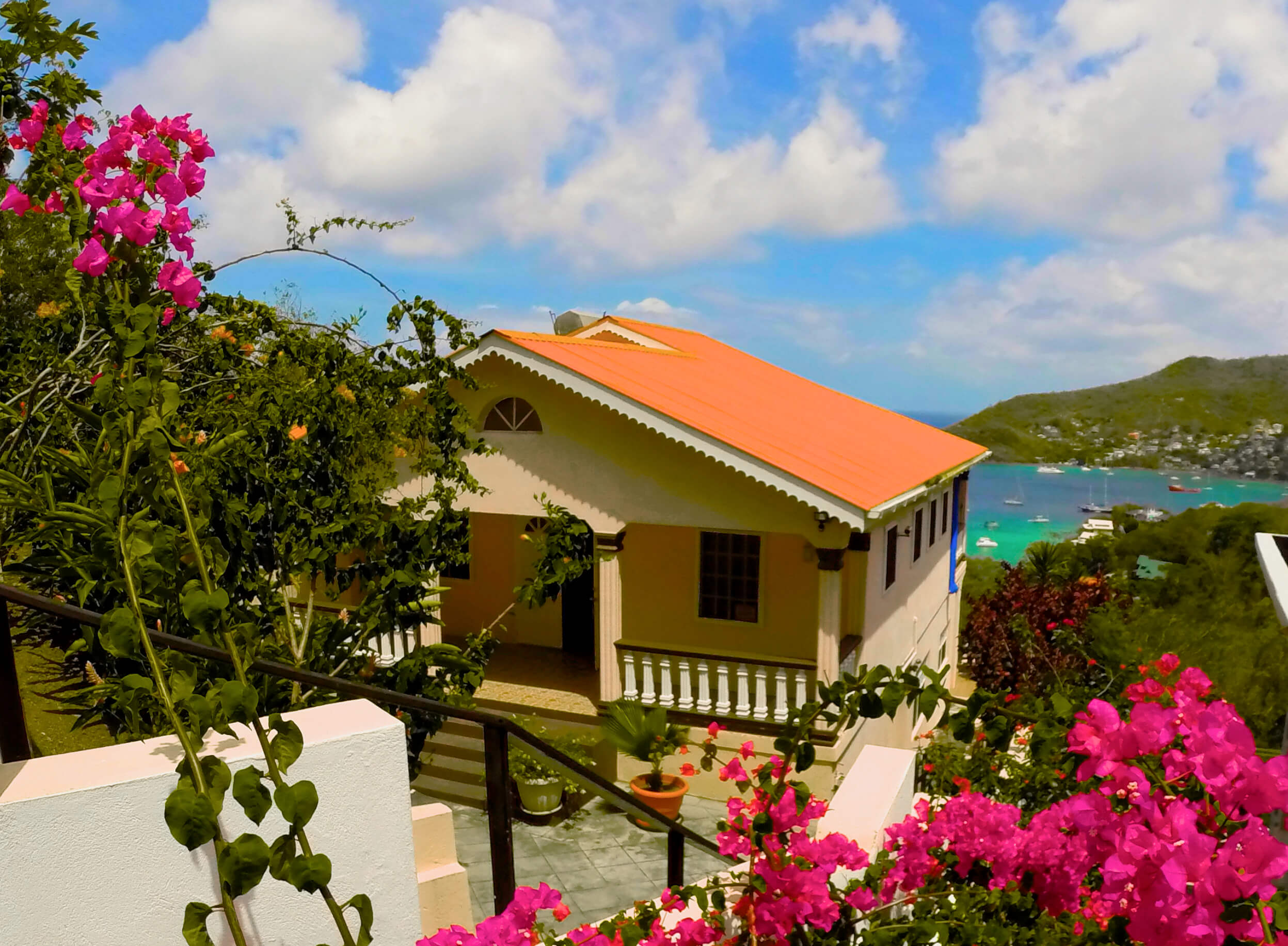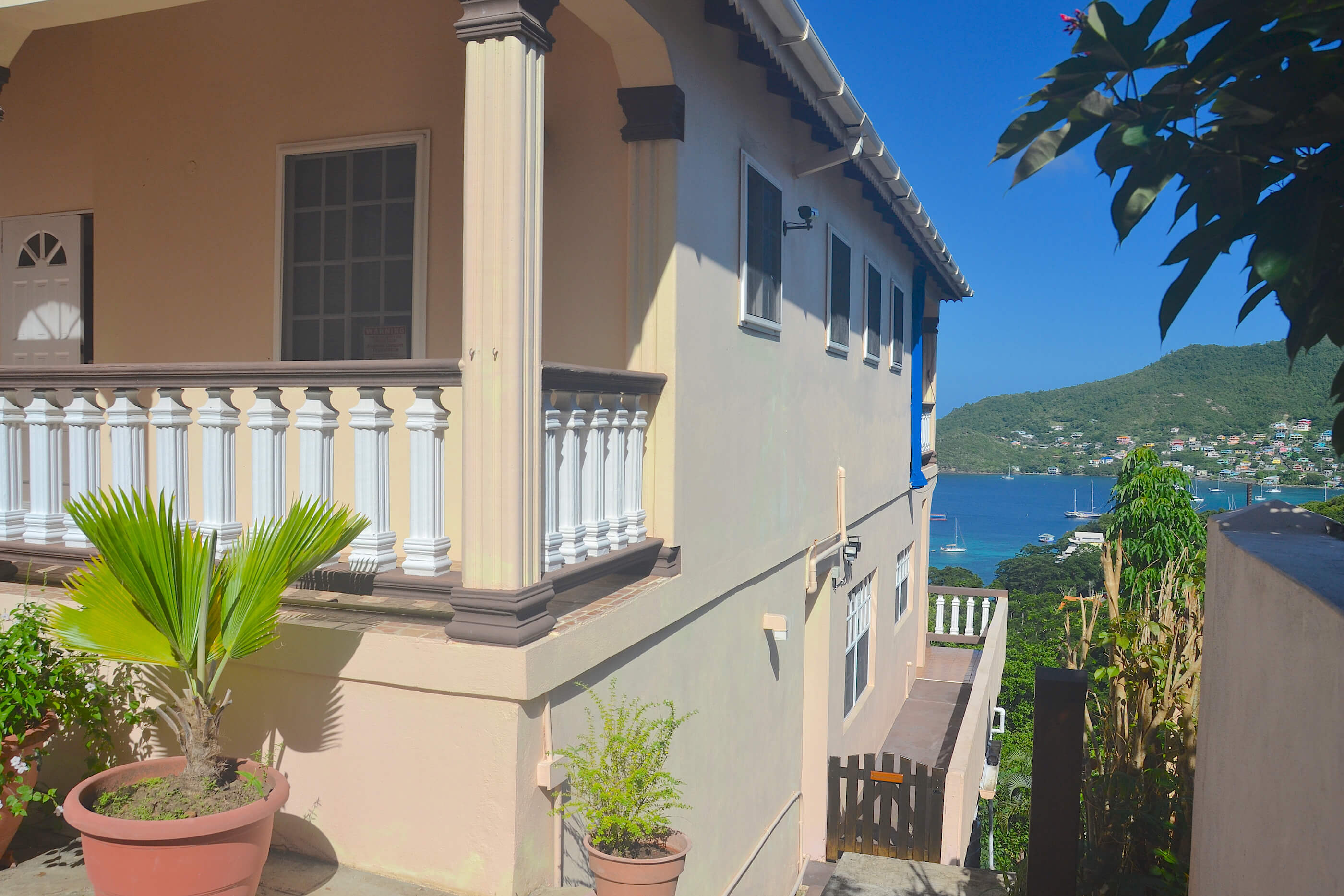 The house is of a locally built style with high, wooden beamed ceilings and wooden gingerbread fretwork. A generous terrace balcony overlooks Admiralty Bay with fantastic views.
