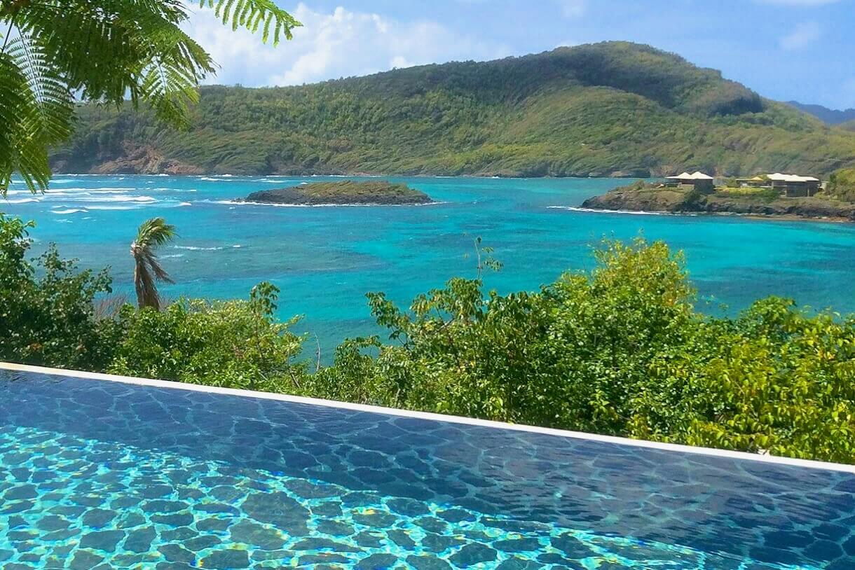 - Fascinating views across Crescent Bay, Crown Point, Spring Point to the south and the islands of Baliceaux & Battowia to the east. }
