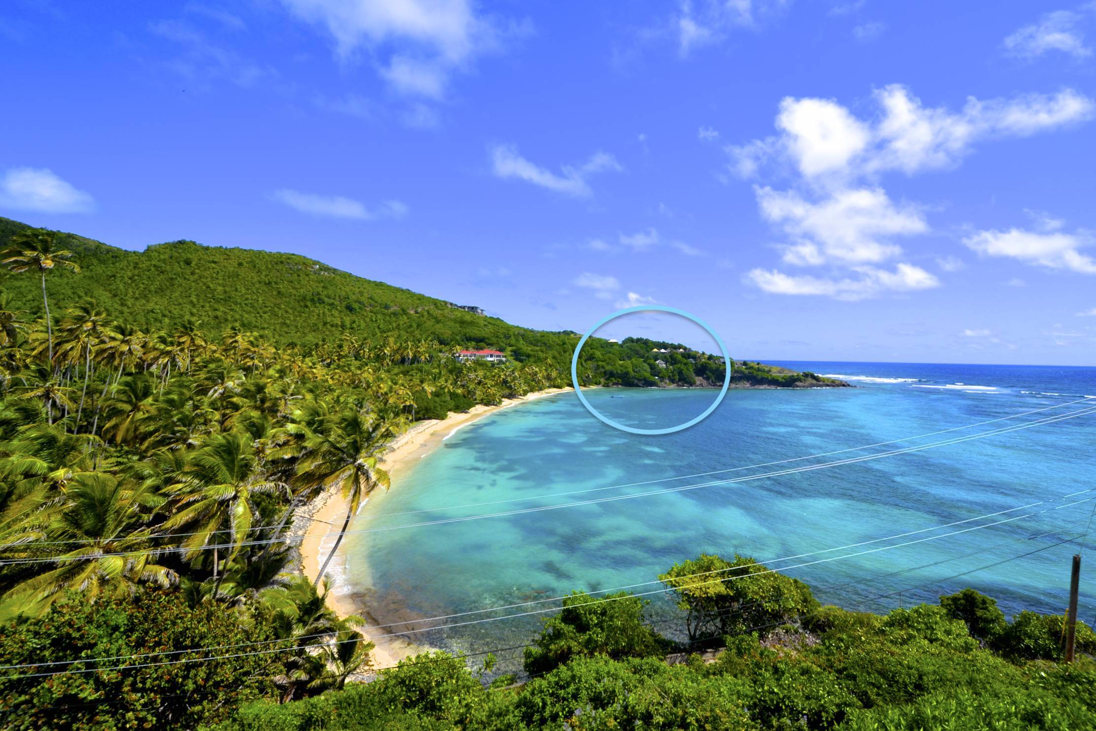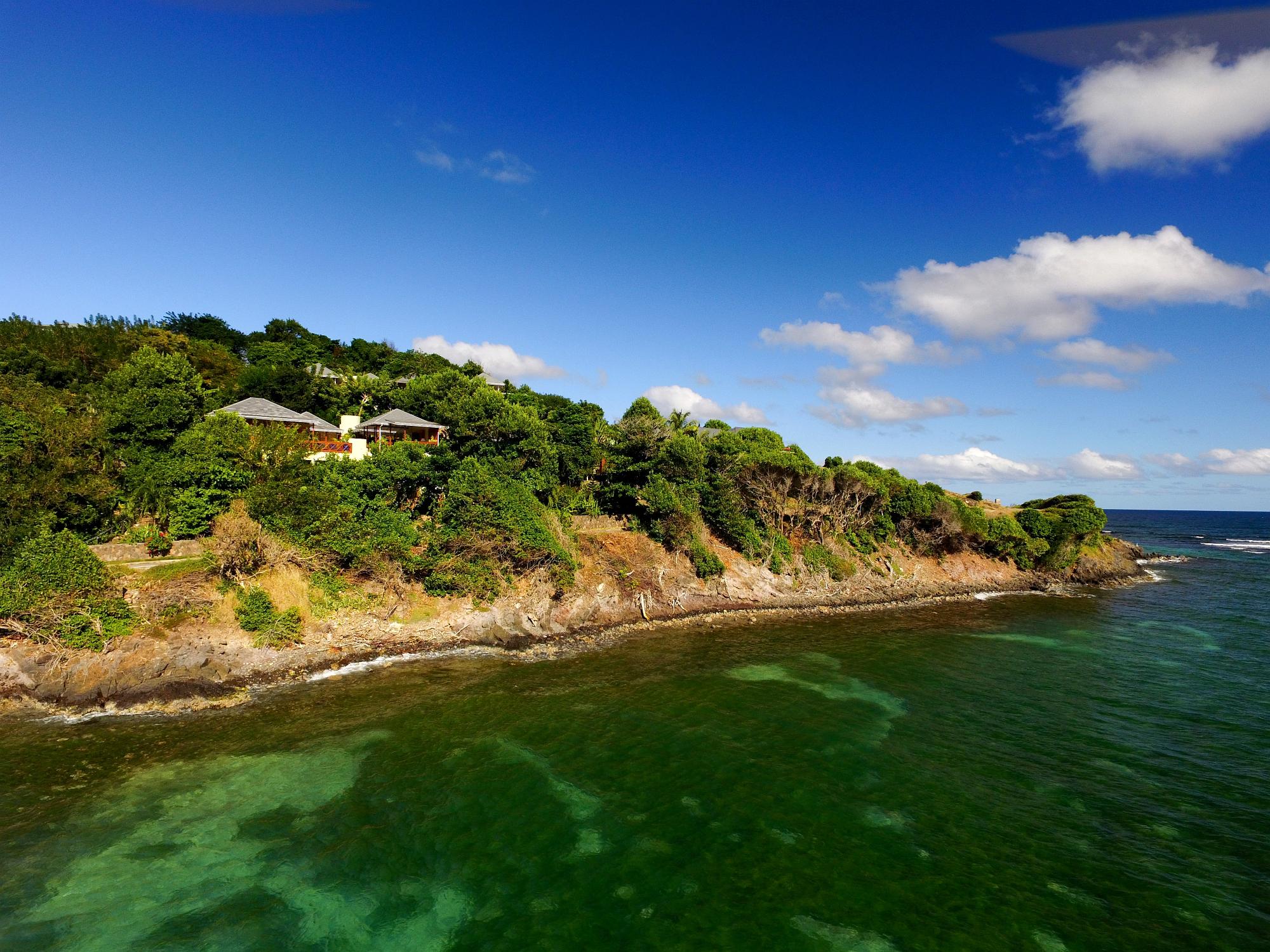 - Fascinating views across Crescent Bay, Crown Point, Spring Point to the south and the islands of Baliceaux & Battowia to the east. }