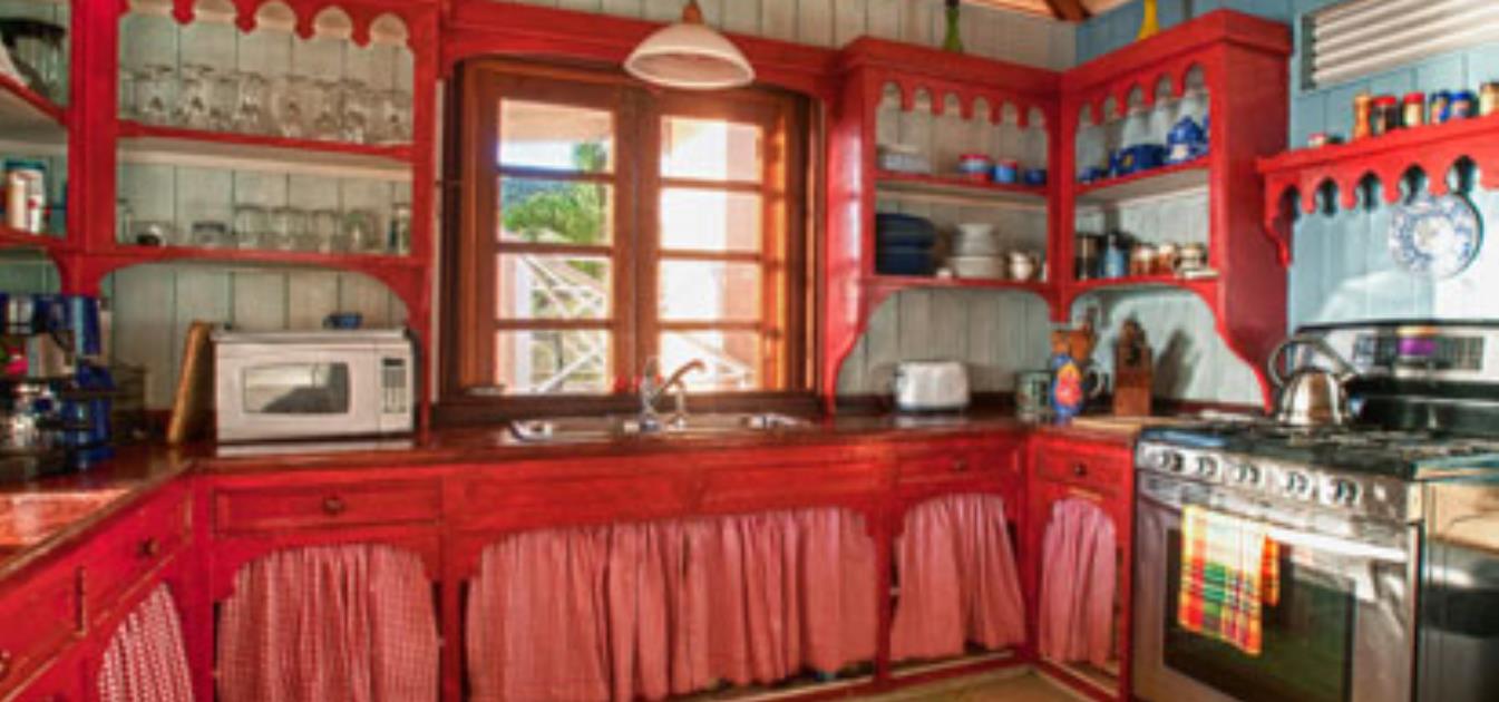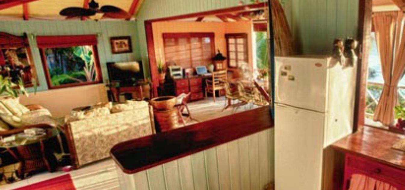 A broad open plan living and dining space includes a well-equipped kitchen with a banquet table positioned overlooking the bay, seating up to 10 guests. The windows and doors are wide and surround the living area and well appointed kitchen which open onto the exterior decking allowing guests to enjoy an excellent outdoor BBQ and dining area.The living space has been decorated in a traditional caribbean style using cool, natural colours and a simple decor that maintains an uncluttered and peaceful atmosphere. The wood used throughout this residence lends a warmth and natural connection to the tropical vegetation that surrounds the villa.