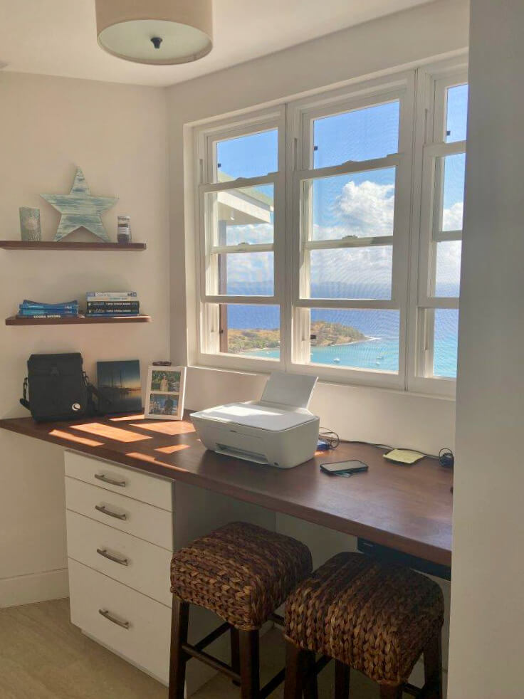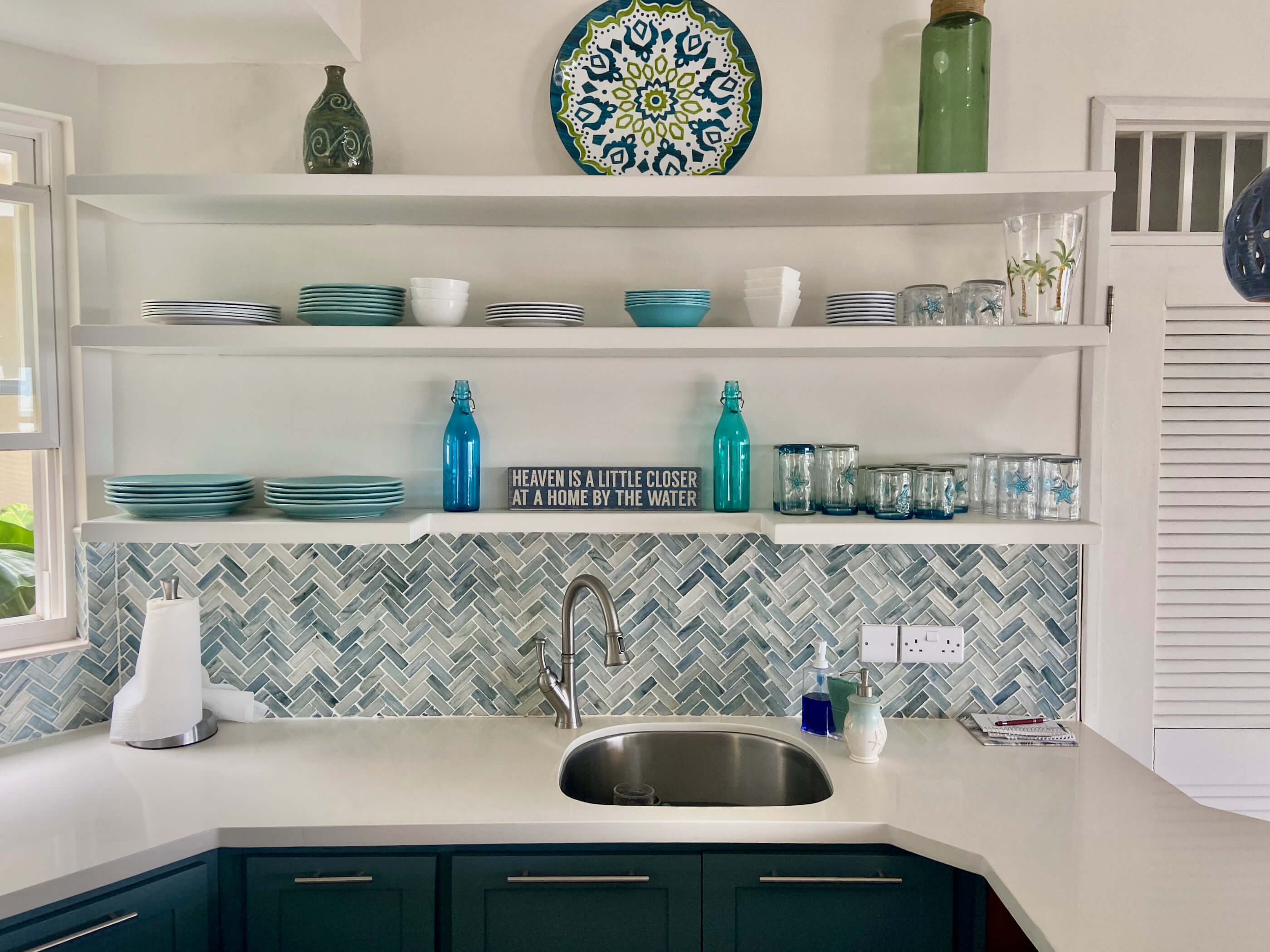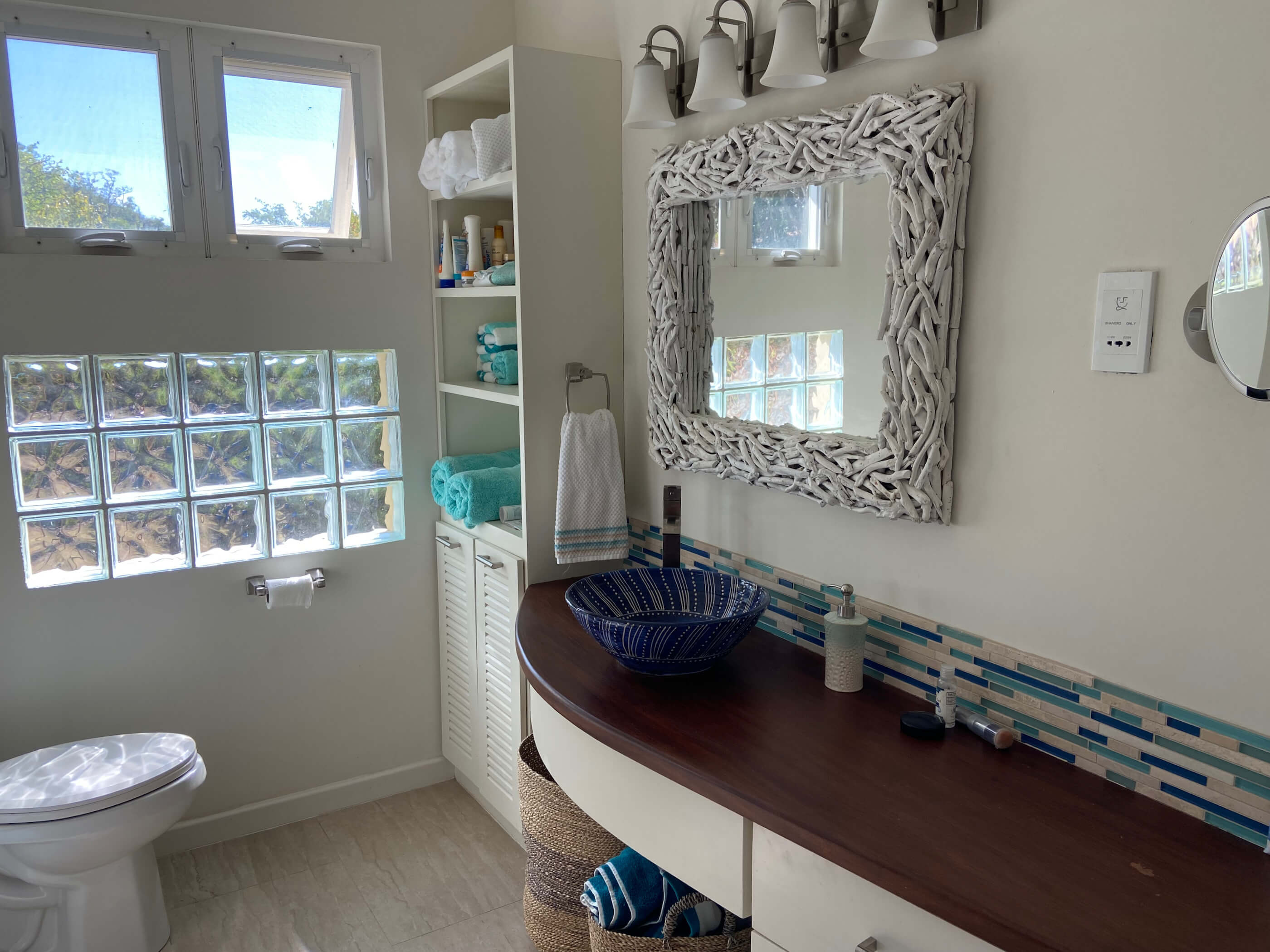 The three bedroom, three and one-half bath home has an inviting open floor plan perfectly proportioned with plenty of space for entertaining in the Great Room, and on the outdoor covered veranda and pool patio. The home was thoughtfully designed with all floor tiles and accent tiles imported in beautiful, soothing shades of blues and greens. Pottery from Barbados and Bequia for outdoor and indoor sconces hanging pendants, and bathroom sinks brighten the décor.