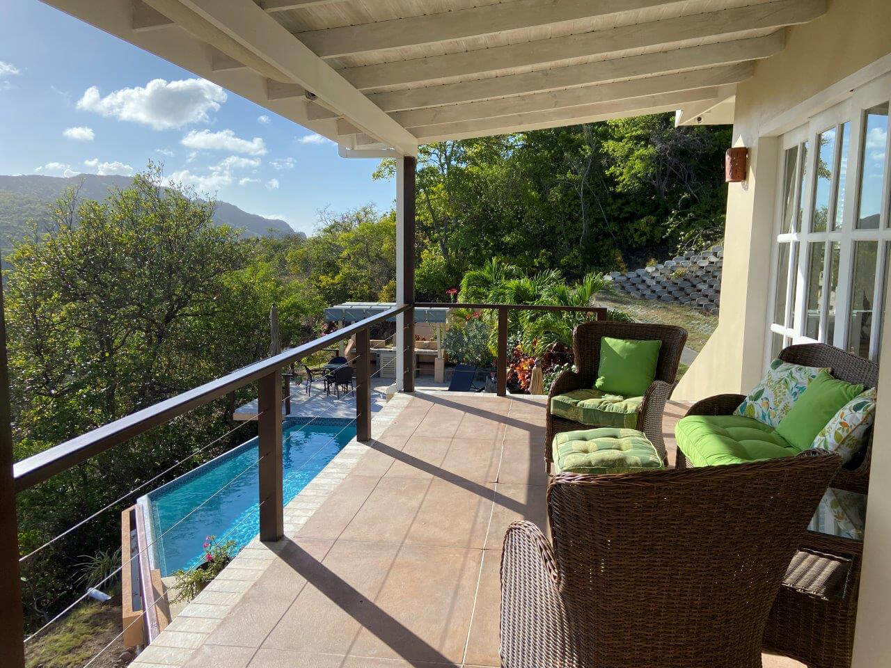 The covered balcony with coloured concrete has a custom-built dining table to seat six and lovely all-weather, cushioned furniture. A staircase leads to the pool and lower level.