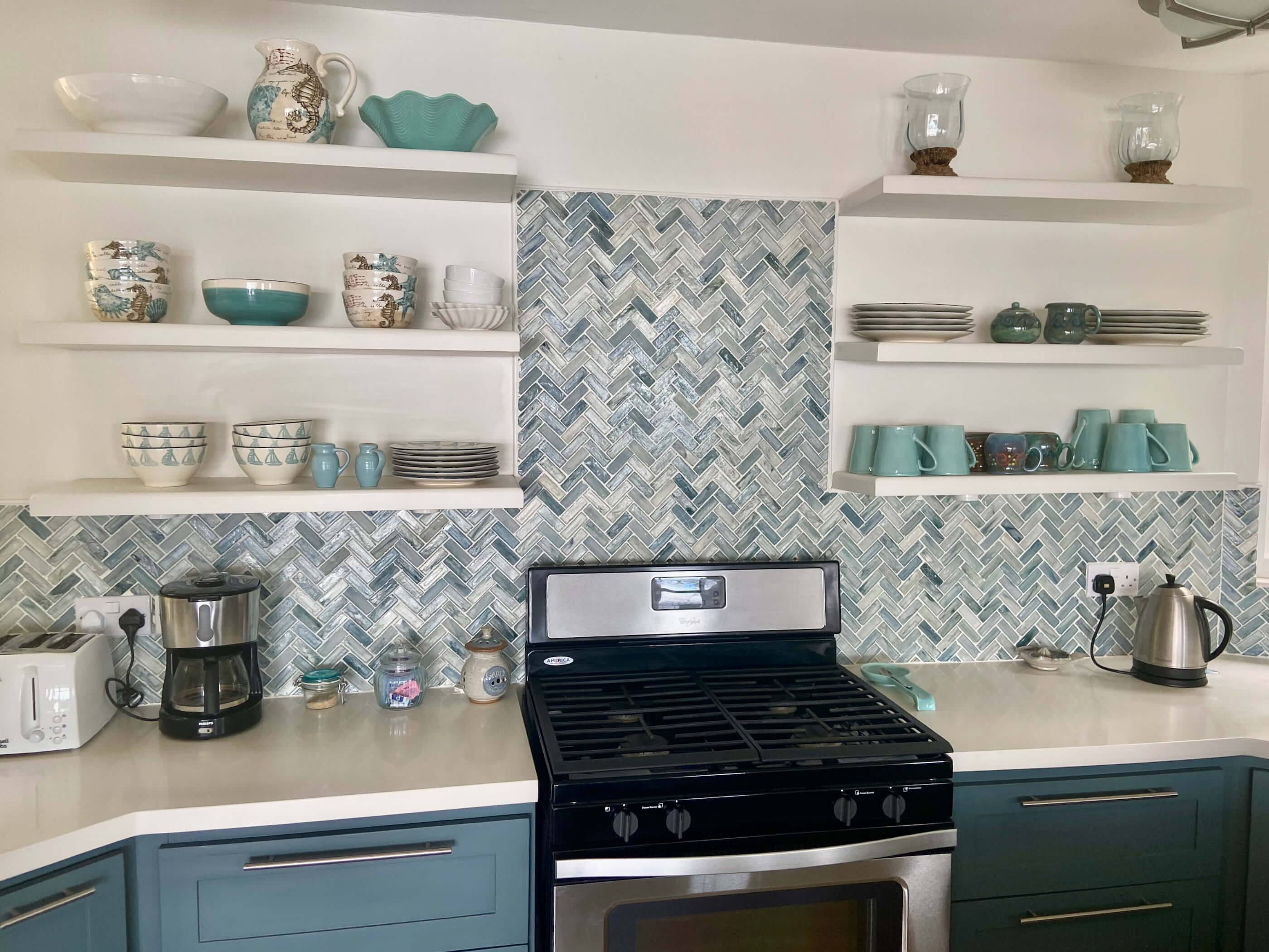 The kitchen is equipped with a Whirlpool stainless French-door refrigerator, gas cooktop/oven and microwave. Spacious lower cabinets, white quartz counters and beautiful herringbone mosaic tile backsplash in shades of blue with open upper shelving make the area light and open. Step-out the large, 8-foot tall, mahogany wood pivot door to the back of the home to a gas grill on a custom-built wood stand for outdoor grilling. There is a laundry room outfitted with shelving, cabinet, sink, washer and dryer.