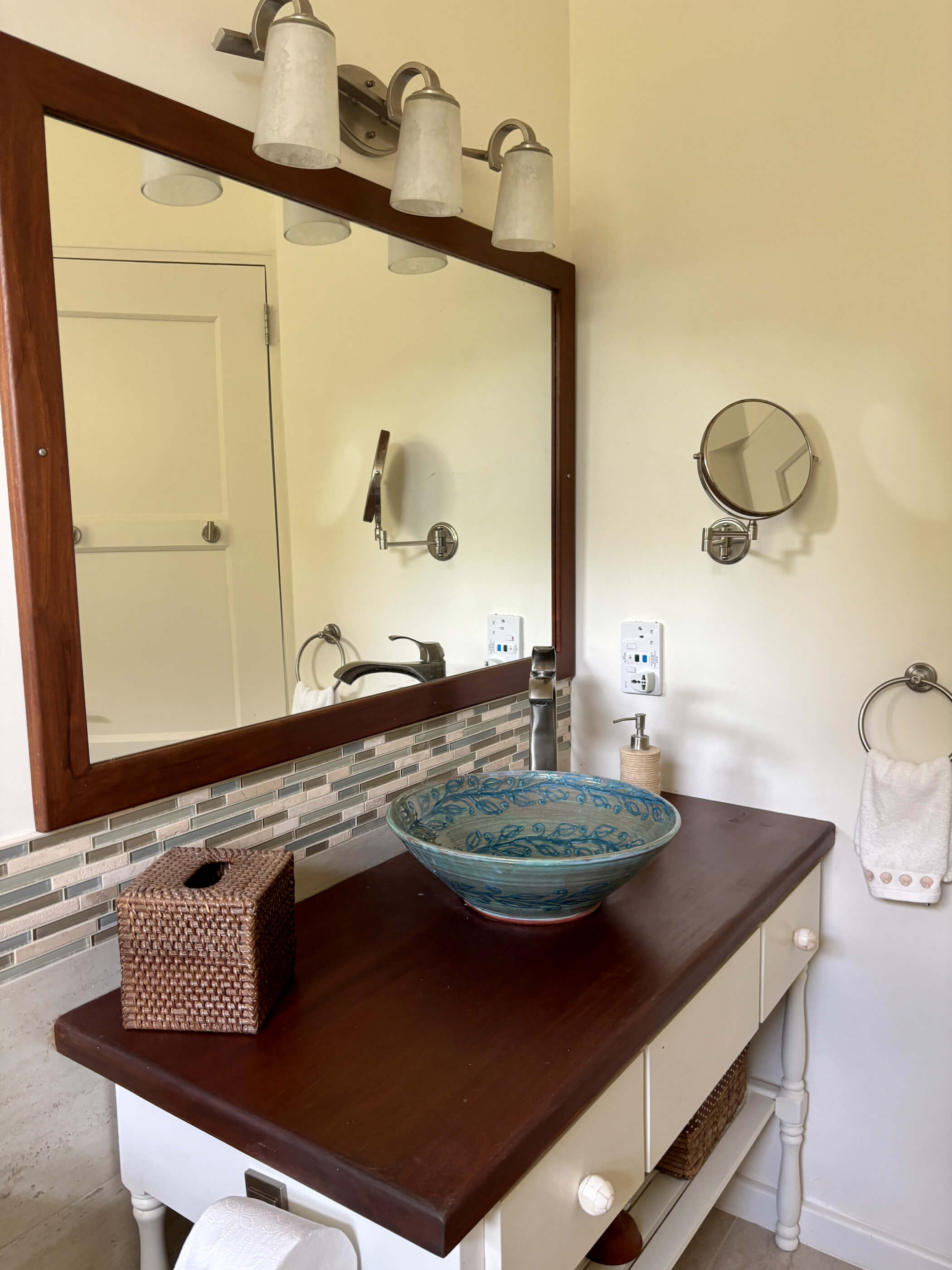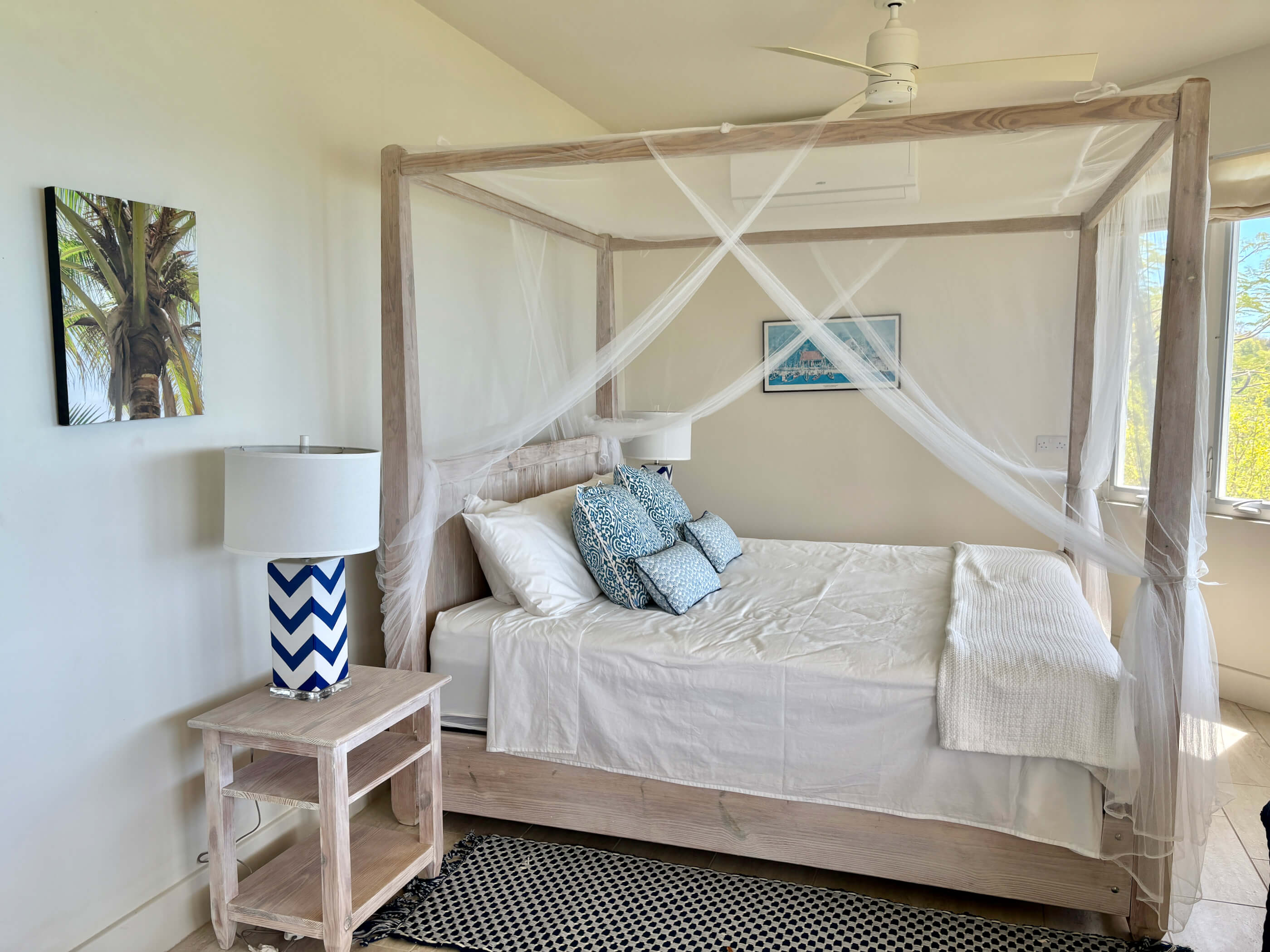 The owner’s suite enjoys a 14-foot-high ceiling, ceiling fan and A/C. The room has an 11-foot three-panelled sliding door opening to its own private balcony to enjoy that late evening aperitif before retiring. The room has a an expertly crafted, pickled wood, King-size, four poster bed. A large six-drawer dresser and bedside table complete the room. The ensuite bathroom is light and airy with a glass-covered open shower and ceiling fan. A closet and shelving complete the bath area.