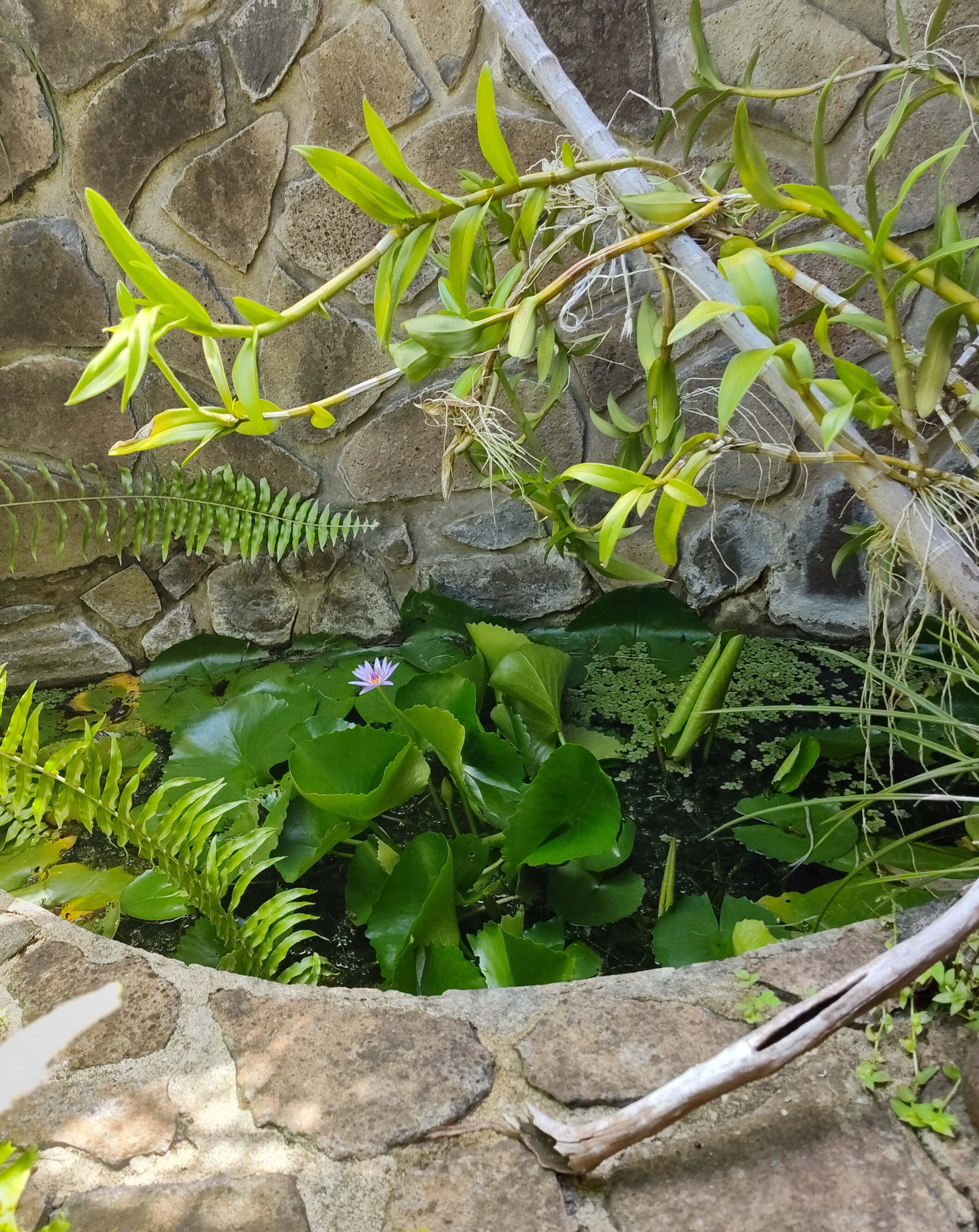 Building two contains the master bedroom, with en suite open air bathroom with circular stone shower, and private small garden with lily pond surrounded by a circular stonewall.