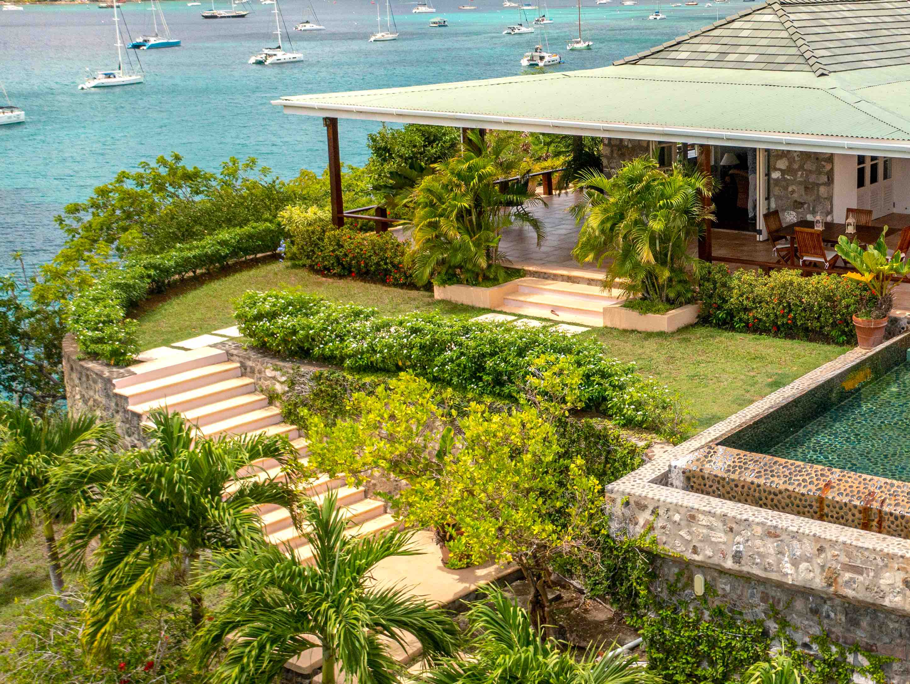 With the entire island to choose from this villa was positioned to capture the best possible bay and harbour views, and it does - the views are facinating and beautiful sweeping across the whole of Admiralty Bay Lower Bay beach, Princess Margaret Beach and also of the setting sun in the west.
