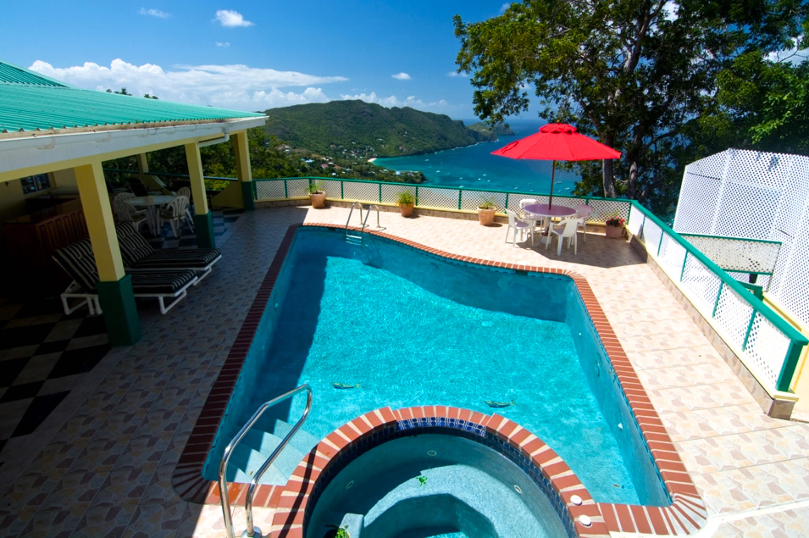 Allamanda boasts its own private Curvaceous pool with the addition of a therapeutic jacuzzi conveniently positioned close to the exterior bar and patio area enjoying great views down to Lower Bay Beach. This large poolside area, tiled in cool stone, is furnished with comfortable sun loungers and has several terracotta pots planted with decorative tropical flowering shrubs.