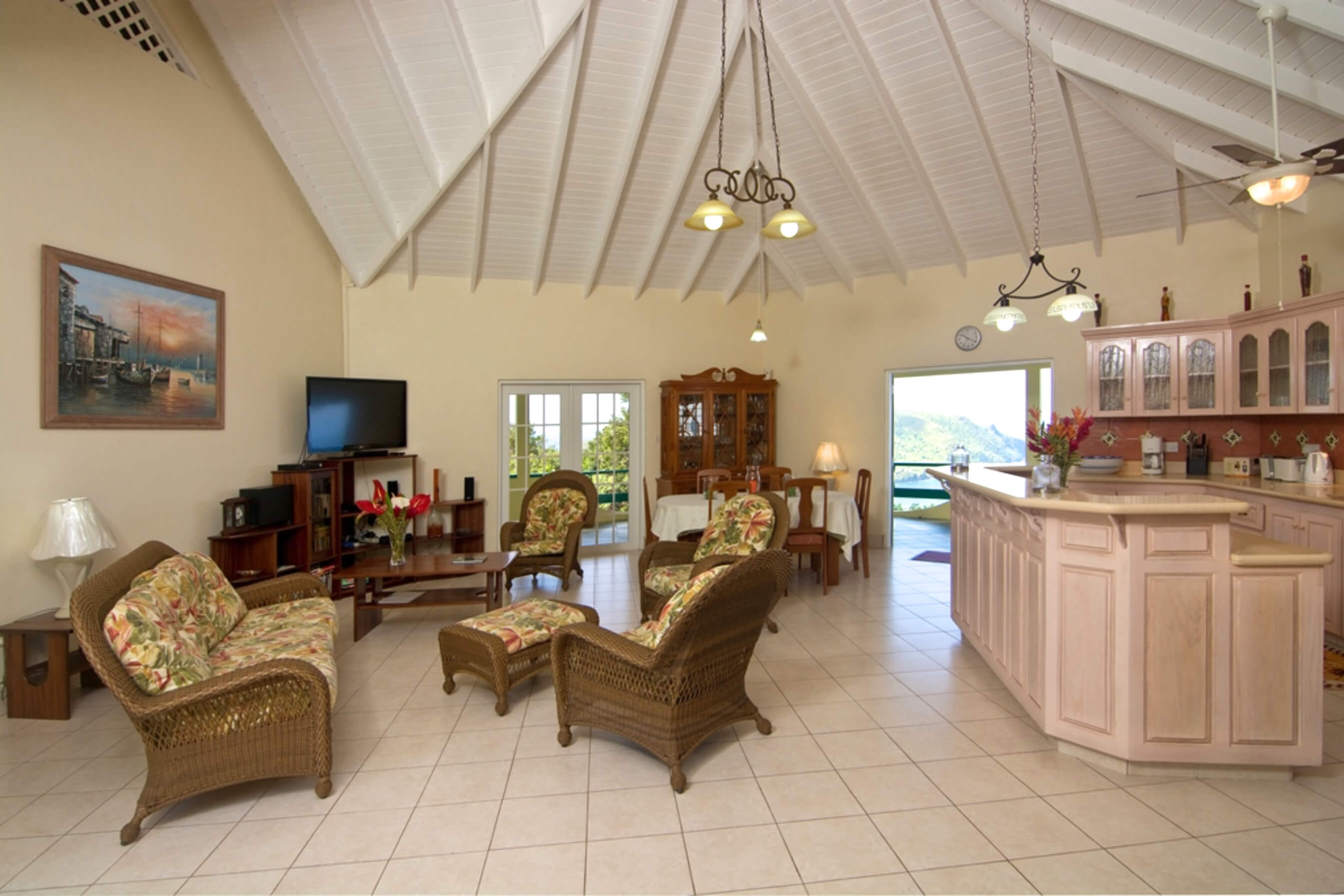 The open plan living room and recently refurbished kitchen both have tiled floors, ceiling fans and large french windows that welcome in the cooling tradewinds and offer delightful glimpses of the ocean and beaches beneath. With impressive vaulted ceilings painted in cool white and ivory and with a clean uncluttered style throughout this villa exudes peace and tranquility.