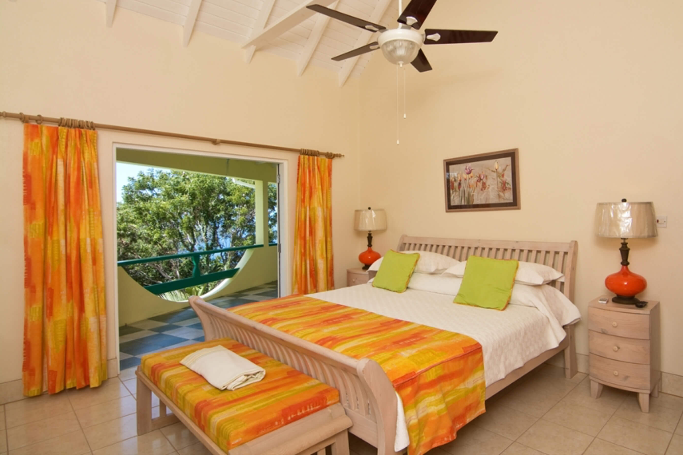 Allamanda Villa comfortably sleeps 6, with 3 king size bedrooms. One of the bedrooms also has a single bed making it ideal as a family guest room. This room with its own bathroom also has a separate seating area with cable TV and fridge. The other two bedrooms have en suite bathrooms and a private balcony each with superb views over Bequia.