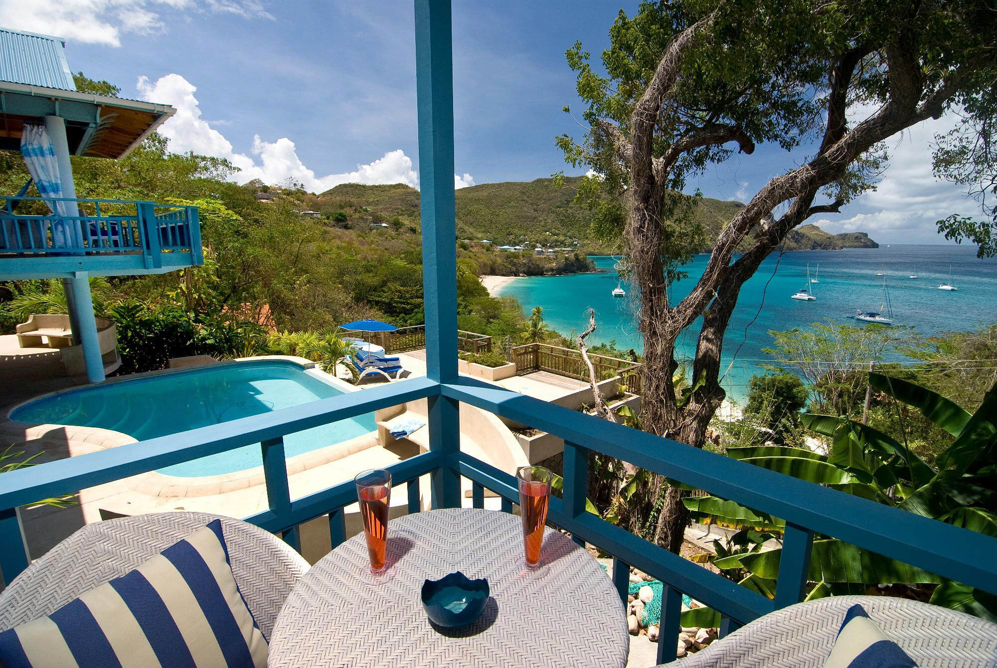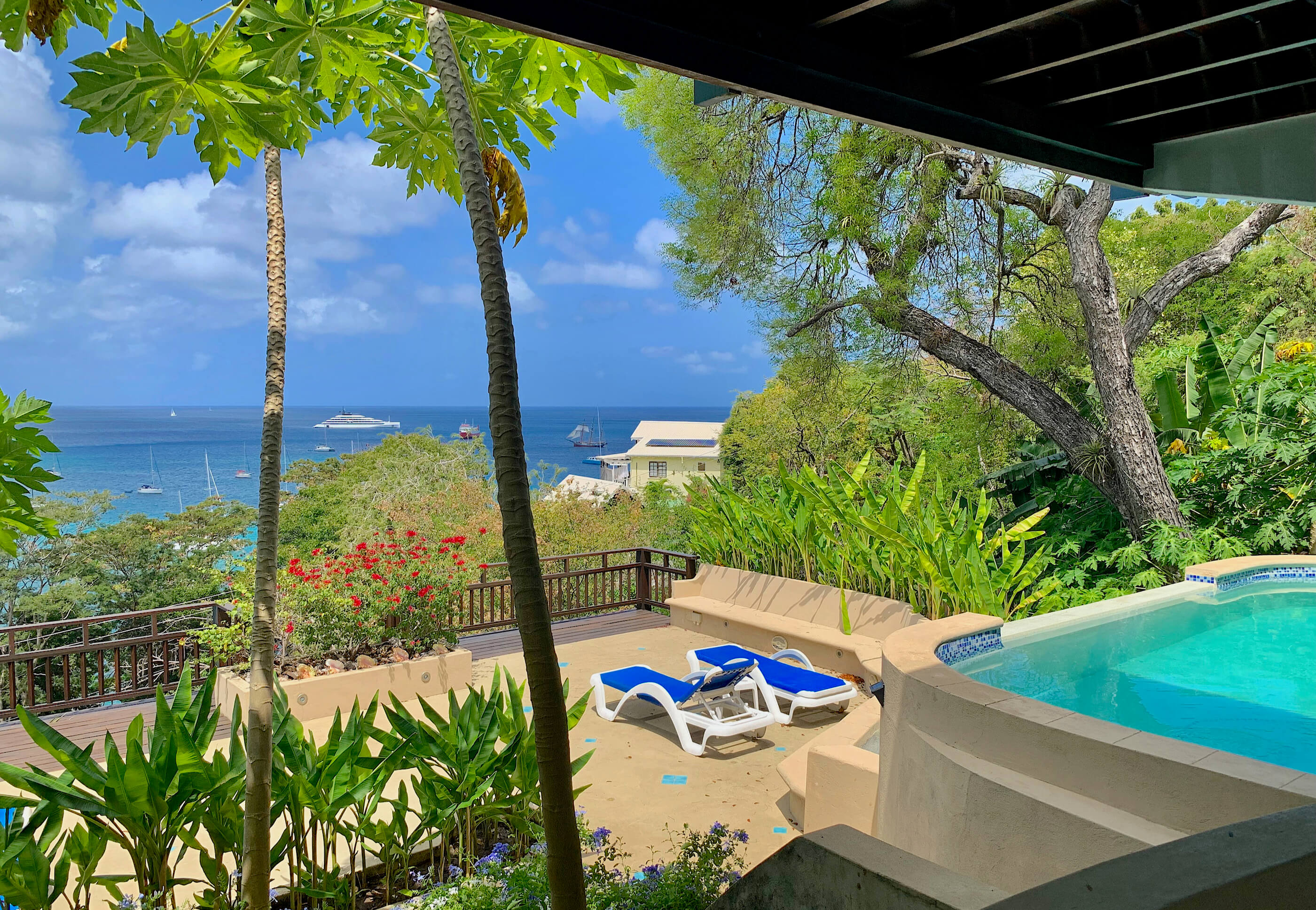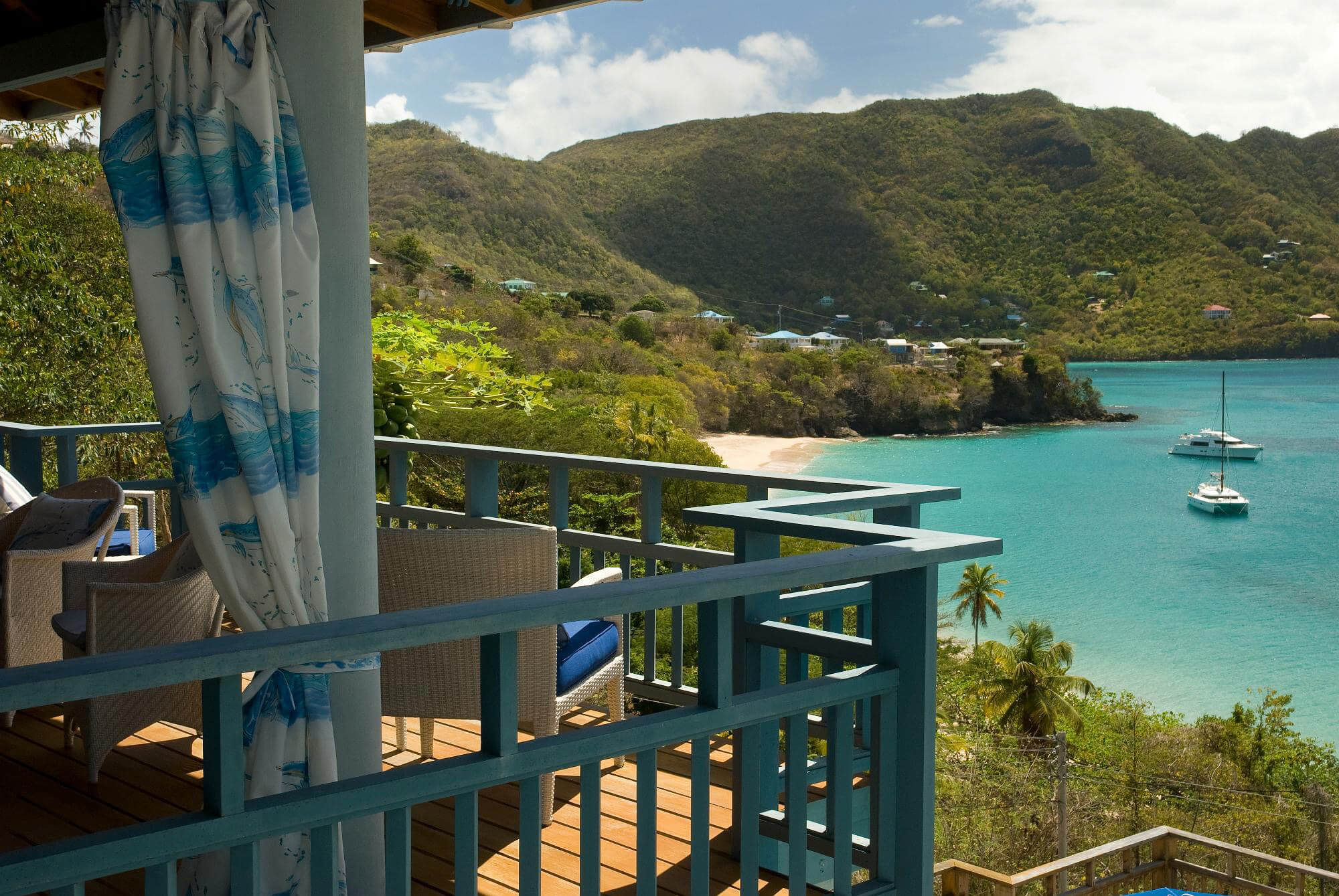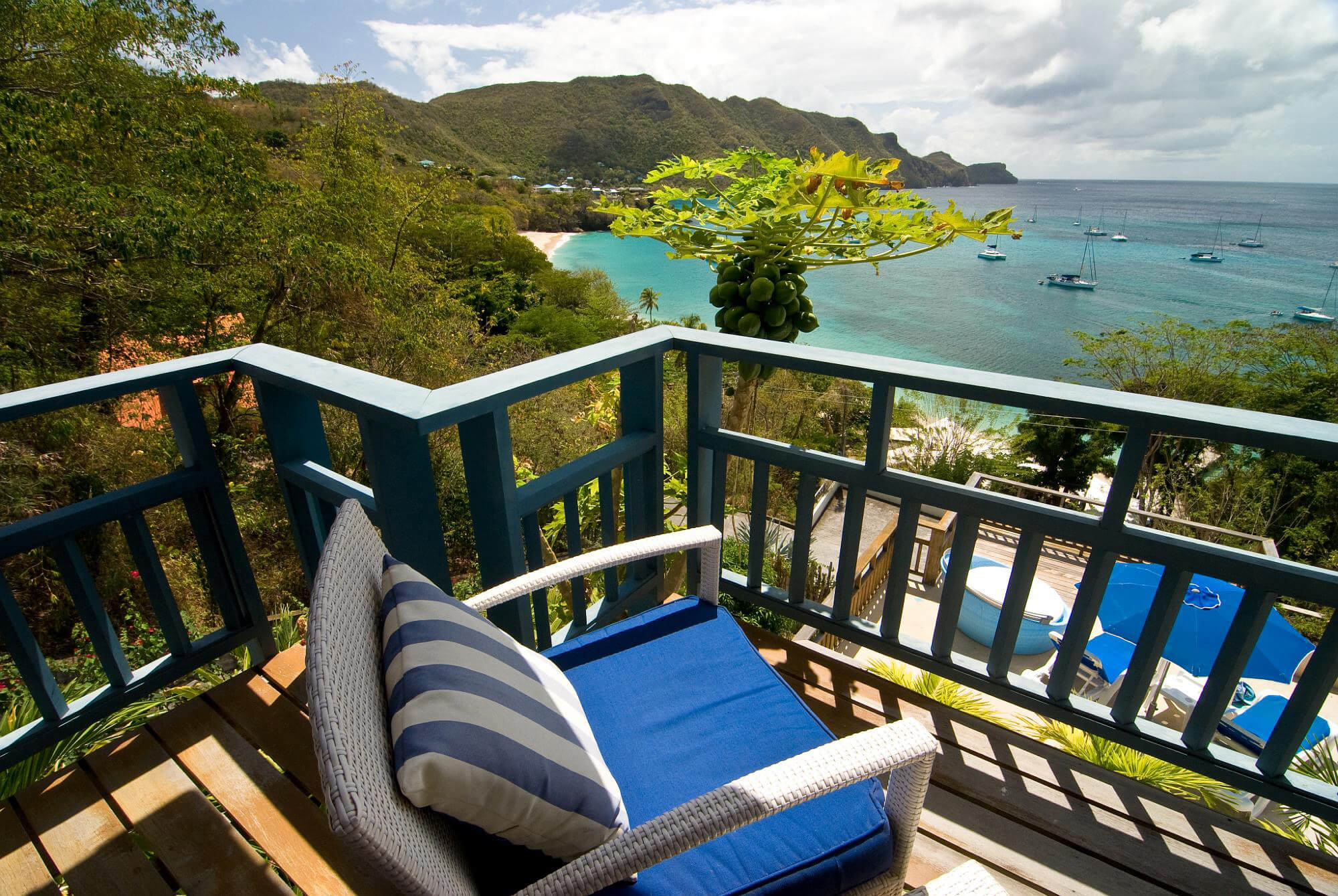 The double bedrooms each have their own private bathroom, consisting of a w.c. and a beautiful private outdoor shower open to the Caribbean sky. The main house bedrooms have their own private balconies, and the apartment bedrooms open out onto a shared balcony. All rooms enjoy lovely, expansive views of the beach and Admiralty Bay, and face west to enjoy the glorious sunsets. All bedrooms (and the fitness suite) have