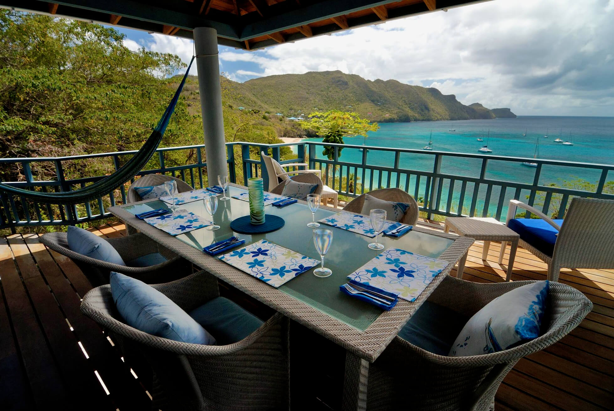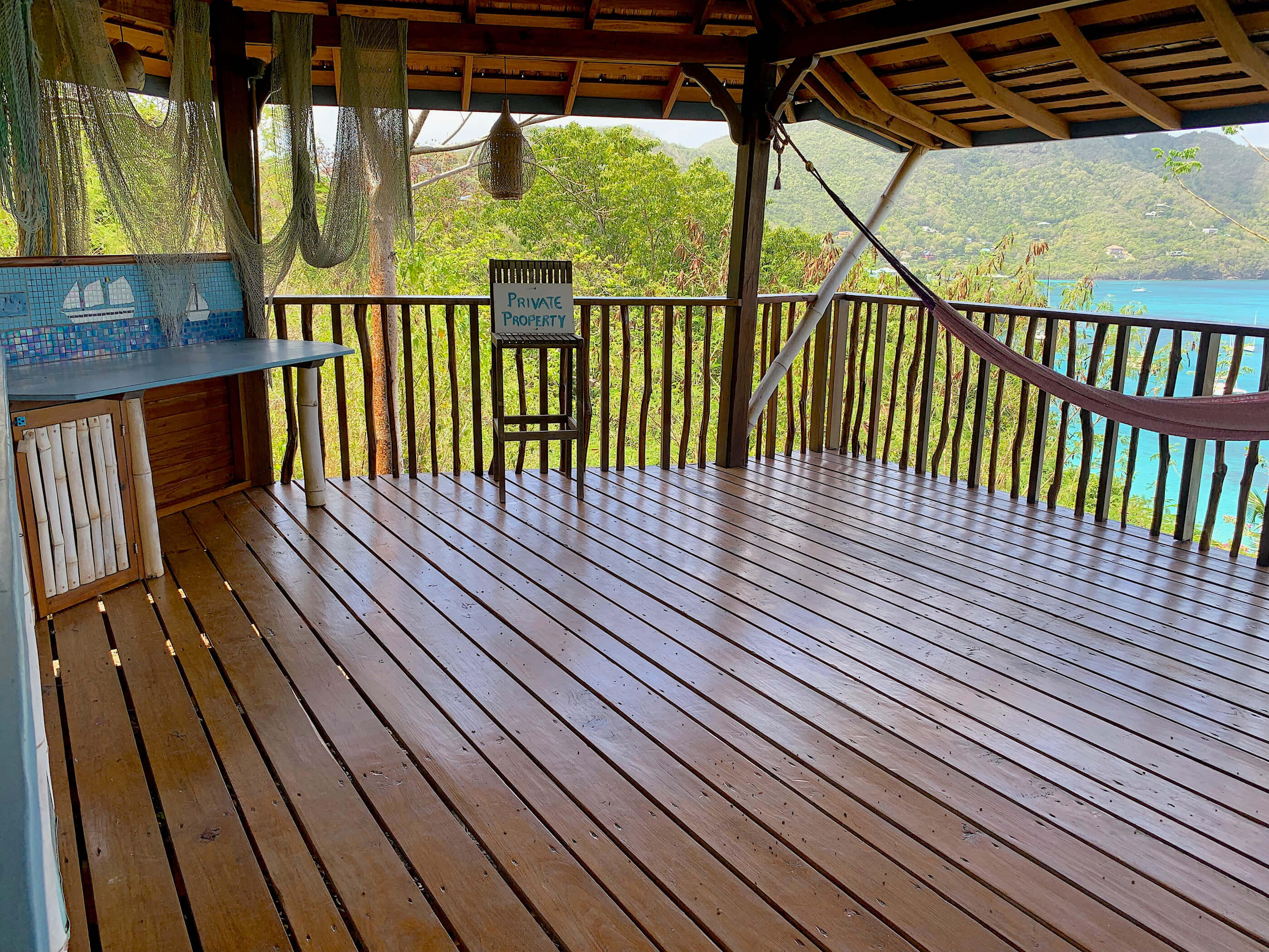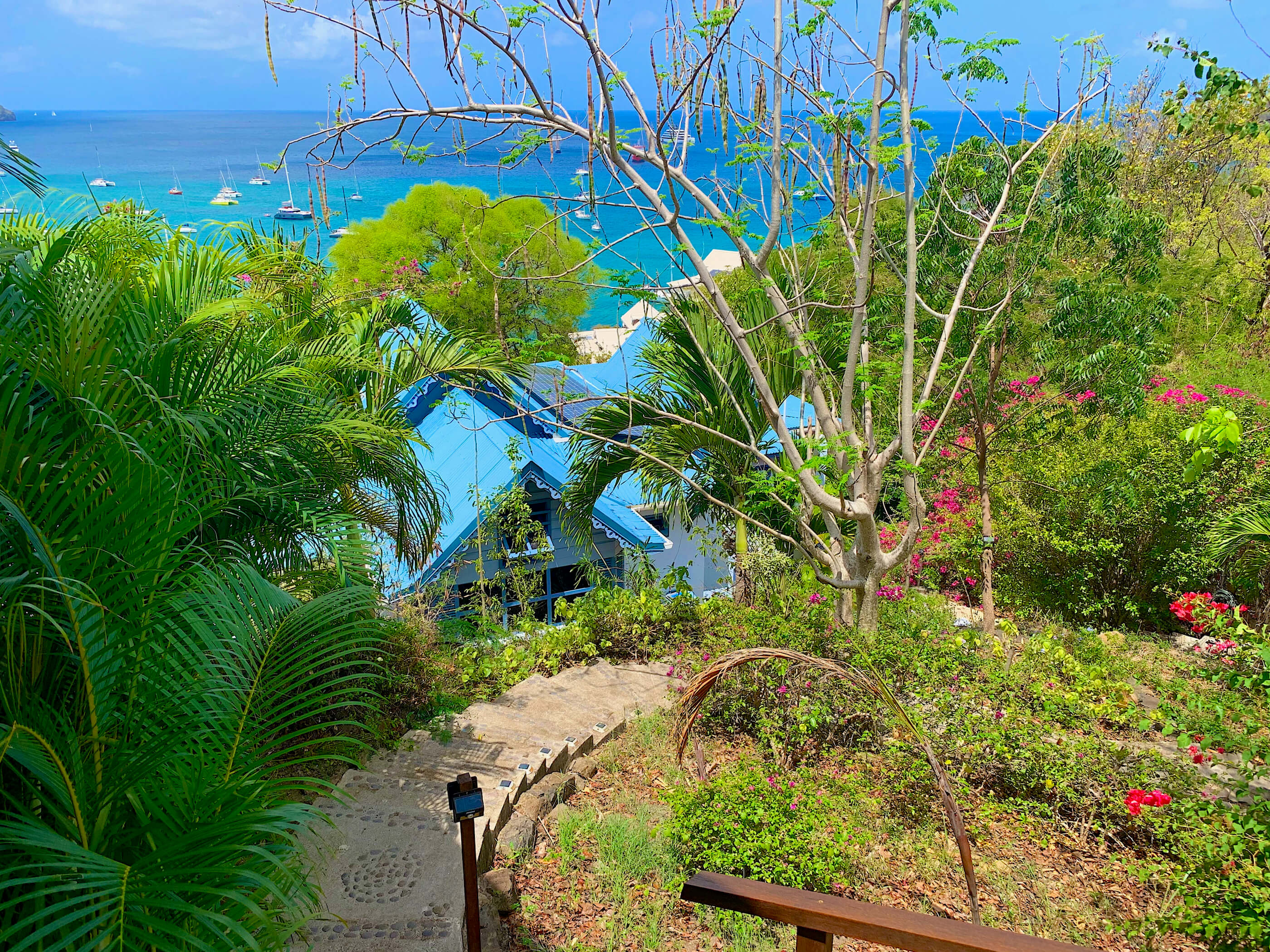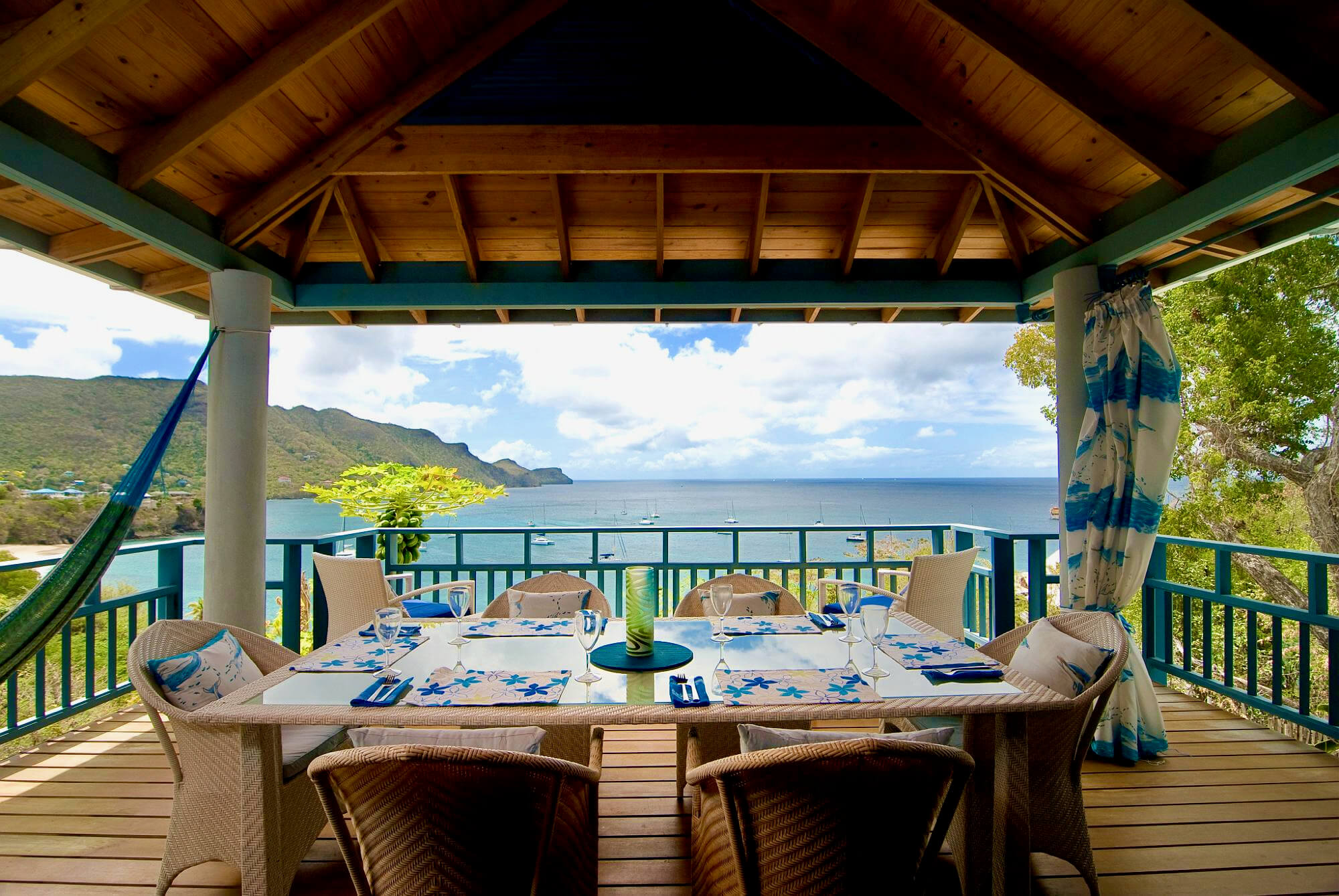 The double bedrooms each have their own private bathroom, consisting of a w.c. and a beautiful private outdoor shower open to the Caribbean sky. The main house bedrooms have their own private balconies, and the apartment bedrooms open out onto a shared balcony. All rooms enjoy lovely, expansive views of the beach and Admiralty Bay, and face west to enjoy the glorious sunsets. All bedrooms (and the fitness suite) have