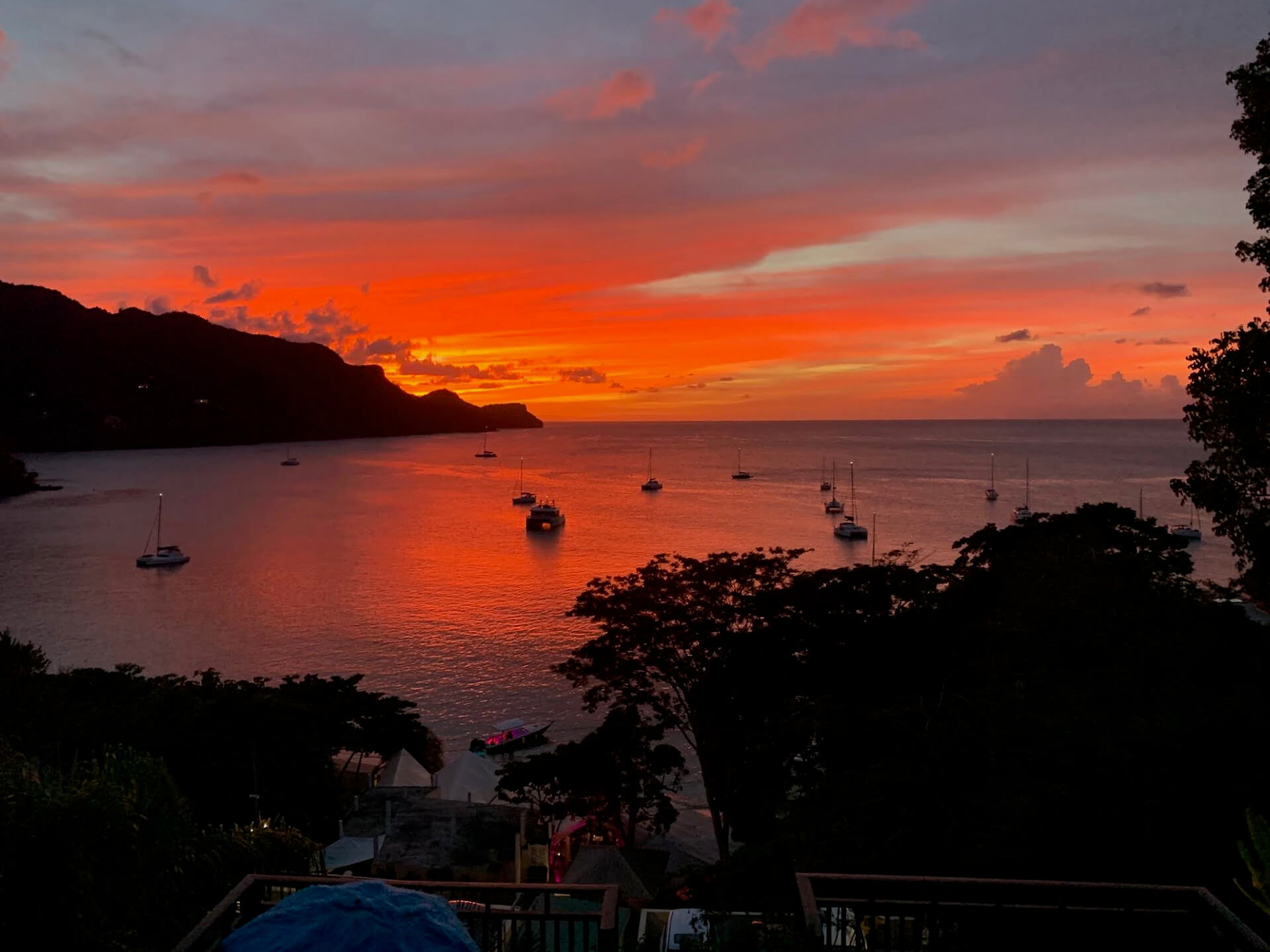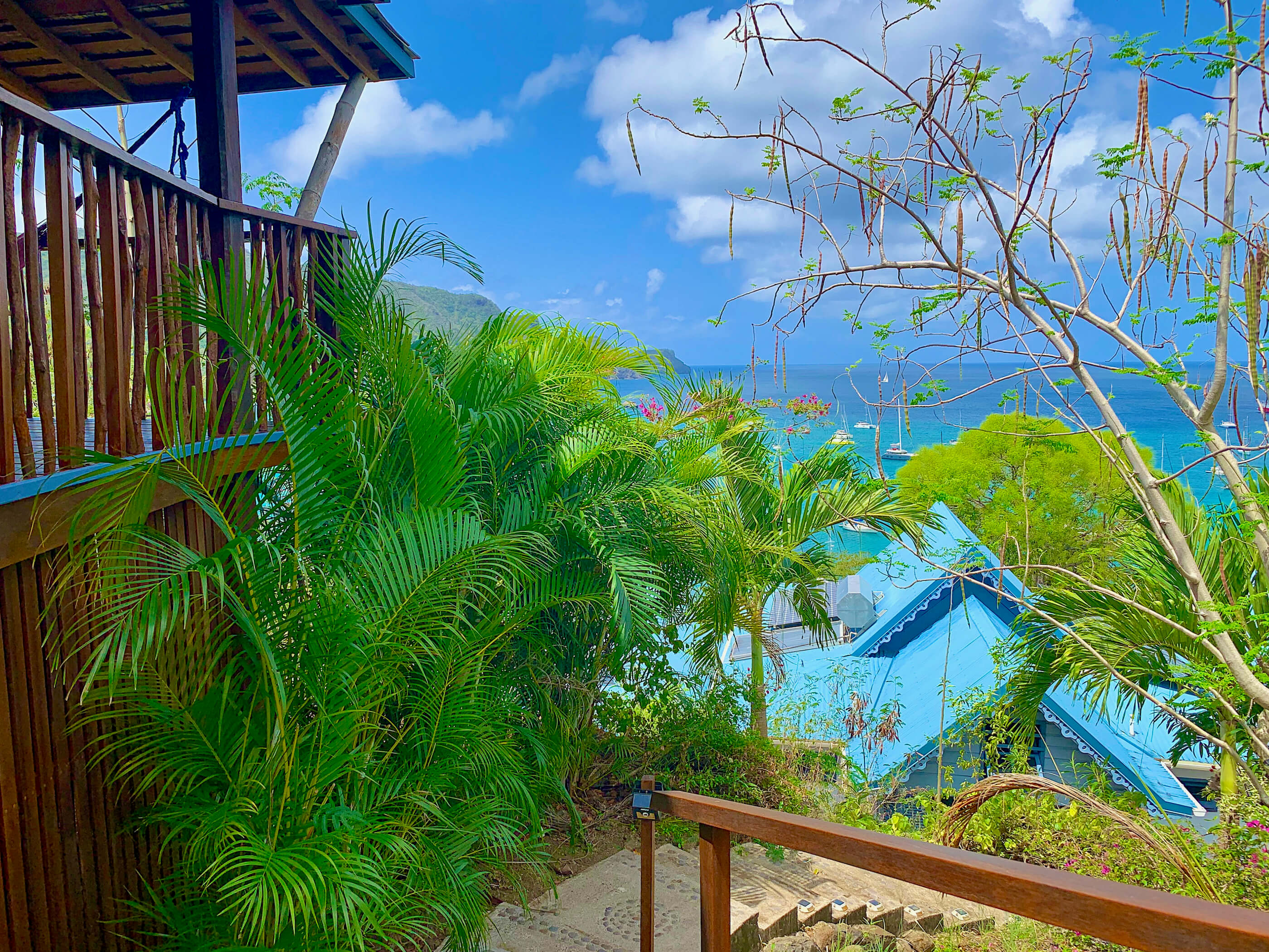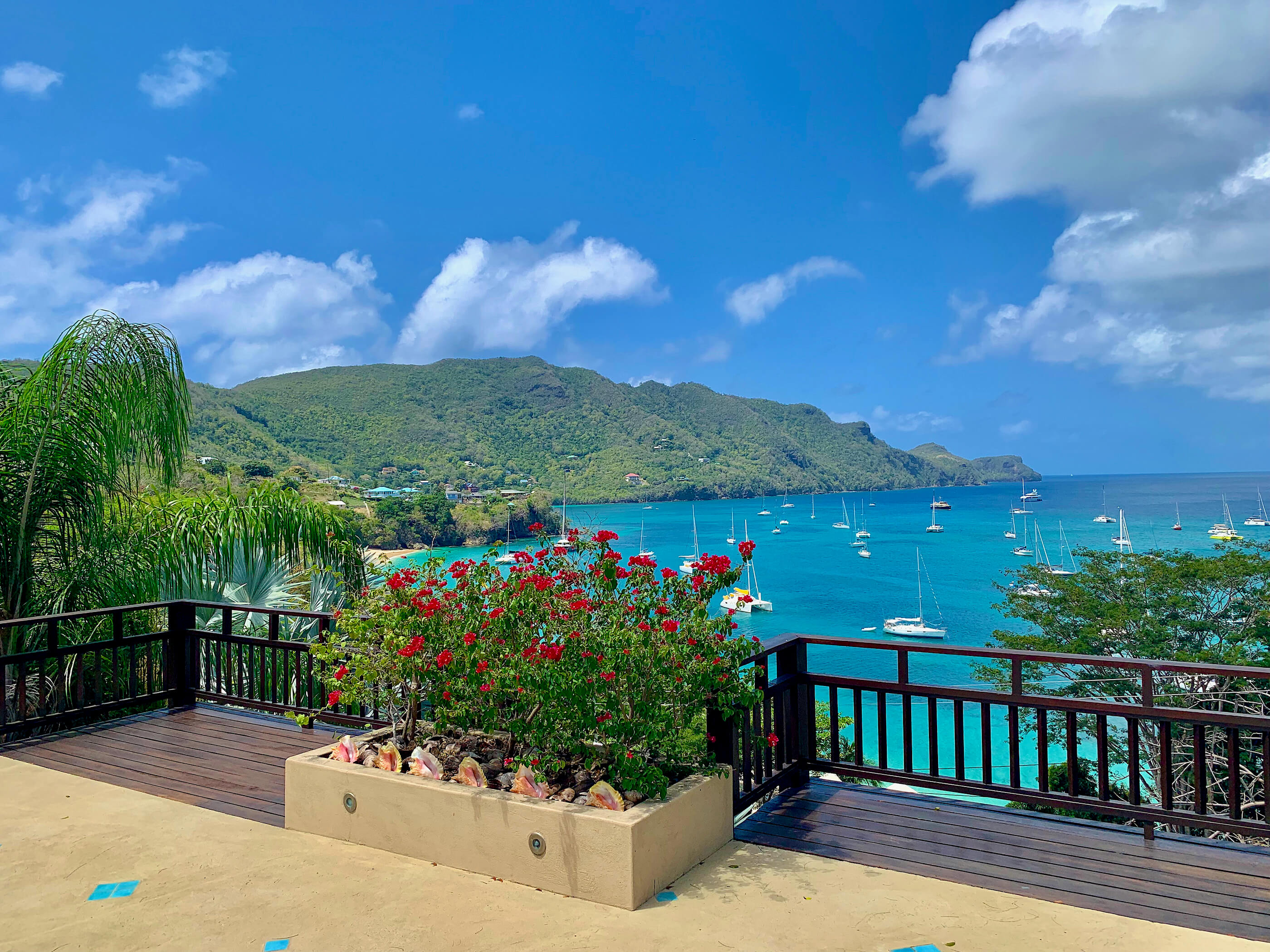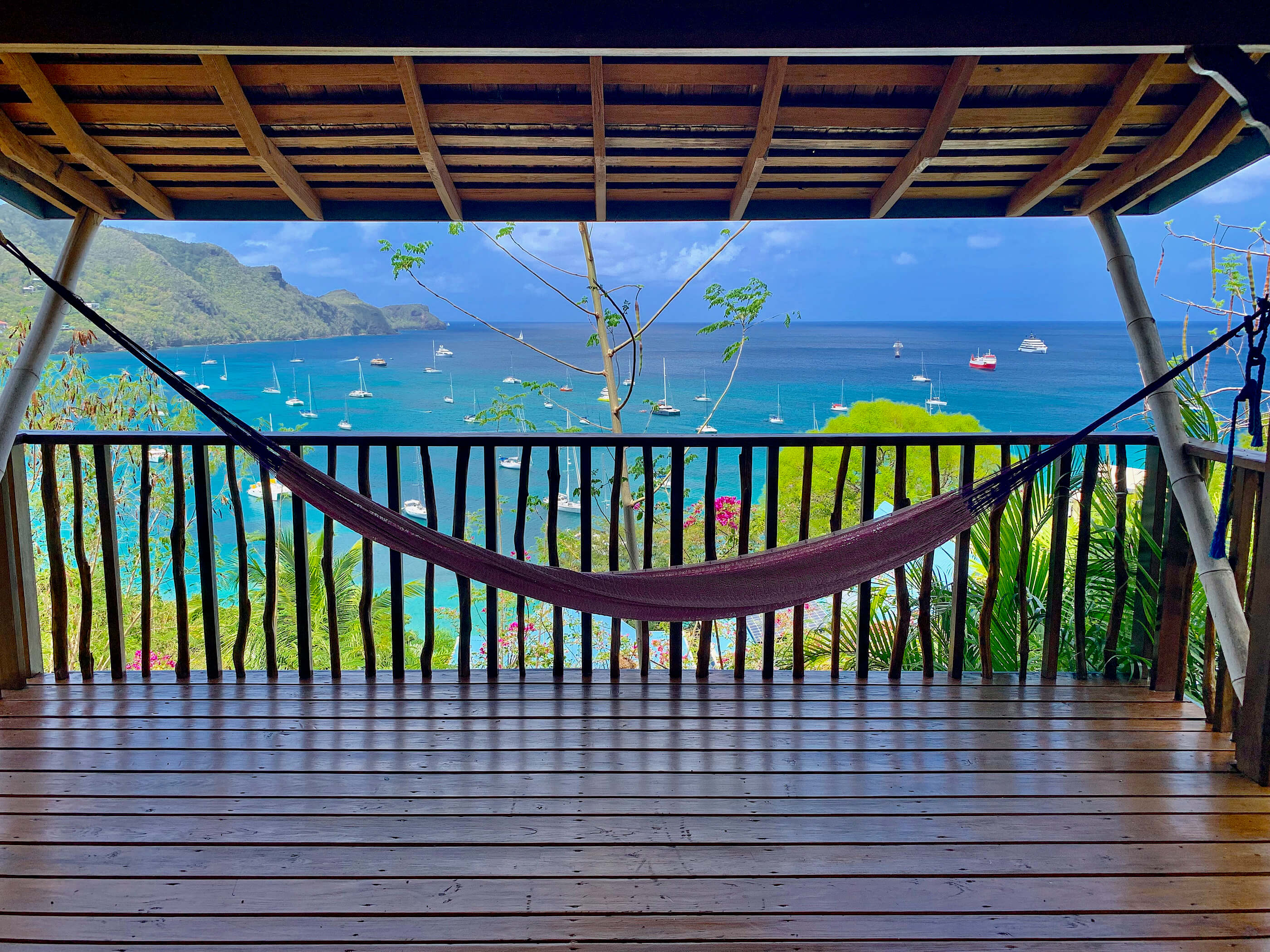 The double bedrooms each have their own private bathroom, consisting of a w.c. and a beautiful private outdoor shower open to the Caribbean sky. The main house bedrooms have their own private balconies, and the apartment bedrooms open out onto a shared balcony. All rooms enjoy lovely, expansive views of the beach and Admiralty Bay, and face west to enjoy the glorious sunsets. All bedrooms (and the fitness suite) have