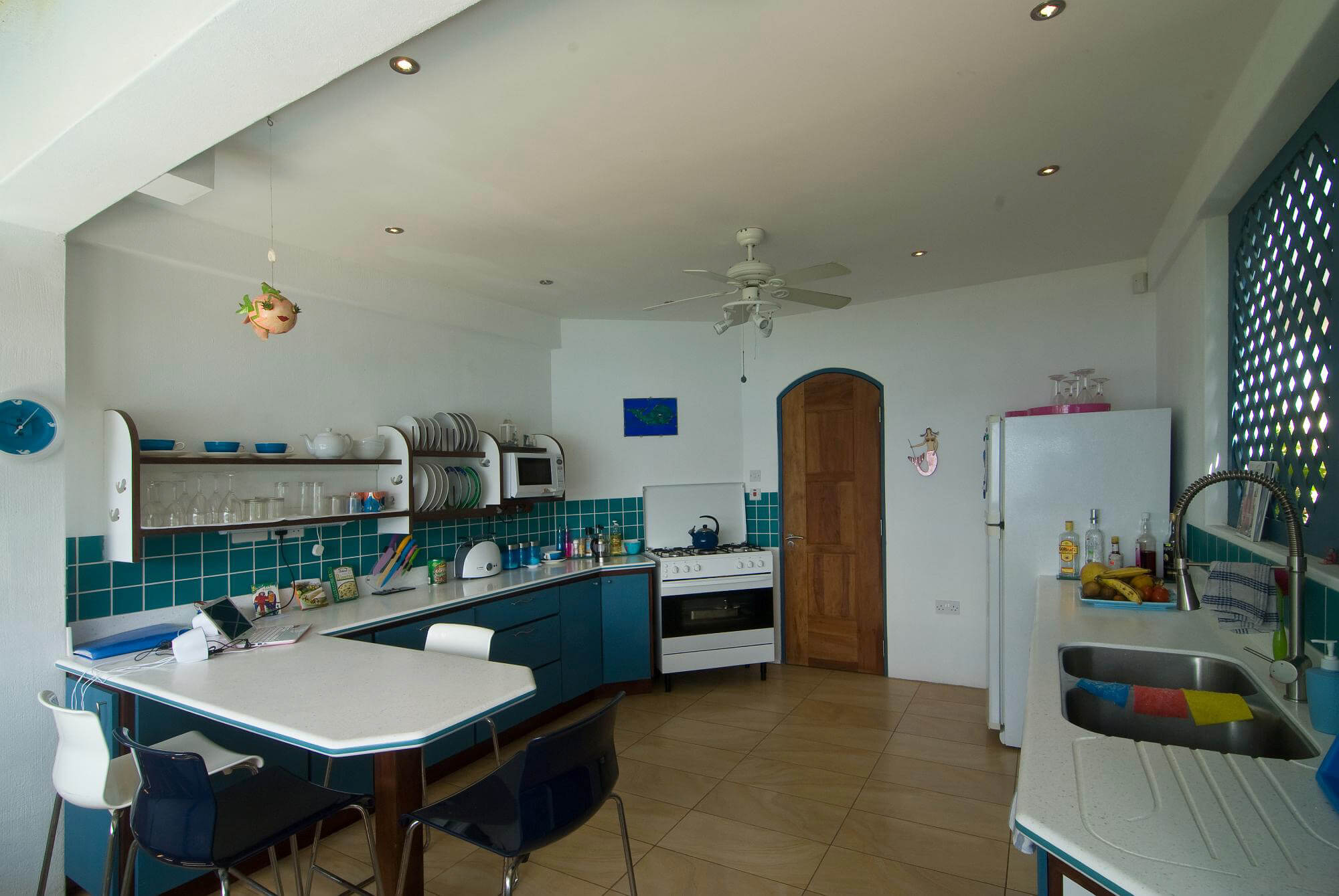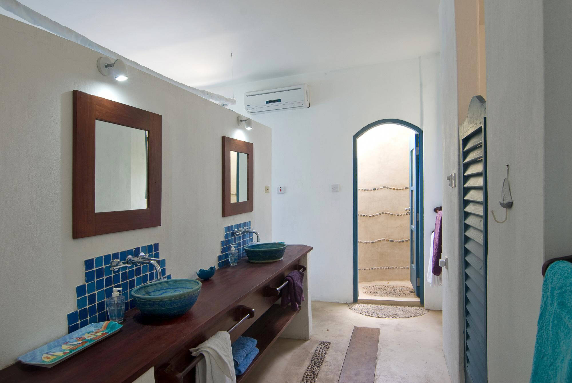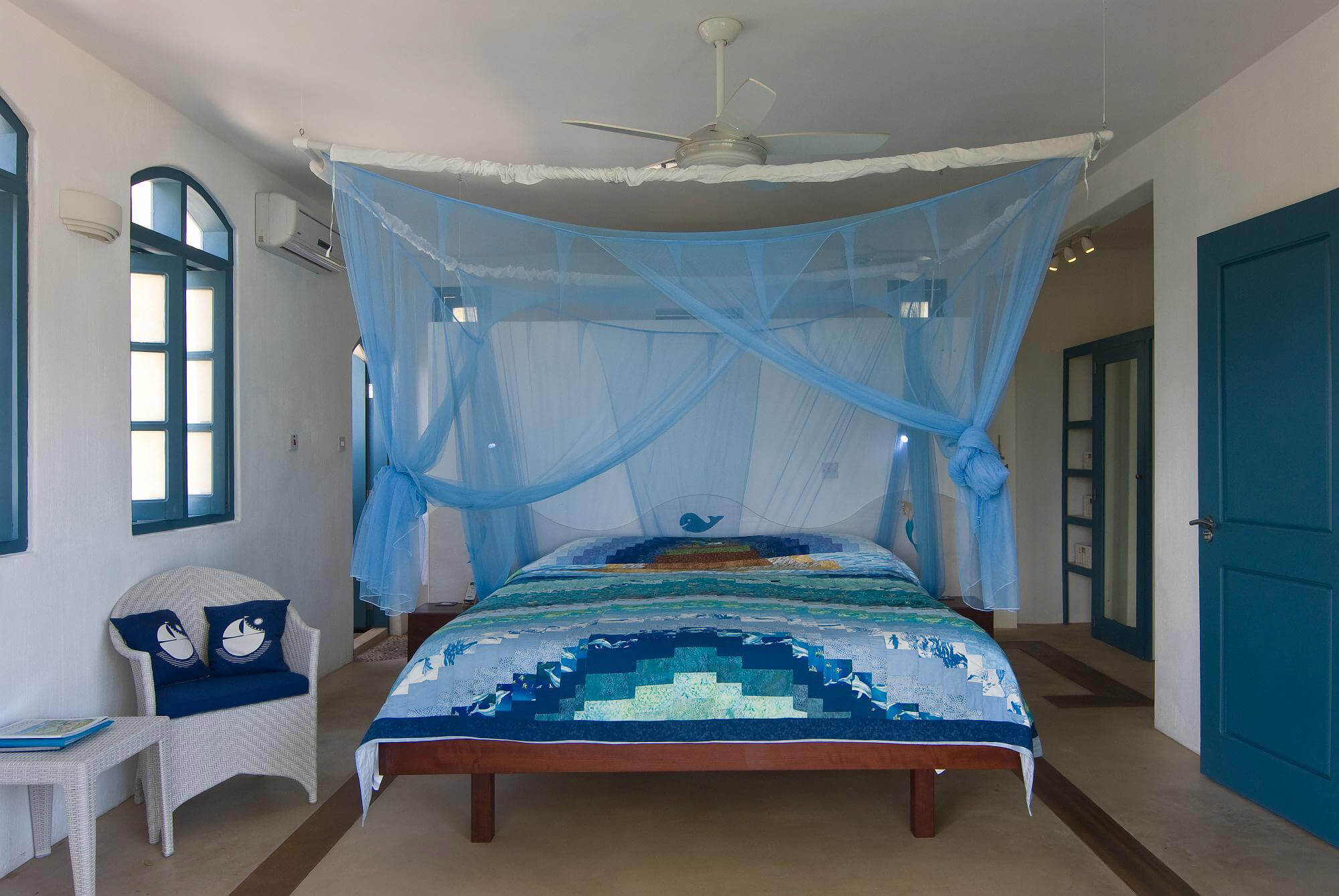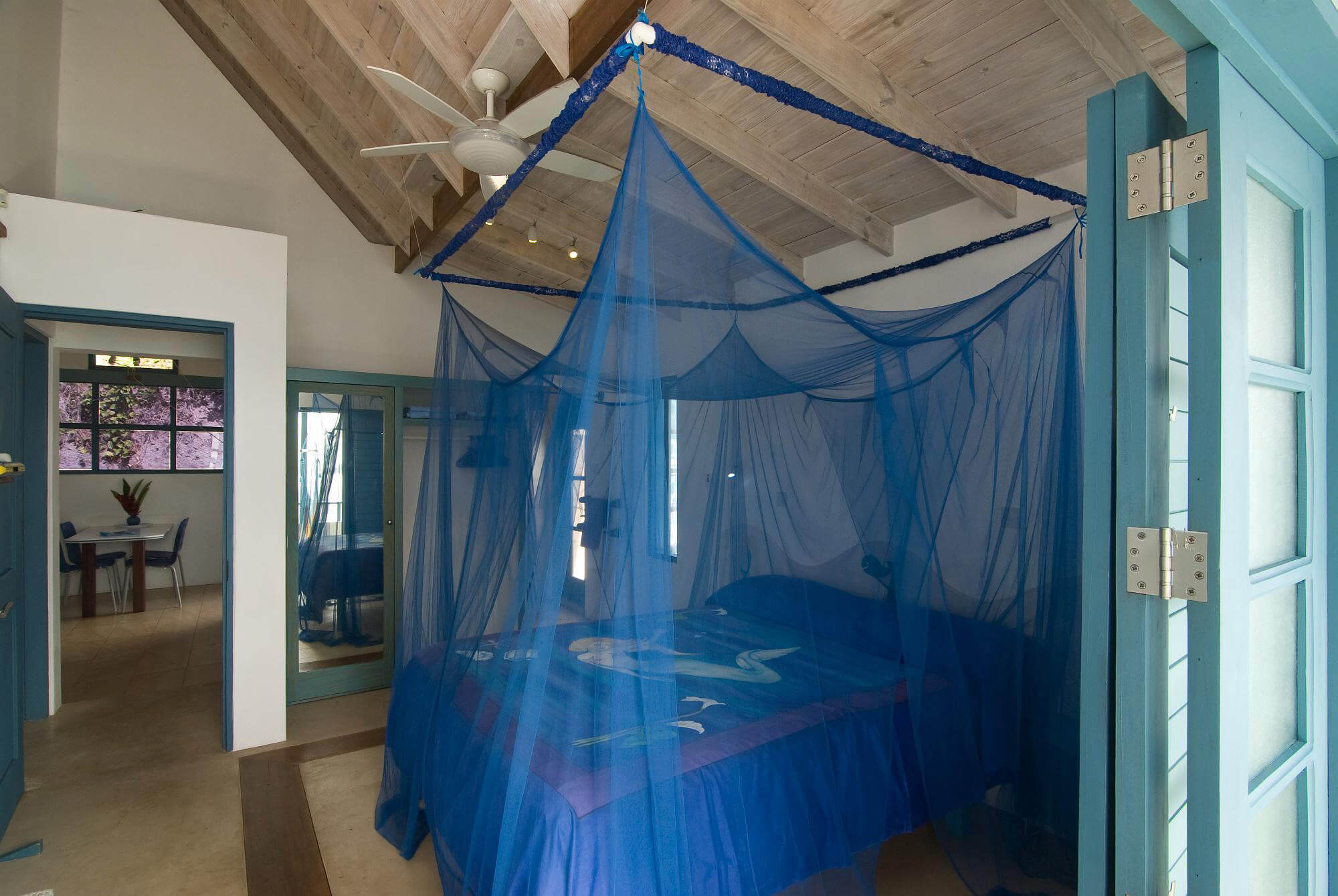 There is a casual living/entertainment/tv room that opens off the main balcony area. A Shade of Blues also has a large office space in the hallway, along with a guest w.c. This is an open air environment with a beautiful view of the sea. All living areas are cooled by ceiling fans.