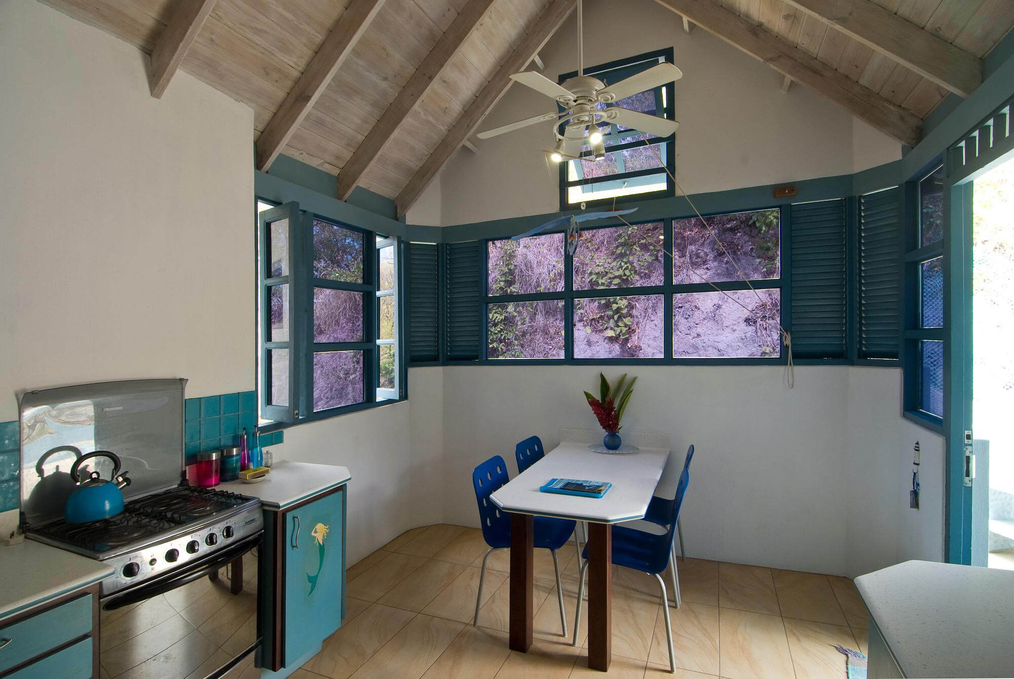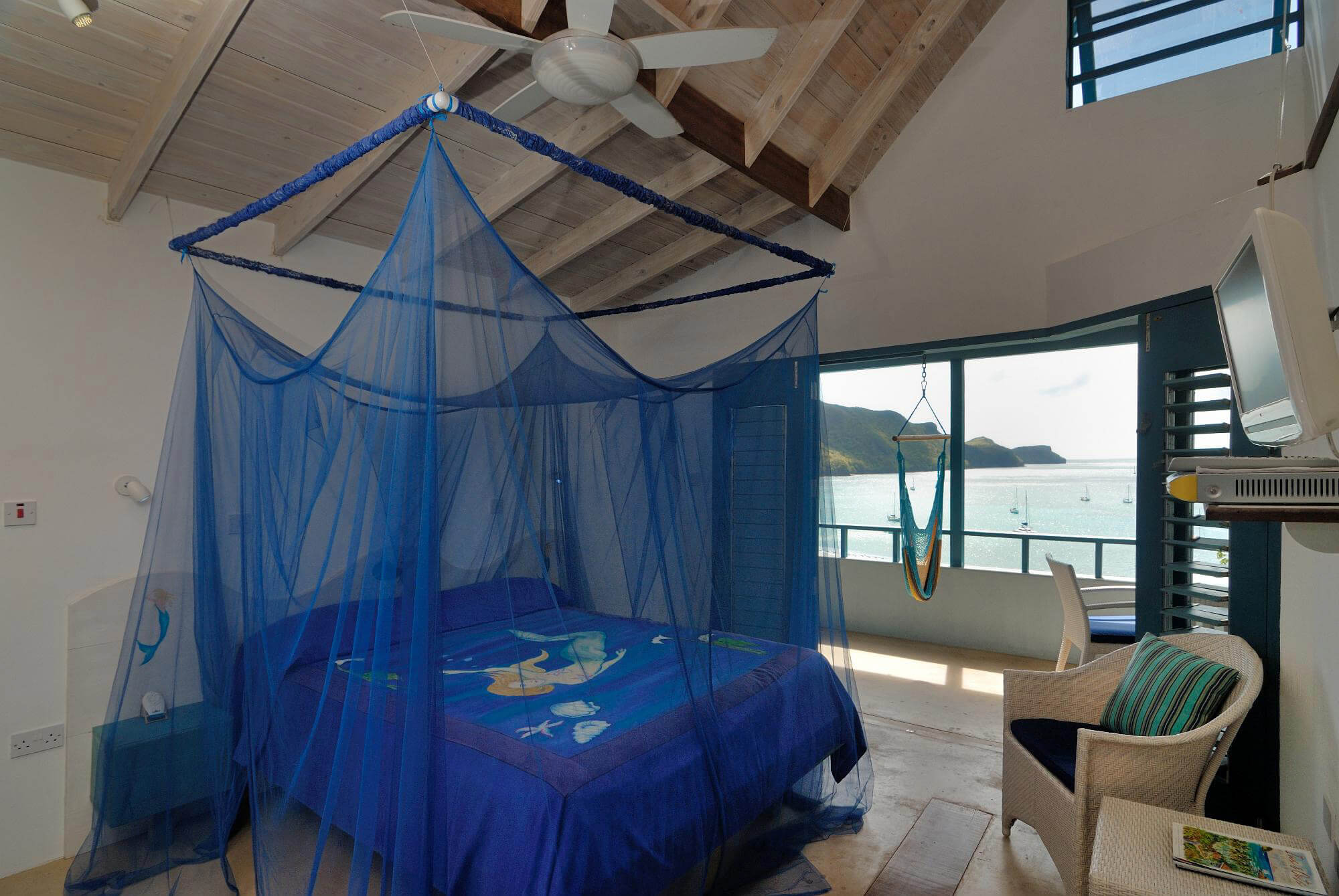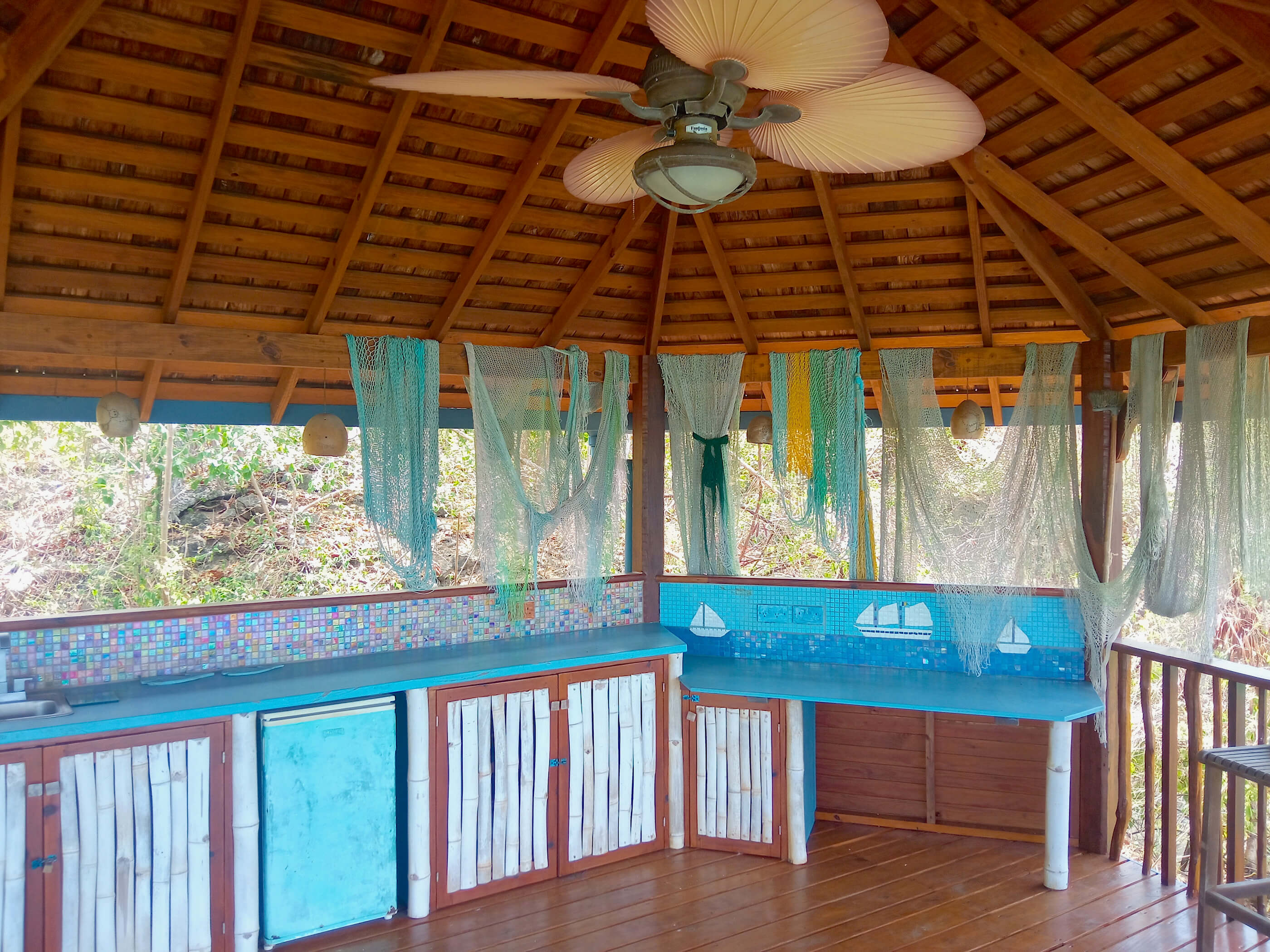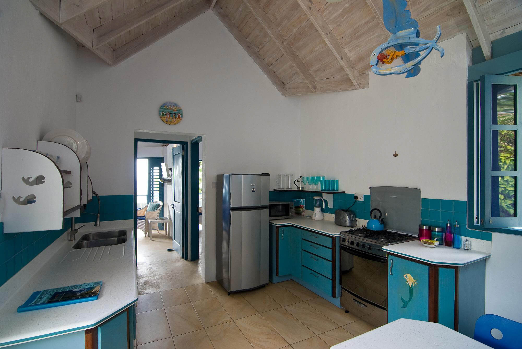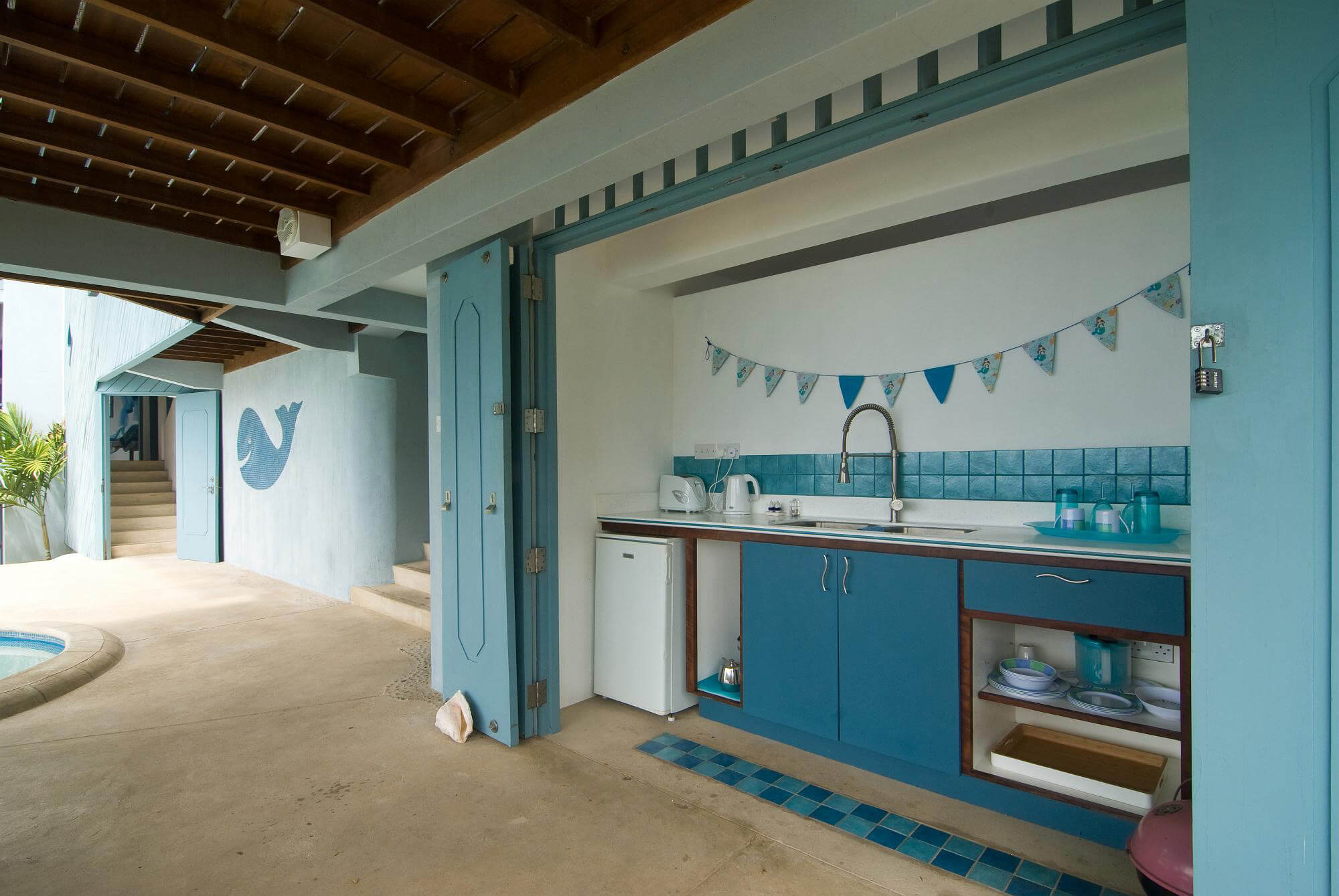 There is a casual living/entertainment/tv room that opens off the main balcony area. A Shade of Blues also has a large office space in the hallway, along with a guest w.c. This is an open air environment with a beautiful view of the sea. All living areas are cooled by ceiling fans.