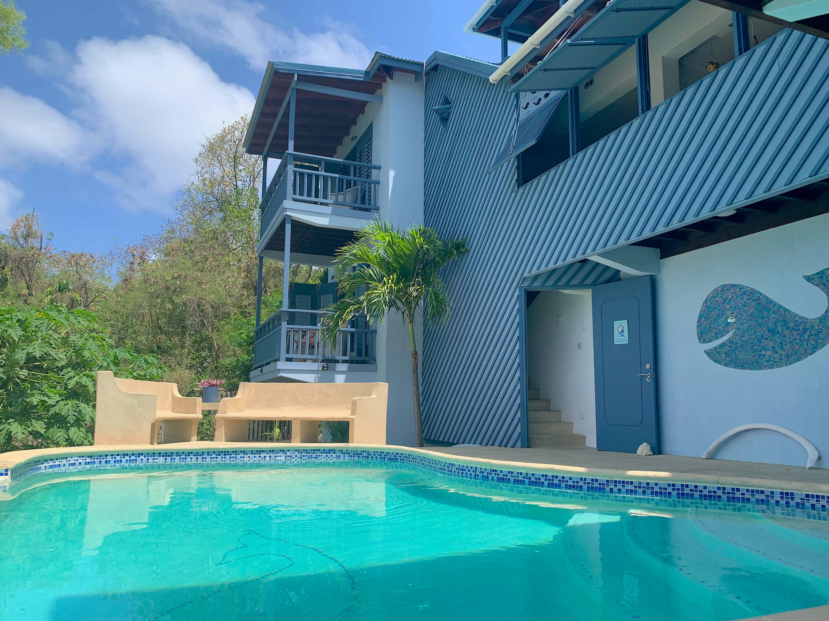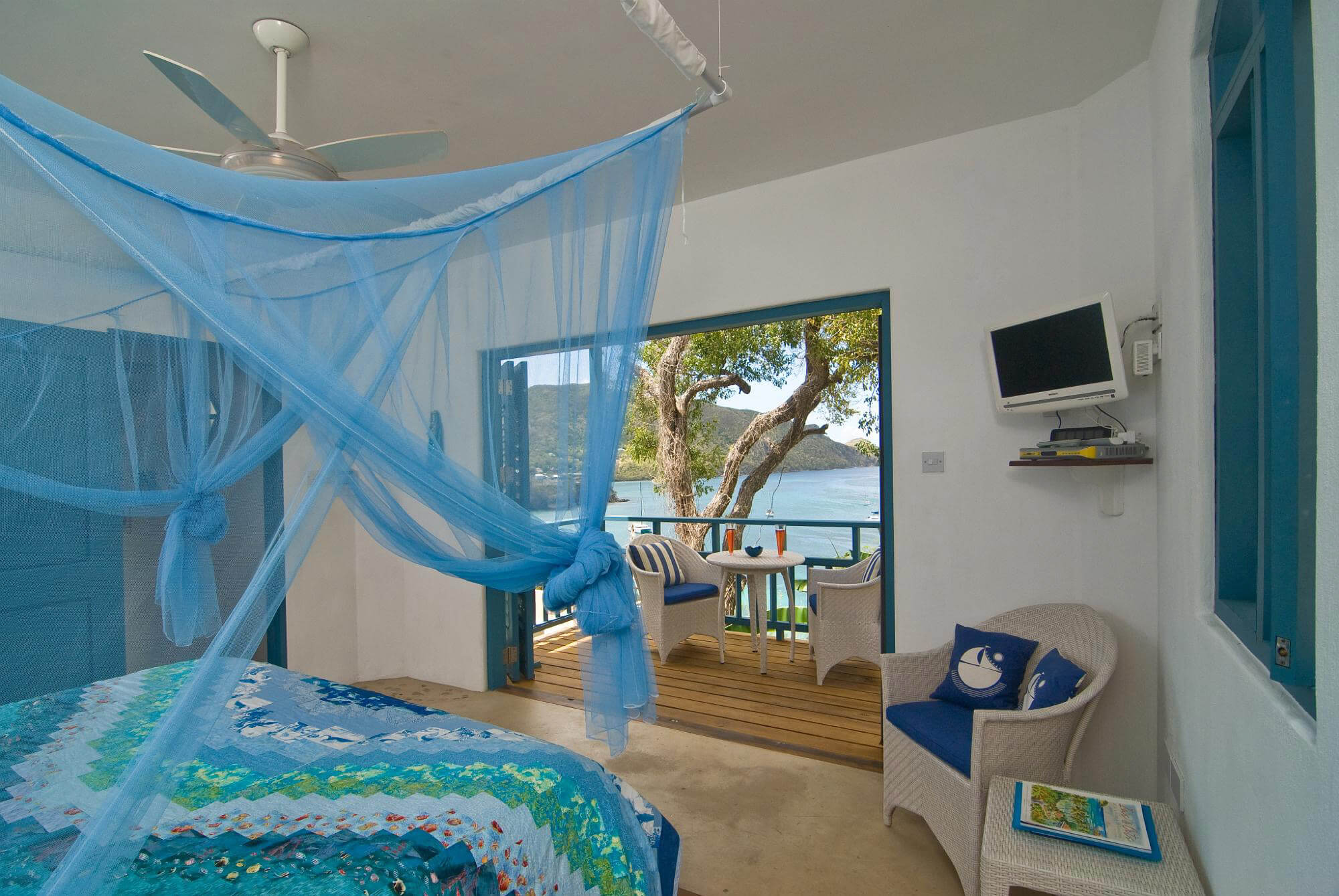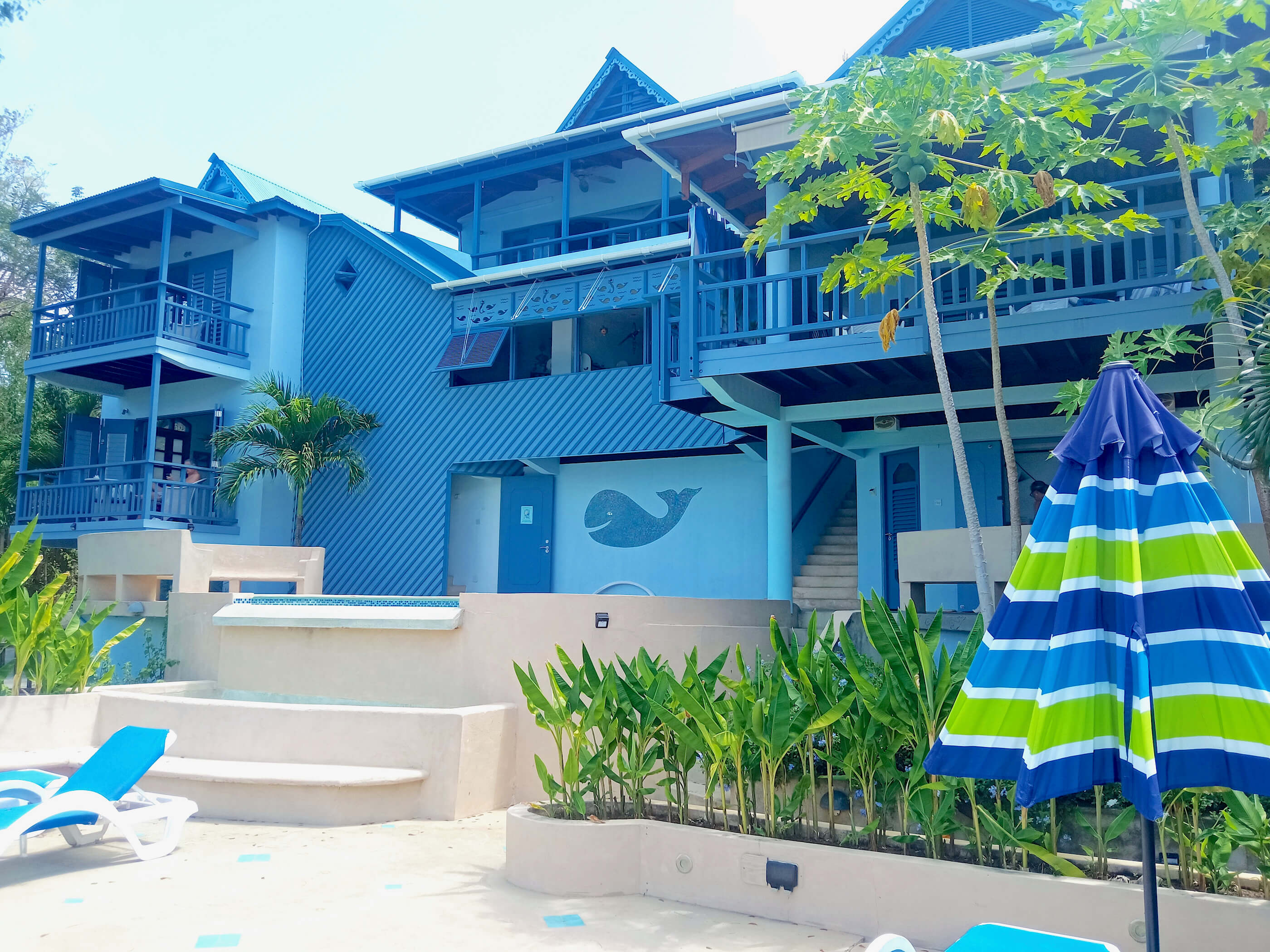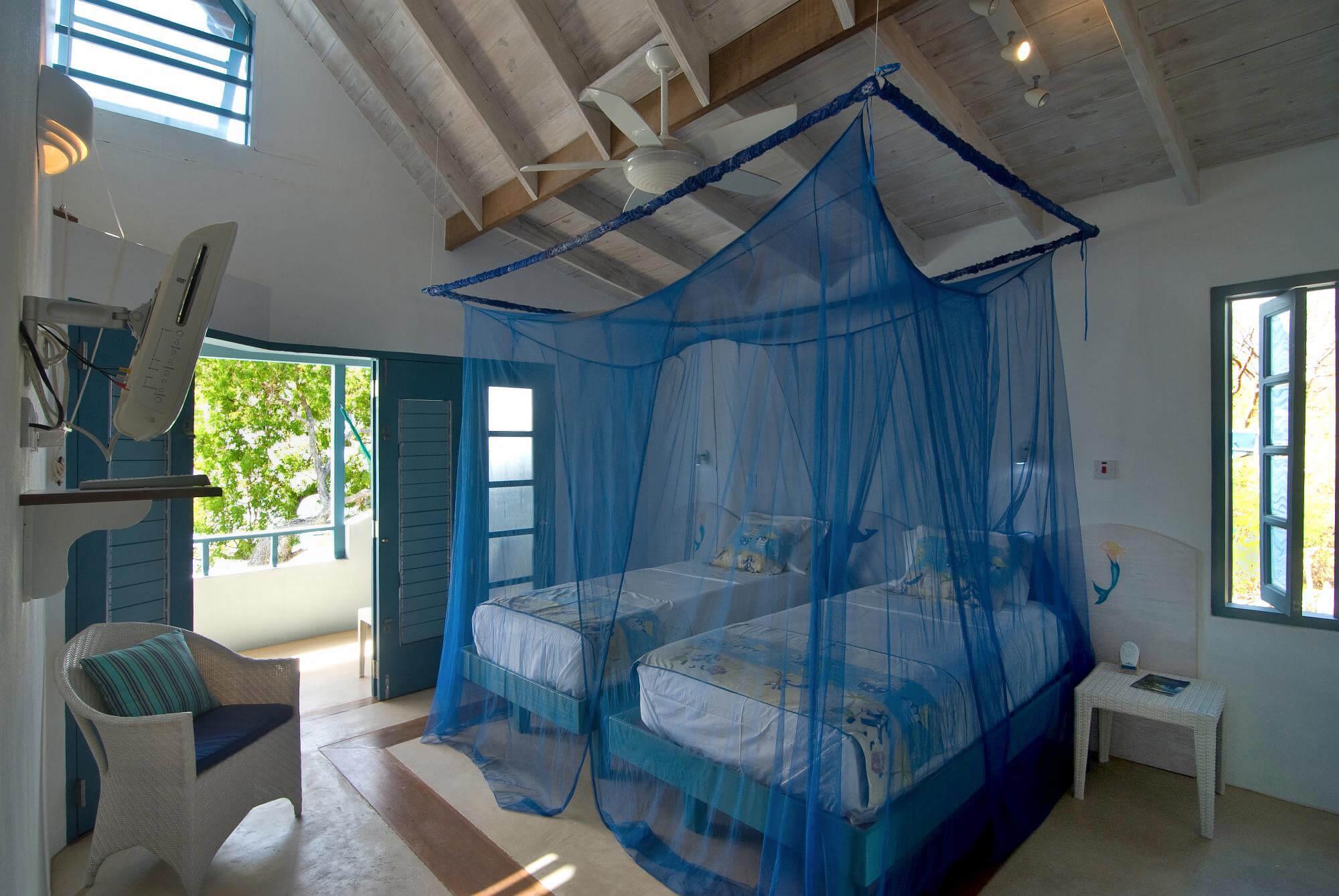 There is a casual living/entertainment/tv room that opens off the main balcony area. A Shade of Blues also has a large office space in the hallway, along with a guest w.c. This is an open air environment with a beautiful view of the sea. All living areas are cooled by ceiling fans.