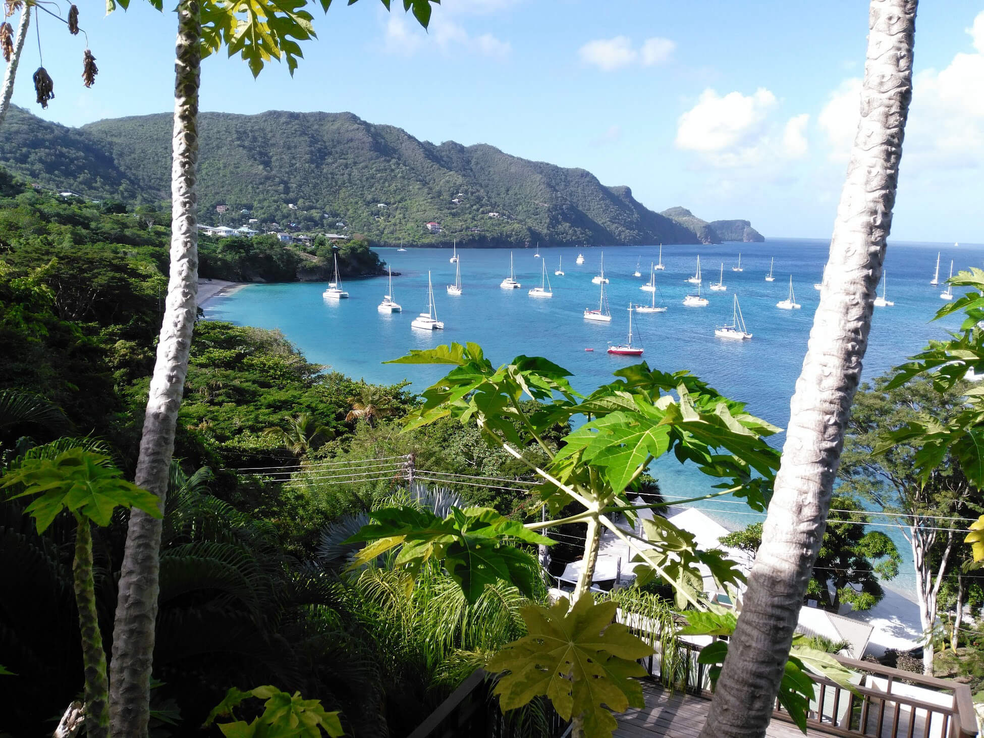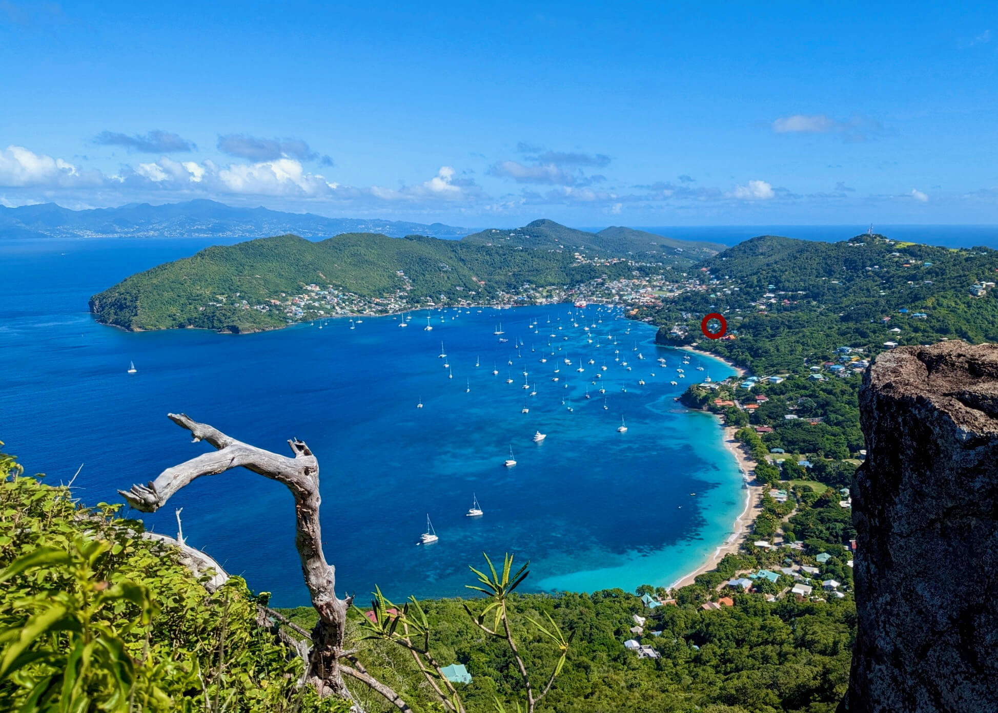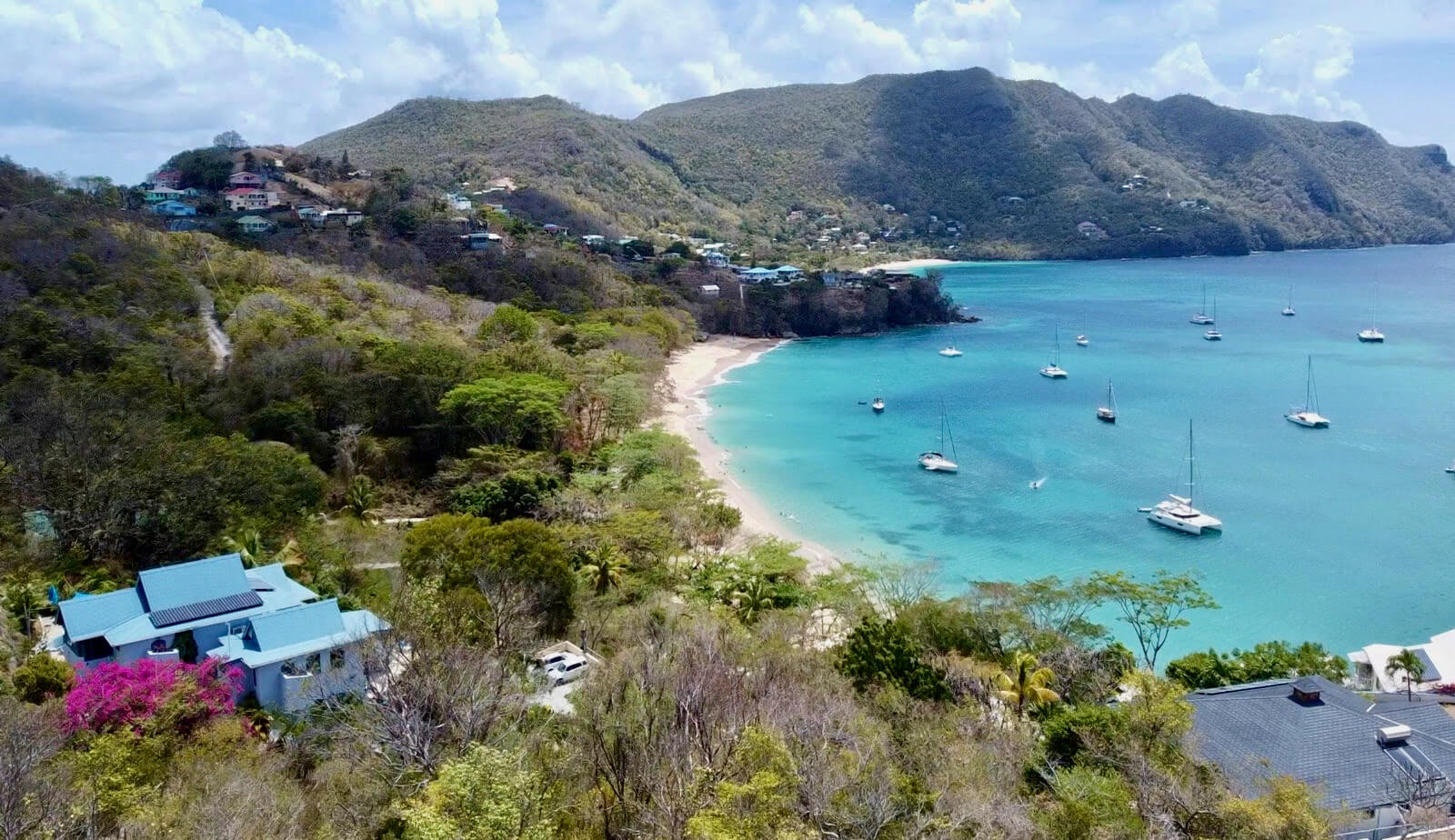 This is a favourite beach for visiting yachts and has a great convivial atmosphere. Gorgeous, deep coral sand beach. Excellent swimming. Beautiful trees for shade... There's even a cave to explore! Now with a spectacular beach restaurant. Best reached either by water, there is a pretty wooden jetty for a dinghy to the harbour, or via the Belmont Walkway Coastal Path from Port Elizabeth. Above and behind the beach a handful of special houses nestle amongst the trees or on the headland. brightly painted hand made boats rest in the shade of palms and sea grape.
