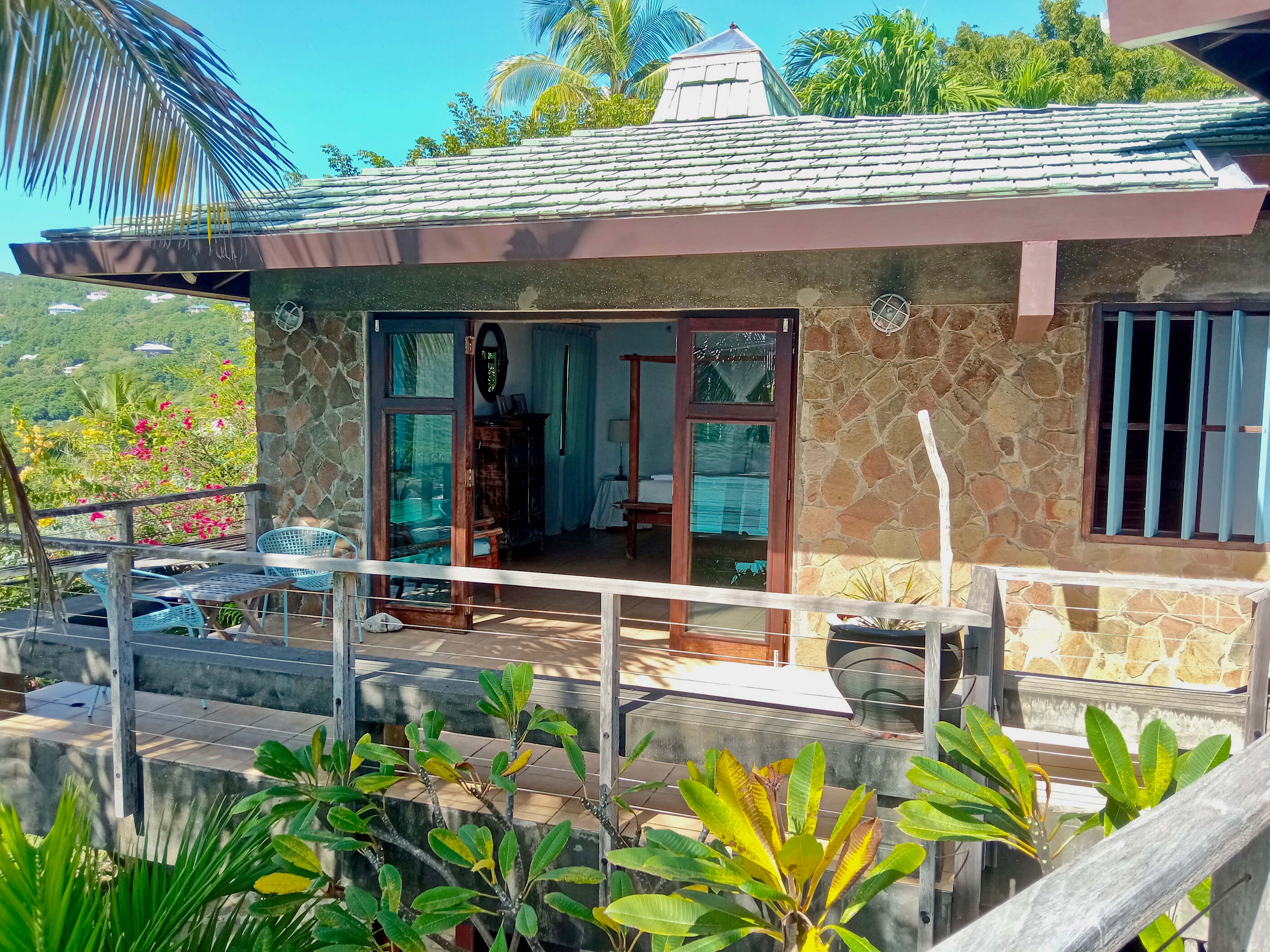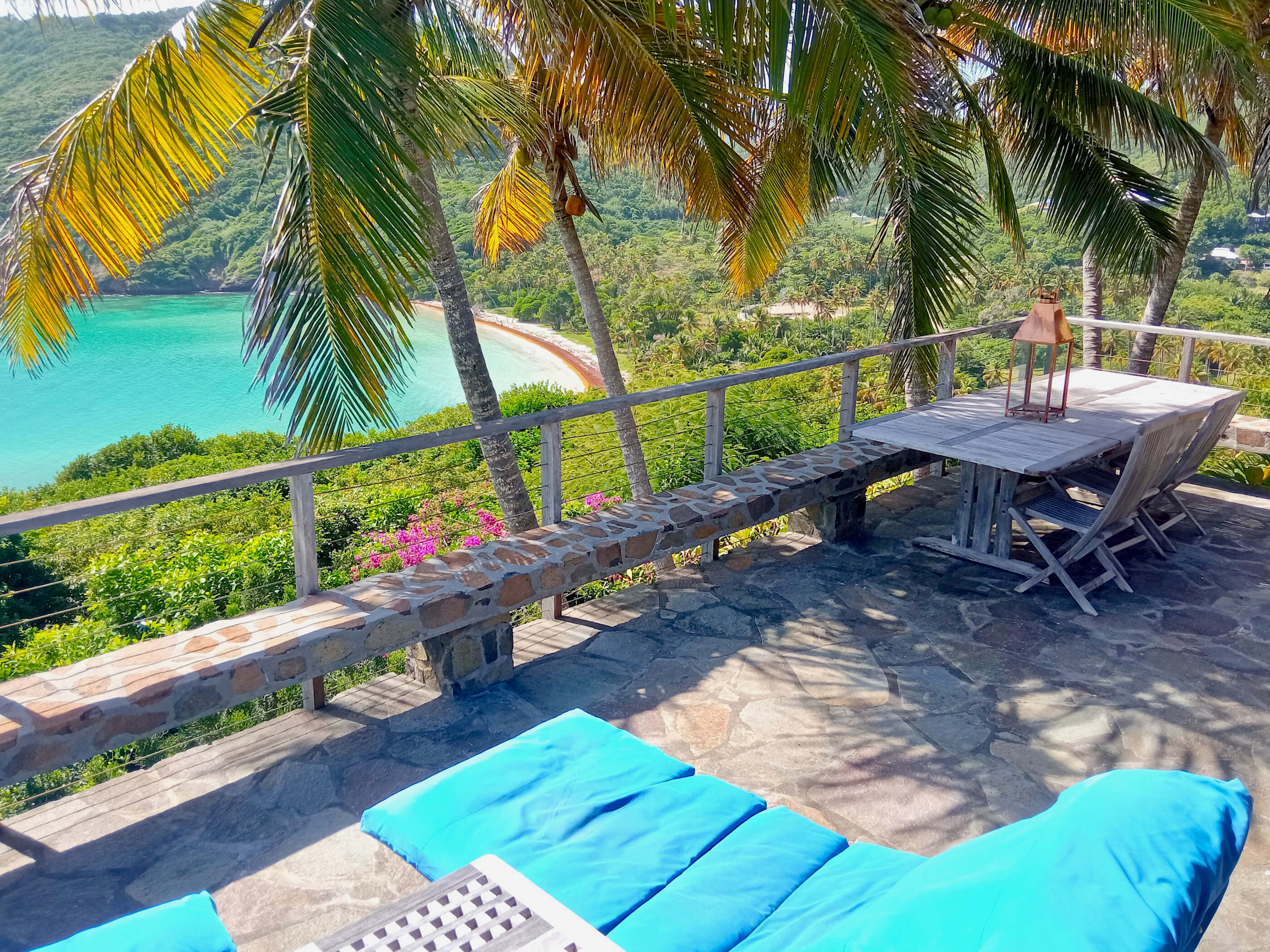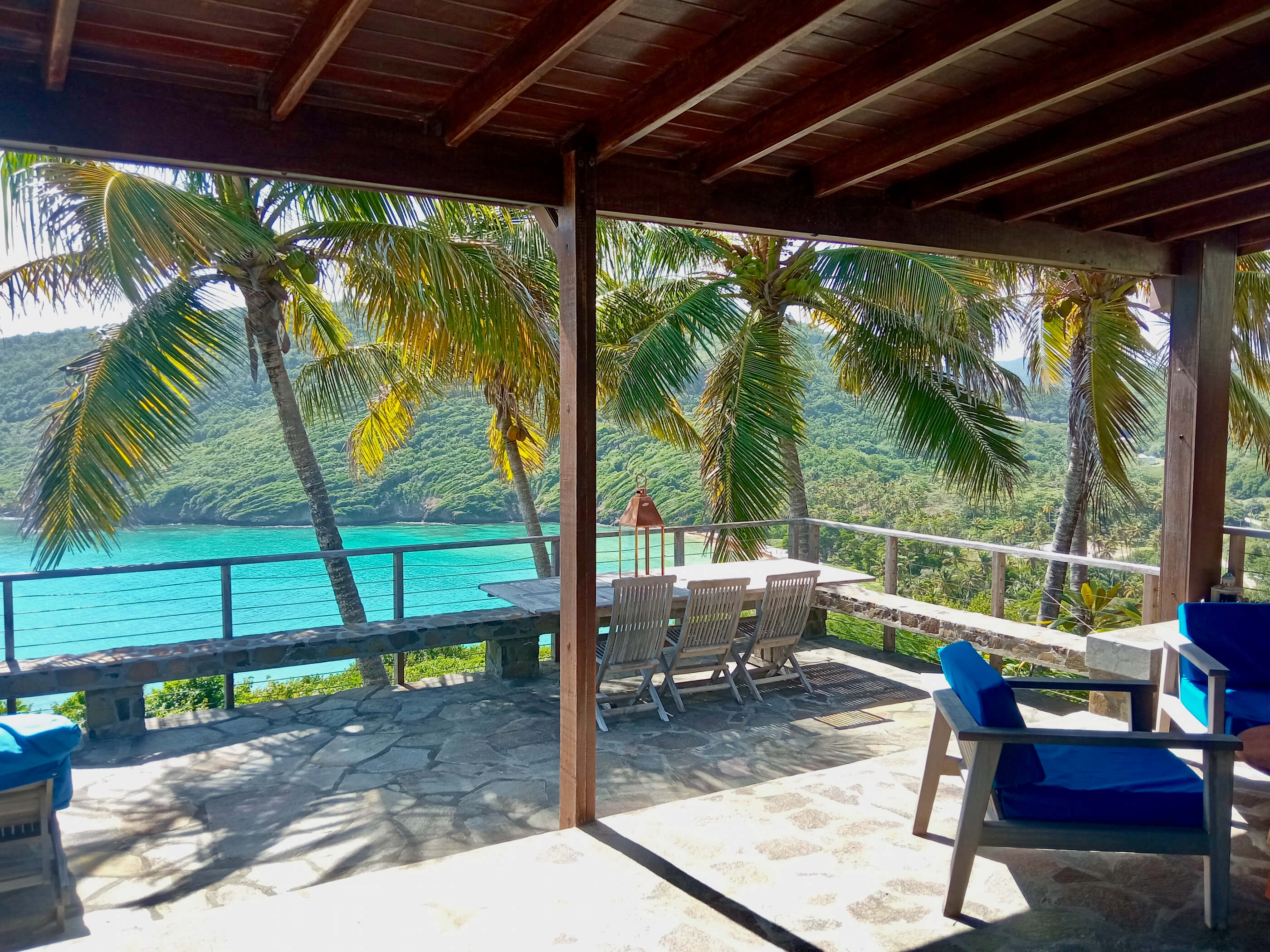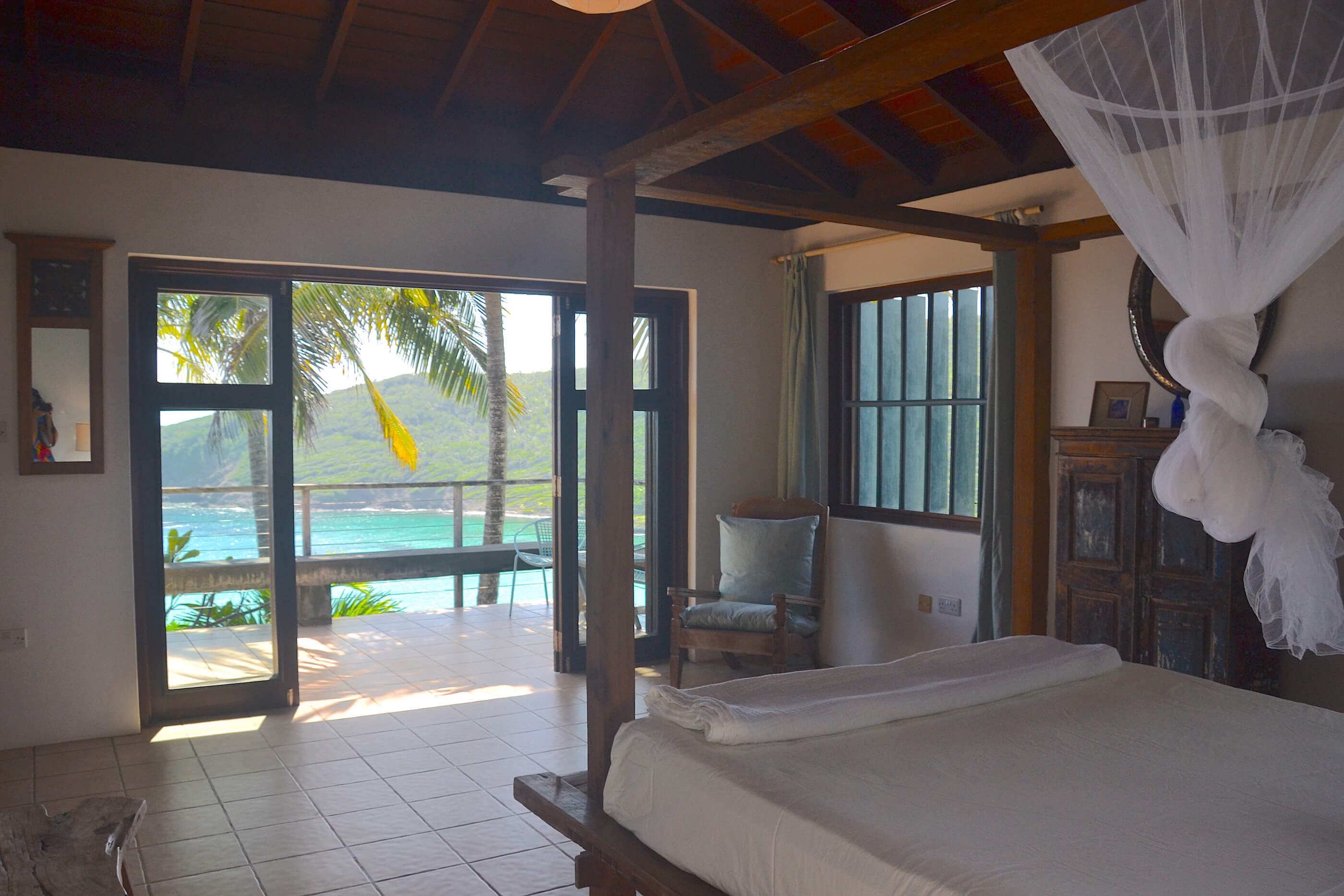 The three roomy en suite bedrooms in Balliceaux all have double beds, air conditioning, private balconies and are draped in cool linens providing a romantic classic atmosphere. Beautifully airy with gentle tradewind breezes wafting through the hardwood louvered windows. The bedrooms also have cool tiled floors. The master bedroom has a large entrance hall and spacious stone shower. The guest bedrooms, located in a separate wing from the master bedroom have their own bespoke shower units and balconies. The large windows built from Brazilian Greenheart provide a gallery of views of the Atlantic ocean.