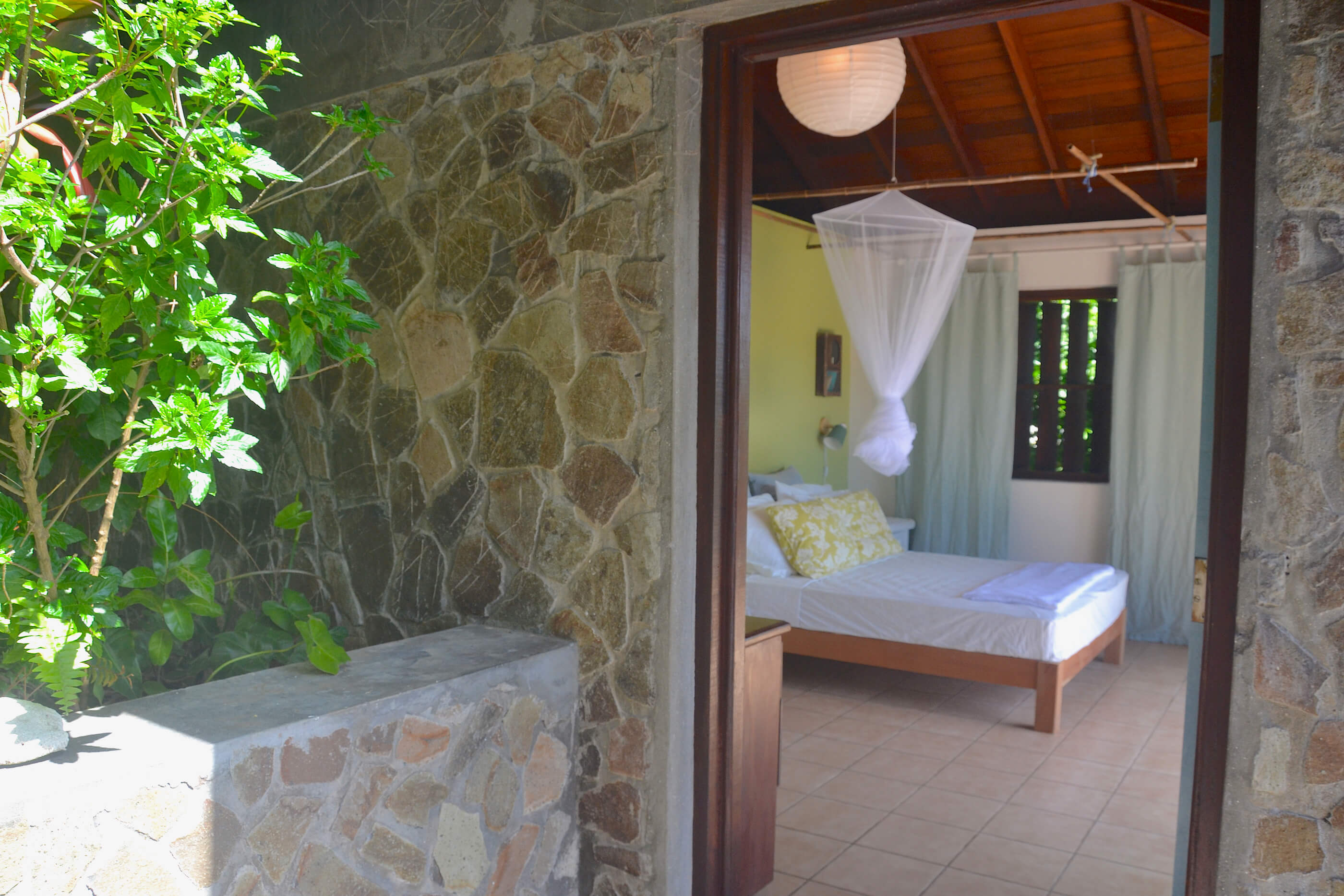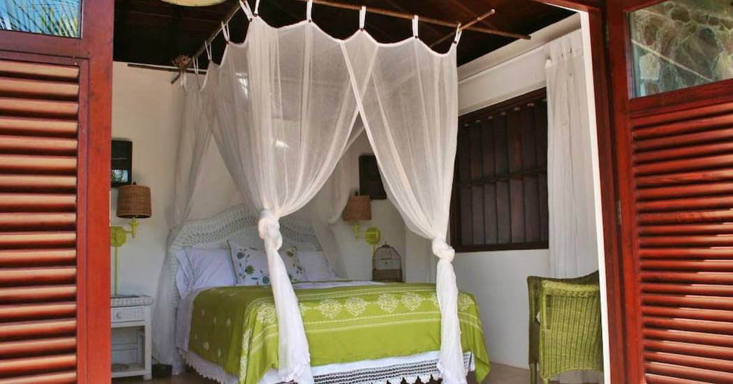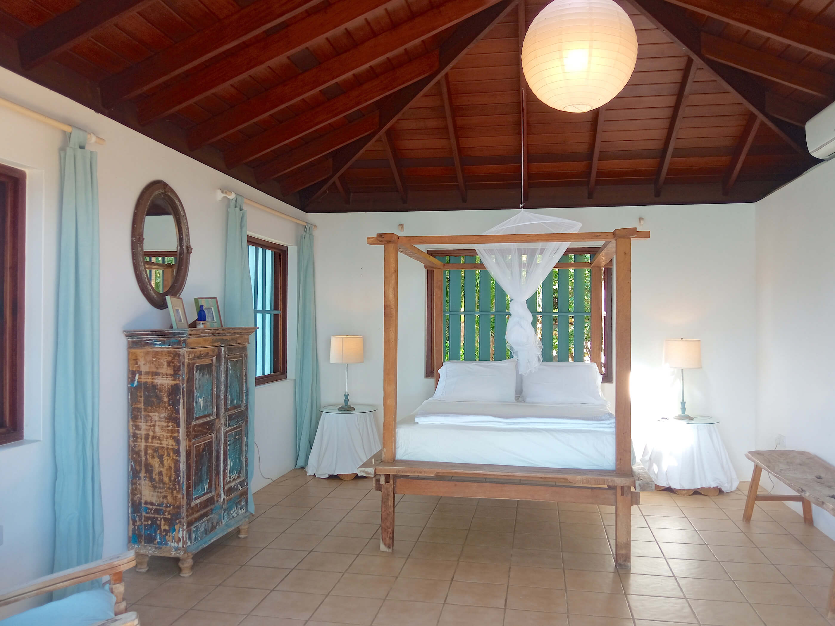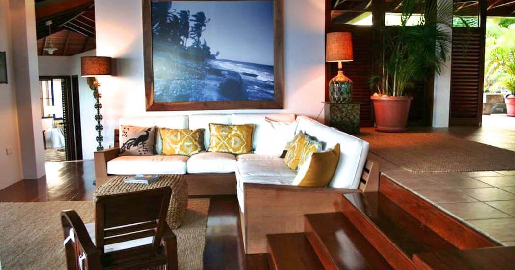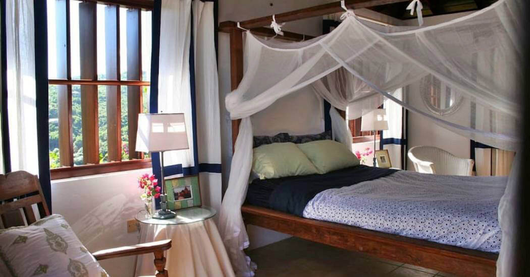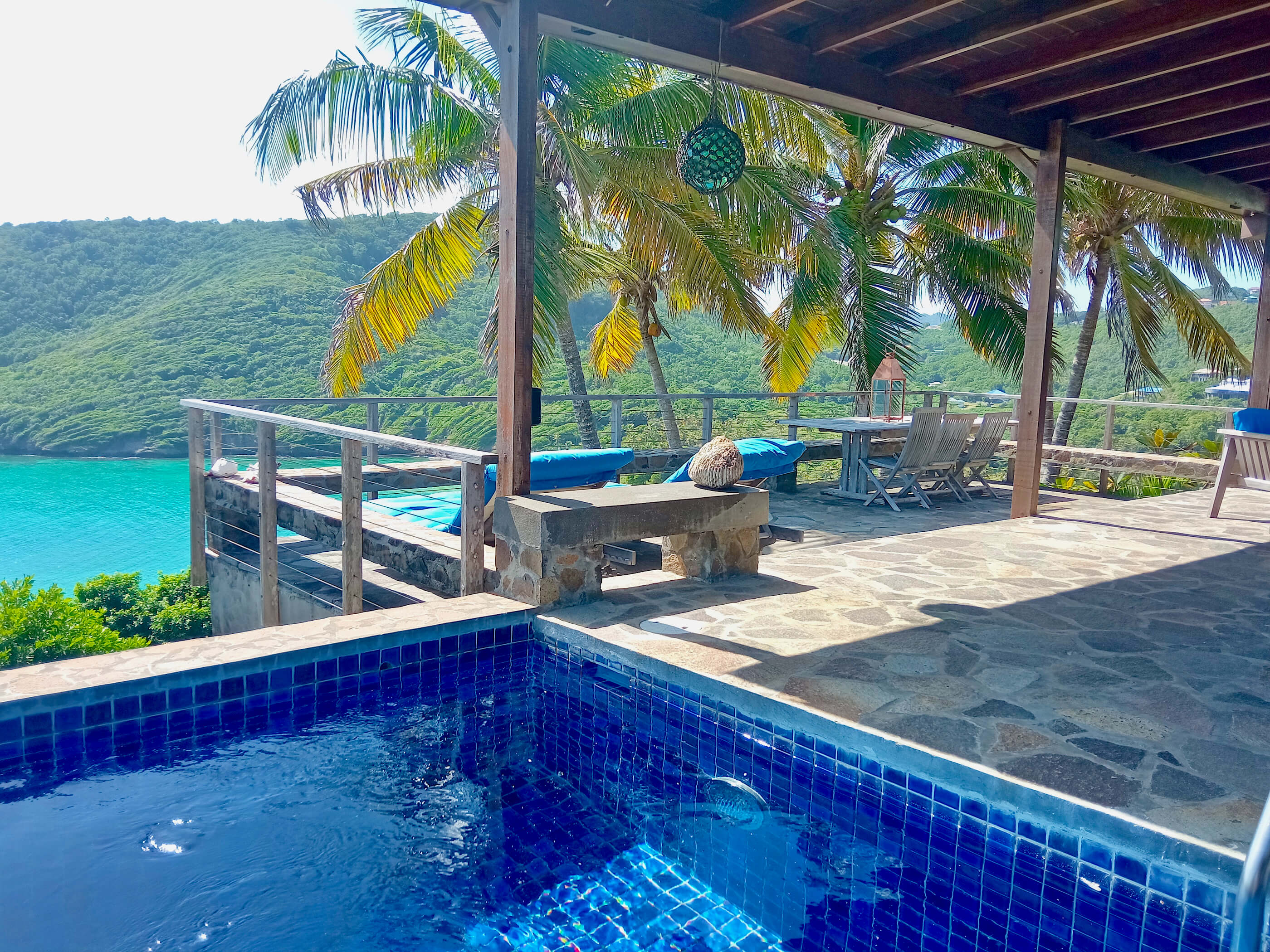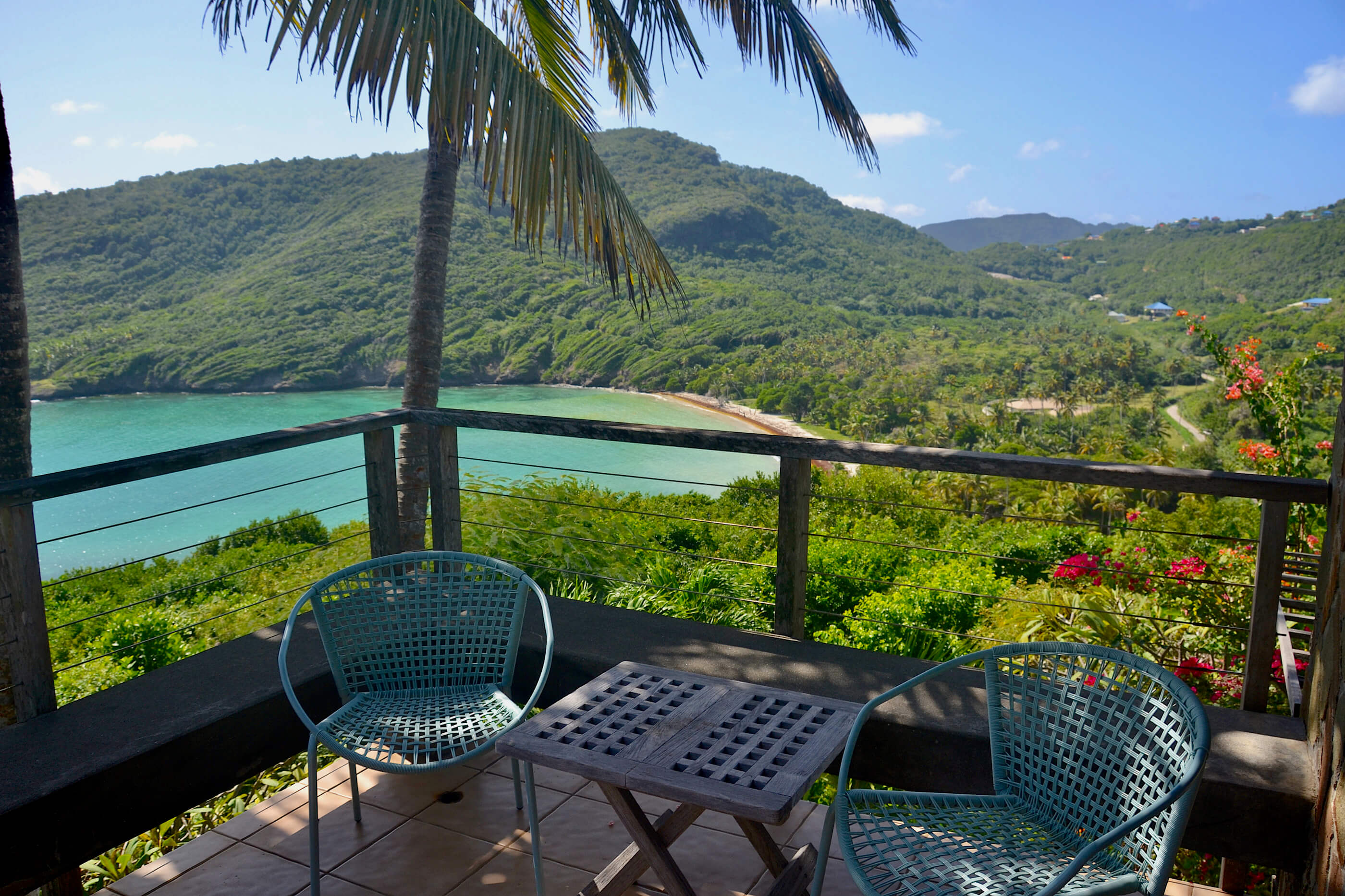 The three roomy en suite bedrooms in Balliceaux all have double beds, air conditioning, private balconies and are draped in cool linens providing a romantic classic atmosphere. Beautifully airy with gentle tradewind breezes wafting through the hardwood louvered windows. The bedrooms also have cool tiled floors. The master bedroom has a large entrance hall and spacious stone shower. The guest bedrooms, located in a separate wing from the master bedroom have their own bespoke shower units and balconies. The large windows built from Brazilian Greenheart provide a gallery of views of the Atlantic ocean.