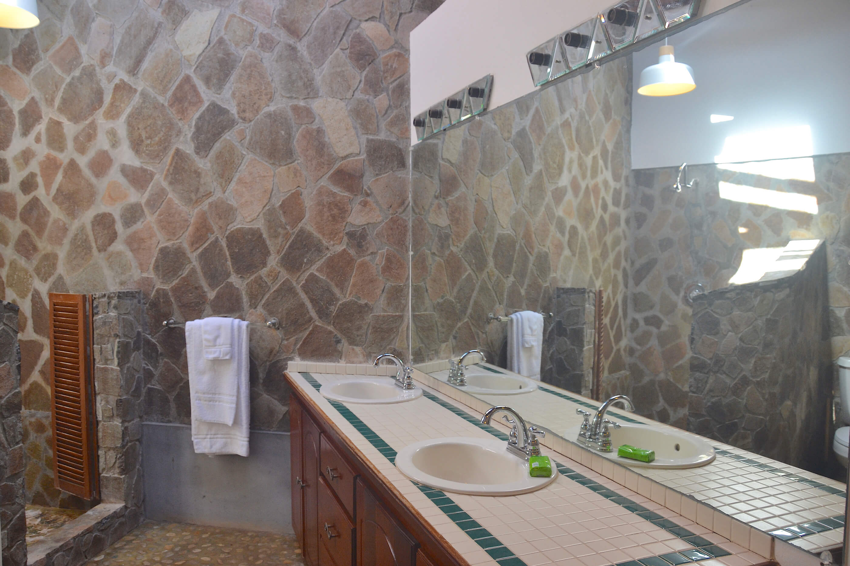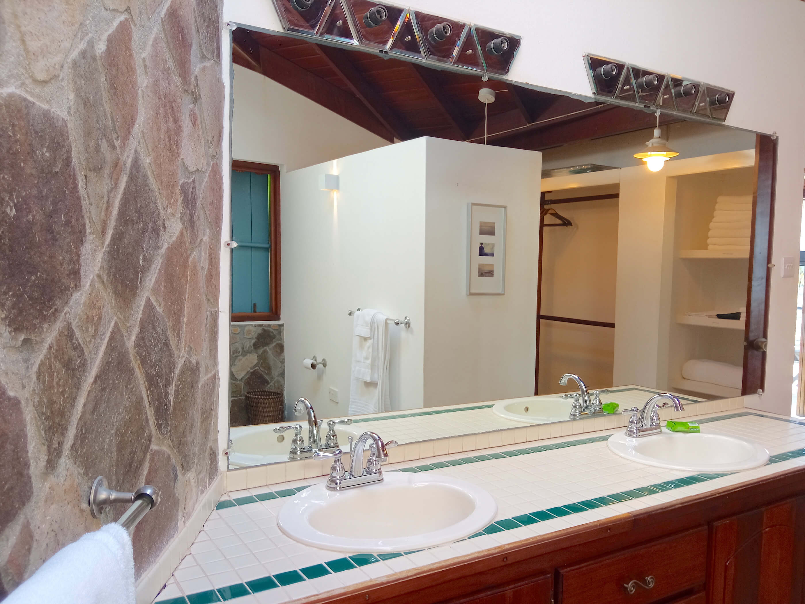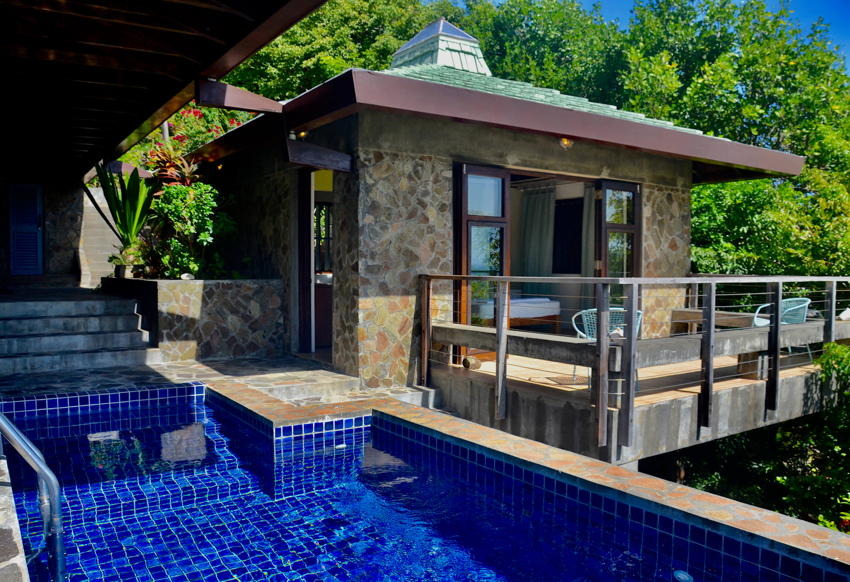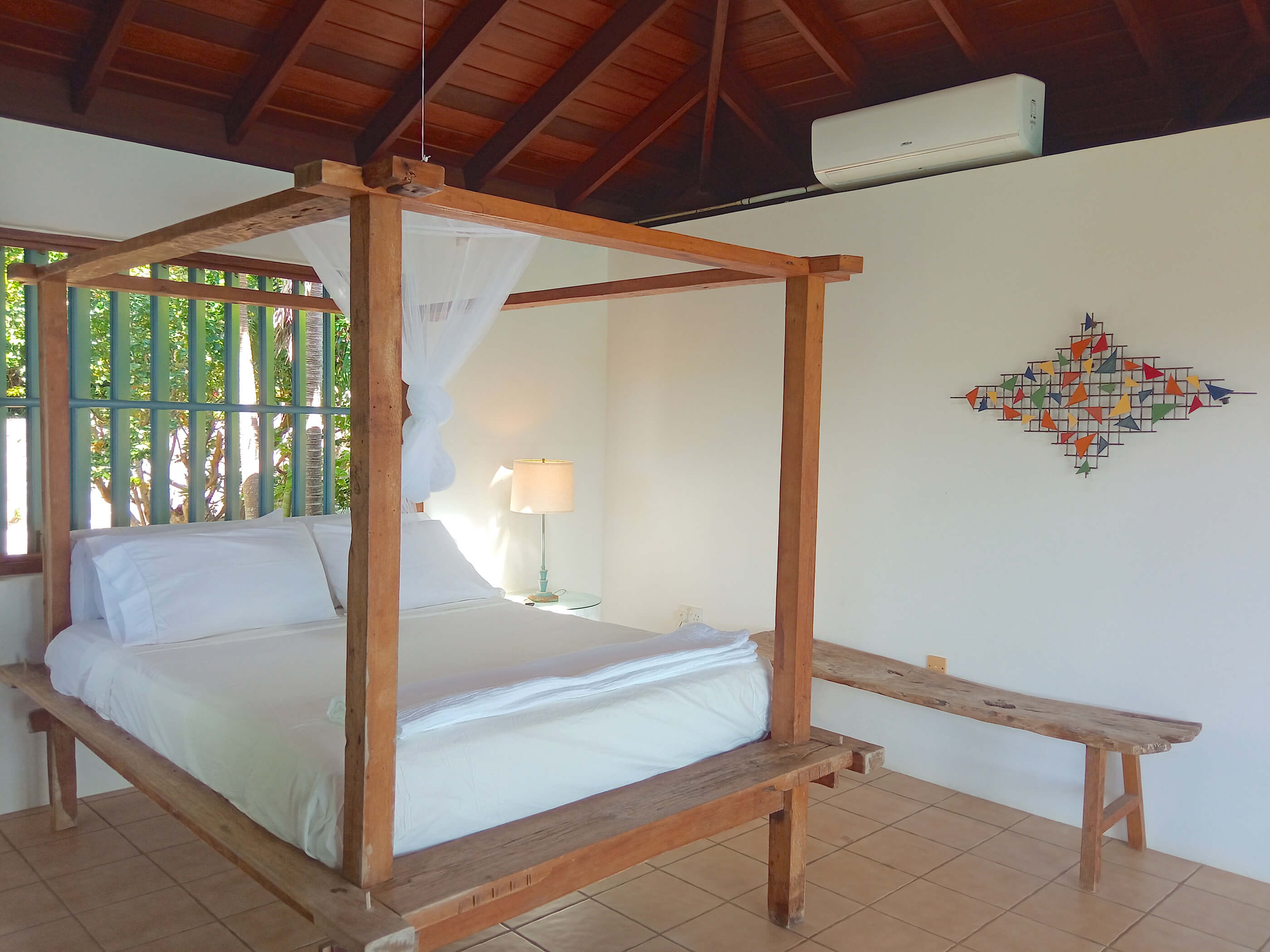 The three roomy en suite bedrooms in Balliceaux all have double beds, air conditioning, private balconies and are draped in cool linens providing a romantic classic atmosphere. Beautifully airy with gentle tradewind breezes wafting through the hardwood louvered windows. The bedrooms also have cool tiled floors. The master bedroom has a large entrance hall and spacious stone shower. The guest bedrooms, located in a separate wing from the master bedroom have their own bespoke shower units and balconies. The large windows built from Brazilian Greenheart provide a gallery of views of the Atlantic ocean.
