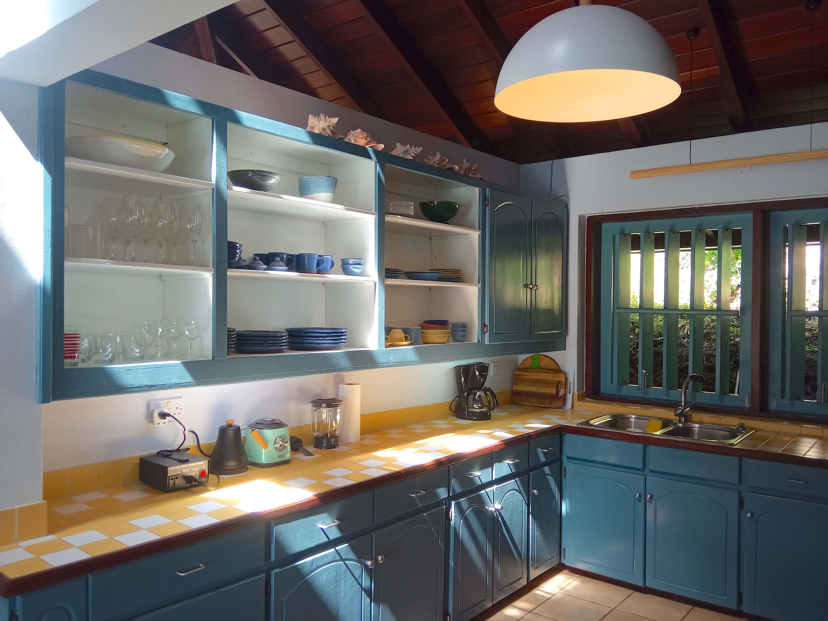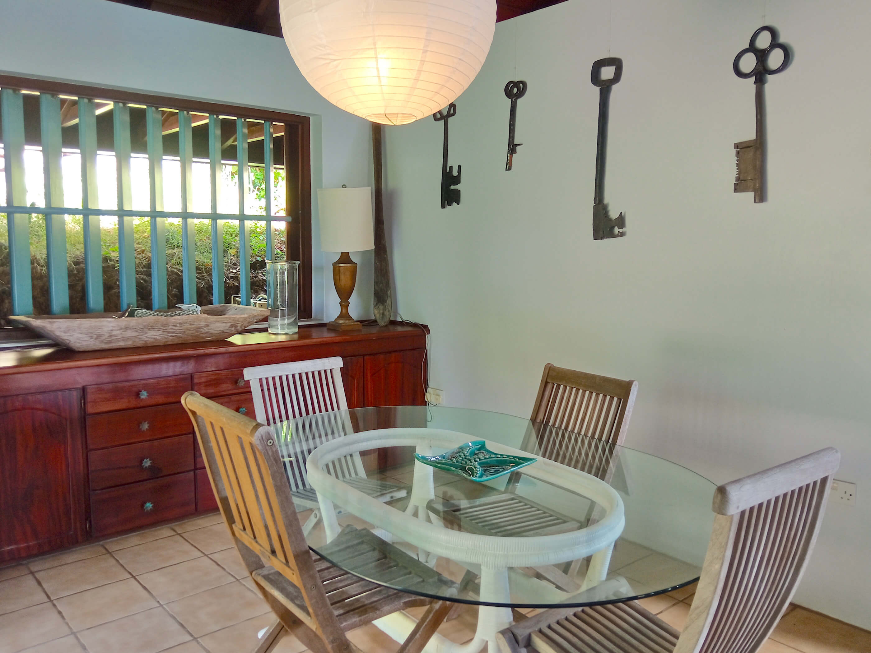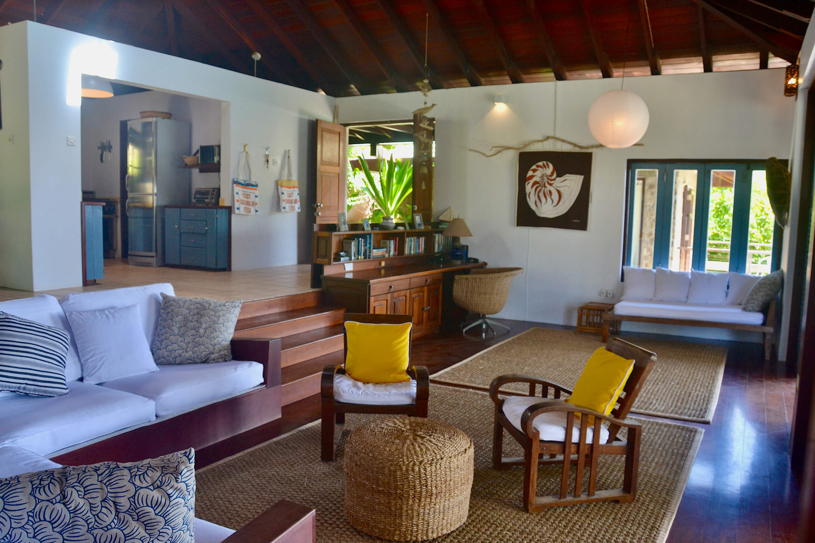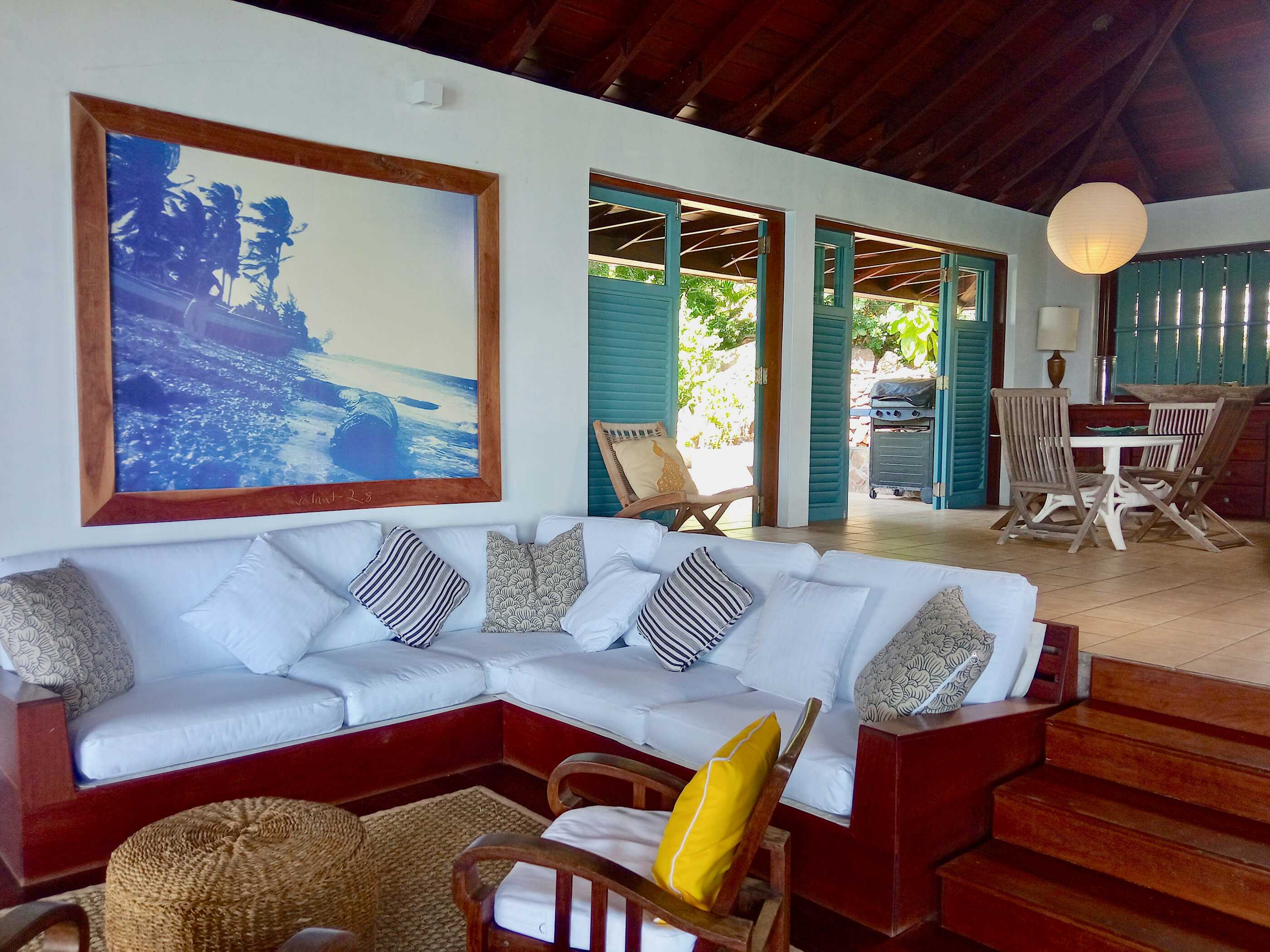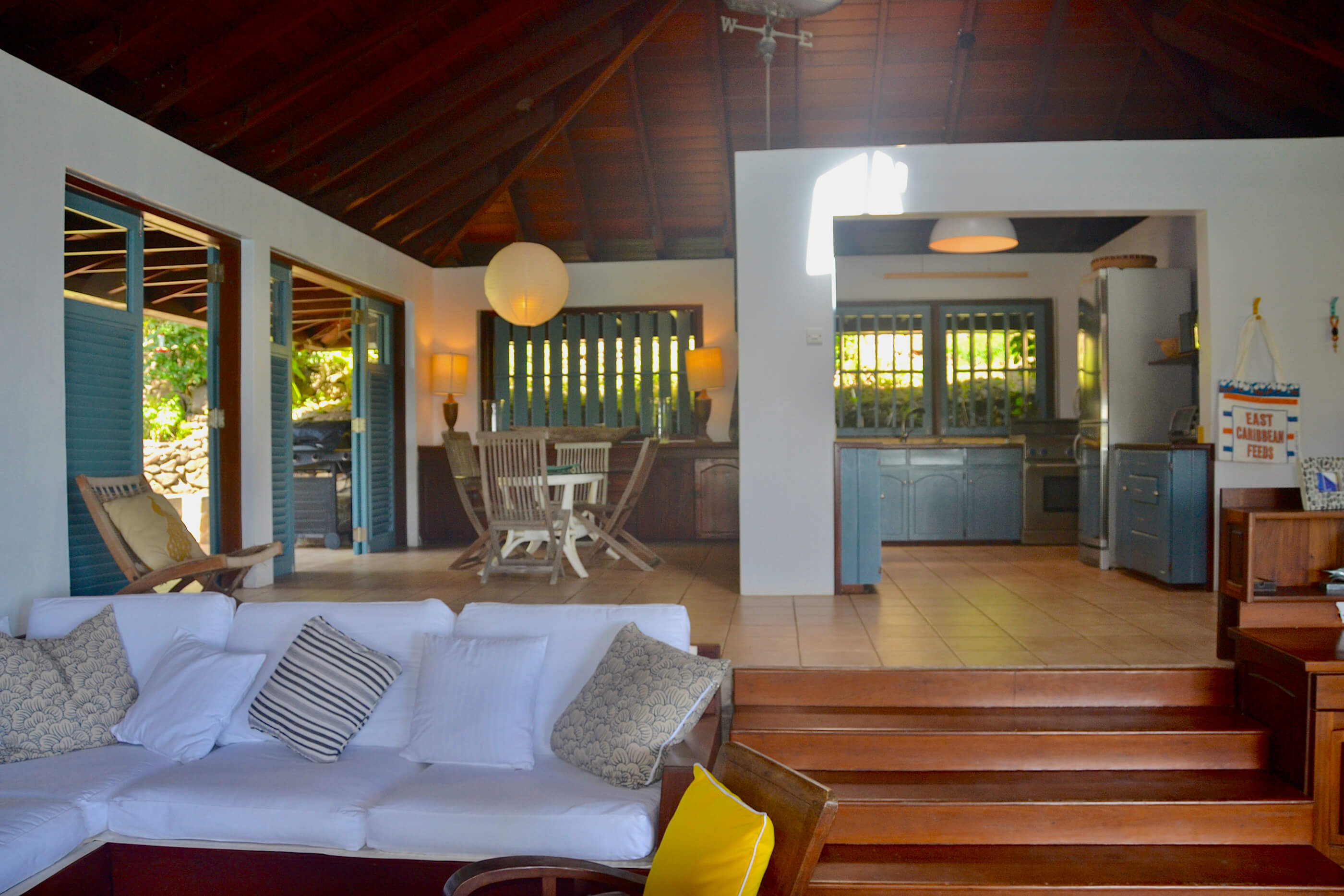 The kitchen is modern and well equipped with a Thermador gas range, American style stainless steel fridge/ freezer, tiled work surfaces and extensive storage space with pantry. This house feels like a well loved home that has been well designed and considered. The bathrooms, like the bedrooms are all unique, with stylish finishes, appropriate for a Caribbean home but also eclectic and sophisticated. The large showers, some outside, are tiled in tropical blues and pale greens the bathrooms are cool and uncluttered. Due to the secluded position of this house an alarm system offers additional security and peace of mind.