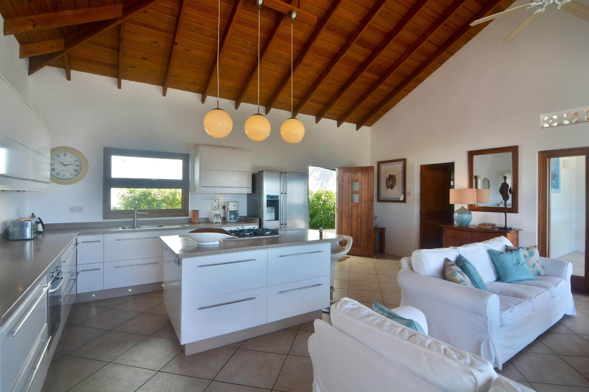 The owners have created an interior both stylish and inviting, comfortable and unique. The kitchen is a clean white functional space that is easy to use and pleasing on the eye. The bedrooms feature handmade mango hardwood furniture.