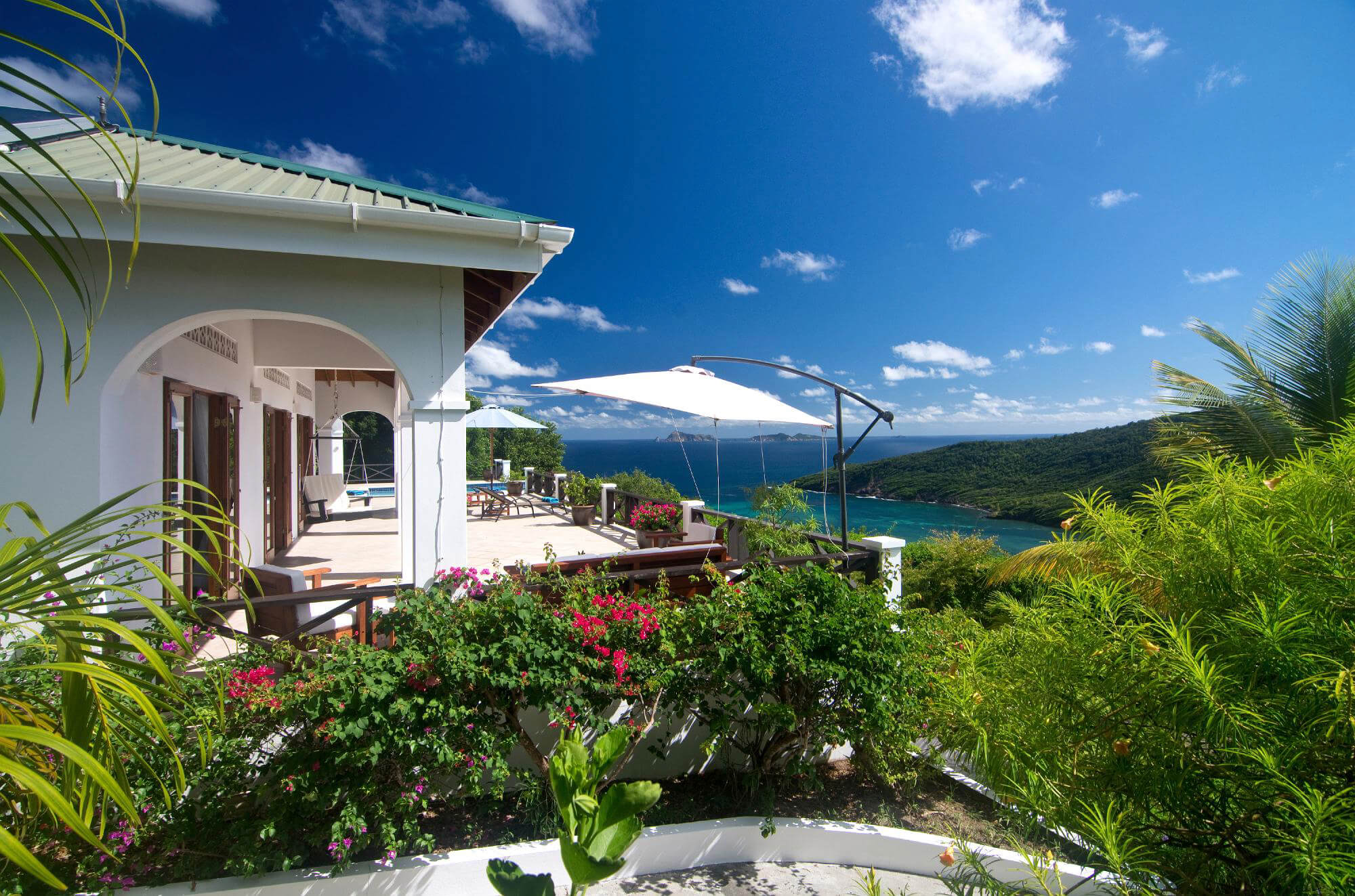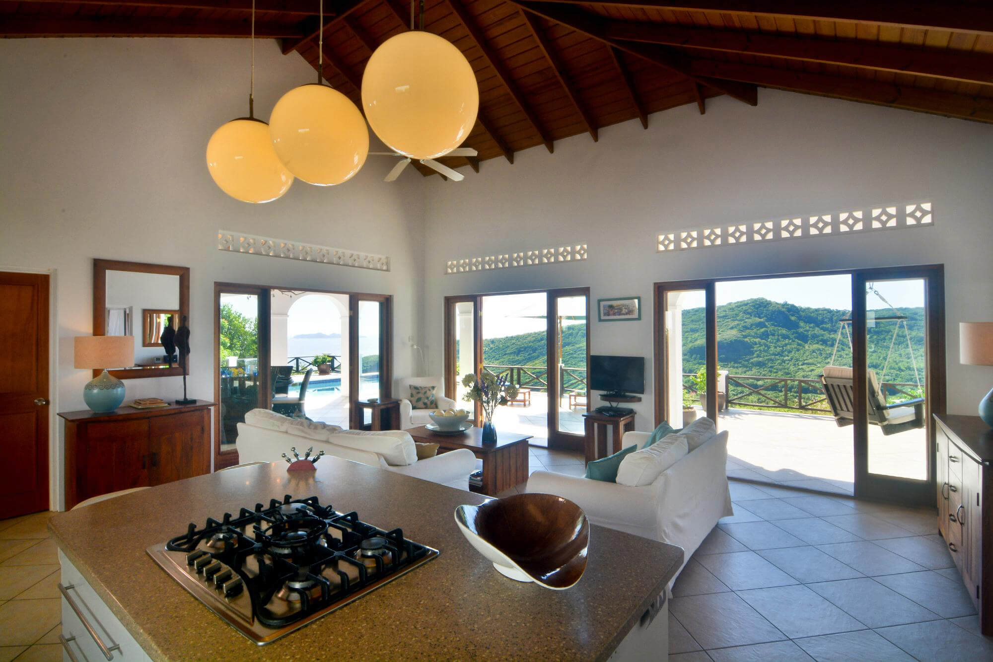 The entire property flows naturally through an open plan central living space which opens out onto the pool deck via large french windows that frame the views over to the uninhabited islands of Balliceaux and Battowia. The high wooden beamed ceilings and cool tiled floors help to maintain a comfortable, naturally cool interior.