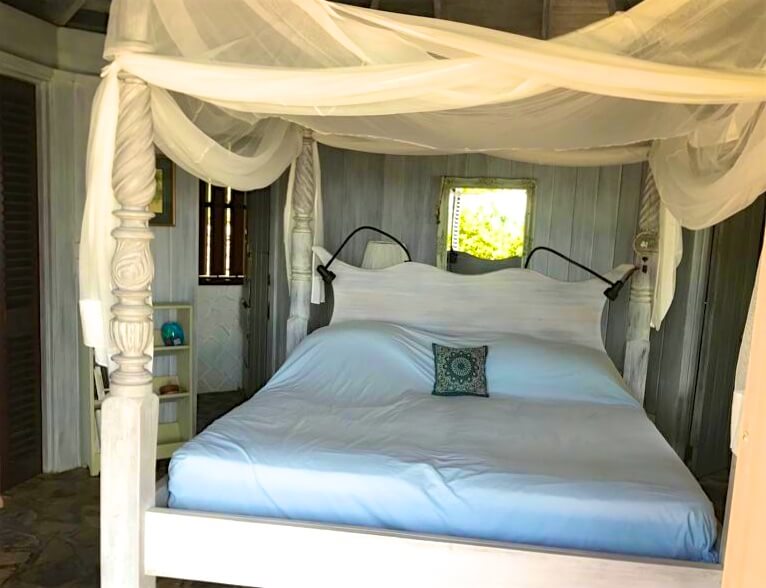 There is a covered walkway from the main house to the master bedroom, which is again octagonal in shape.Both living areas have large wrap around stone floored decks that are roofed for shade.