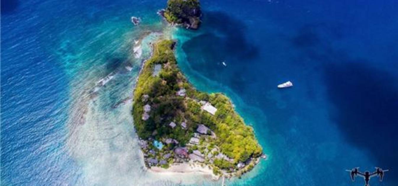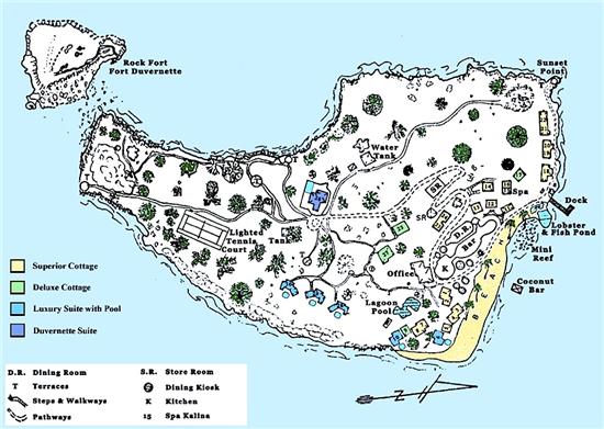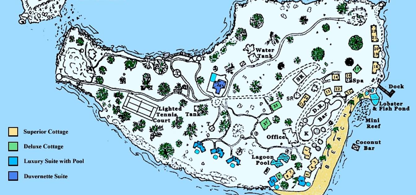 The island is 12.6 acres in size. Current Buildings occupy 2.5 acres allowing for ample space for further development. There are 29 private guest cottages scattered around the island, primarily upon gentle sloping hillsides overlooking the ocean.