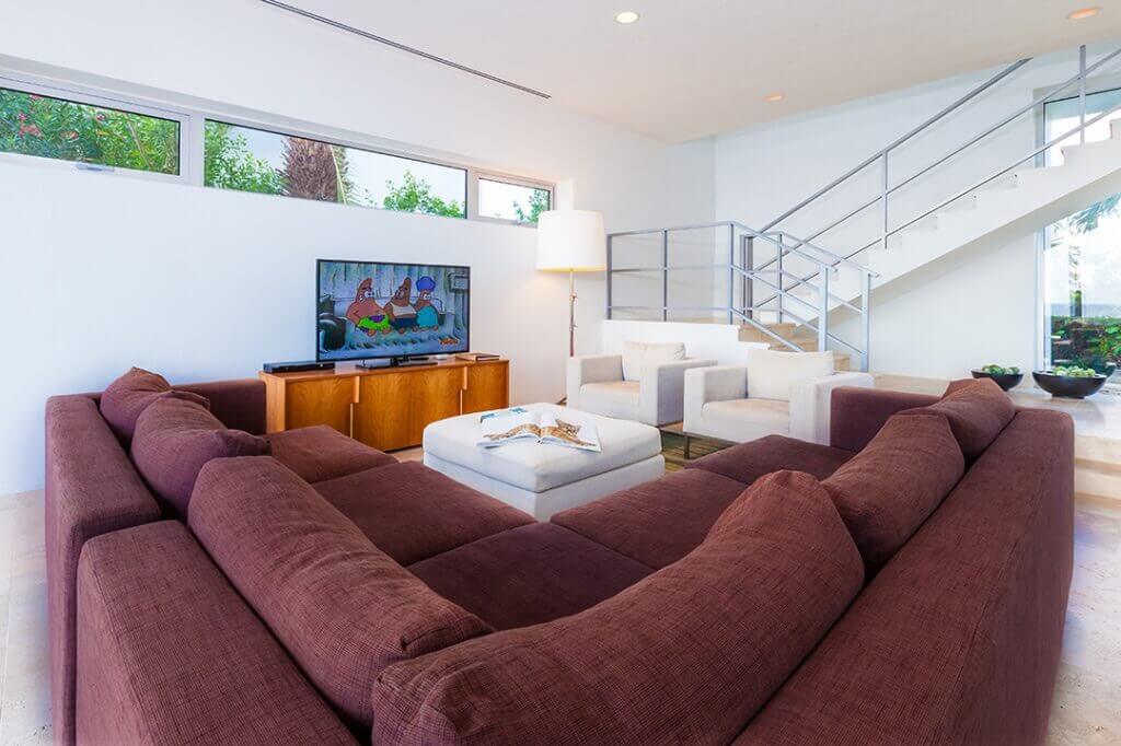 There are 5 bedrooms, 3 King Size and 2 queen size each with a private luxurious bathroom, air conditioning and ocean views to die for. Four upstairs, one on main floor. Full air conditioning with convenient zone control, flat screen TVs (55-inch in great rooms) DVD player, WIFI and free calls via the Internet. Local cell phones can be arranged.