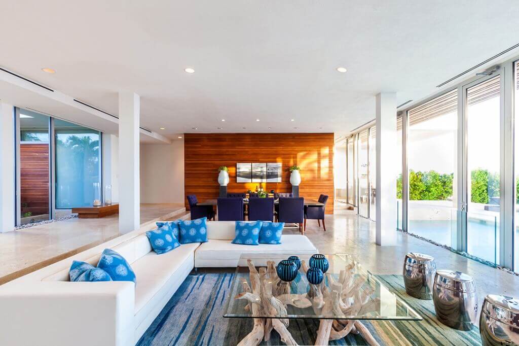 The open floor plan has floor-to-ceiling windows that let the views outside become the artwork inside. Formal dining table with seating for 8. Furniture can be reconfigured for events.