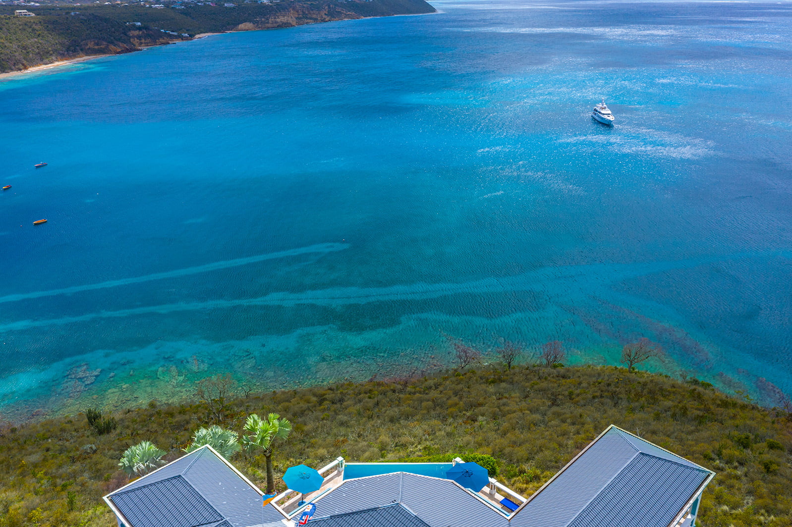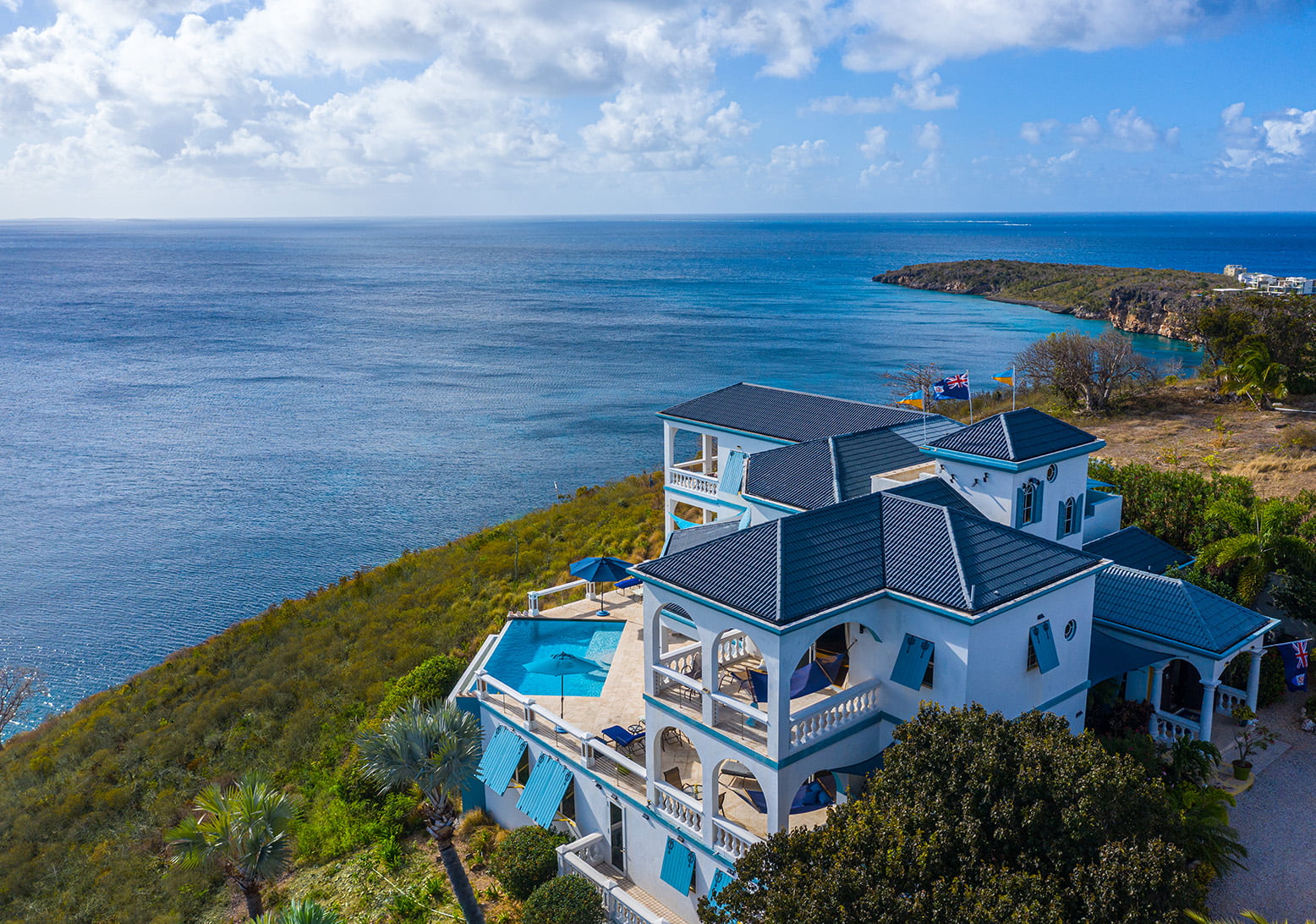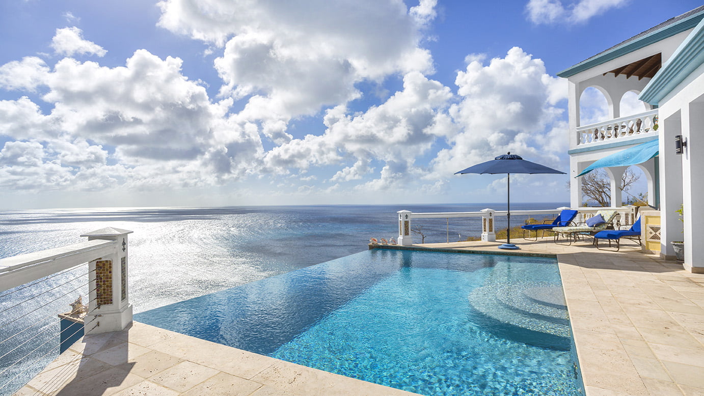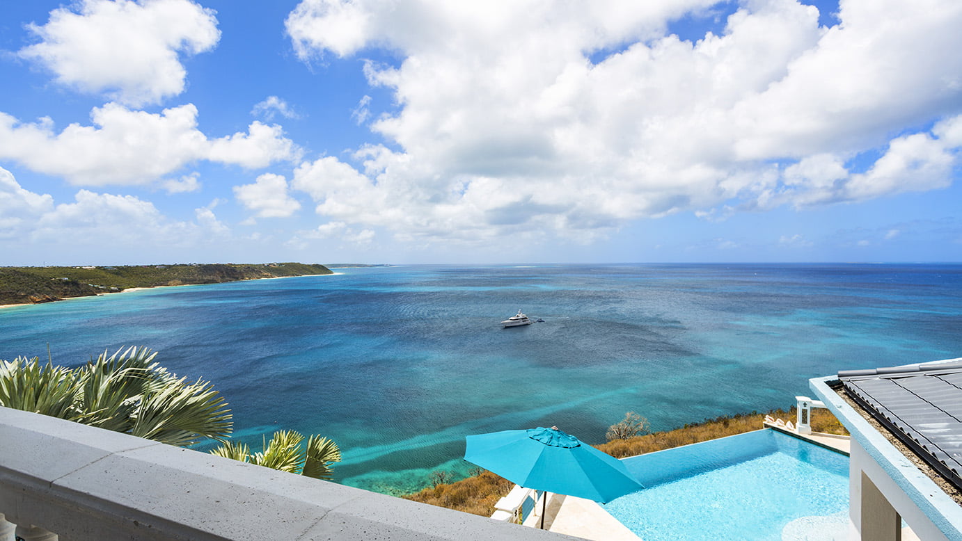 The 400 sq ft infinity edge pool has uninterrupted sea views right down the coast to Crocus Bay below and out to Sandy Island and Prickly Pear Cays.