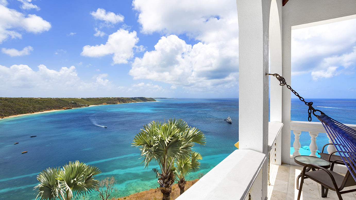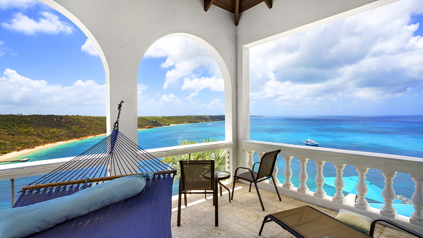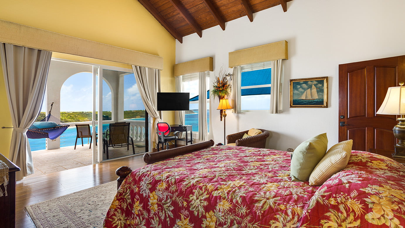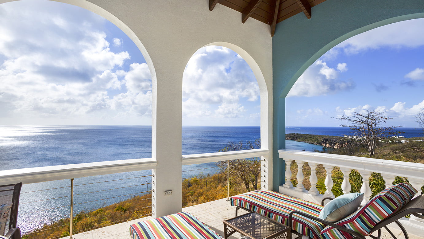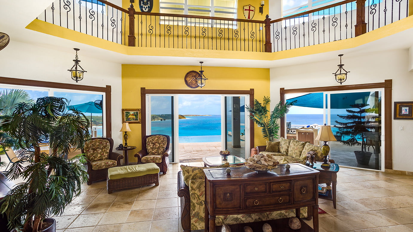 The 400 sq ft infinity edge pool has uninterrupted sea views right down the coast to Crocus Bay below and out to Sandy Island and Prickly Pear Cays.