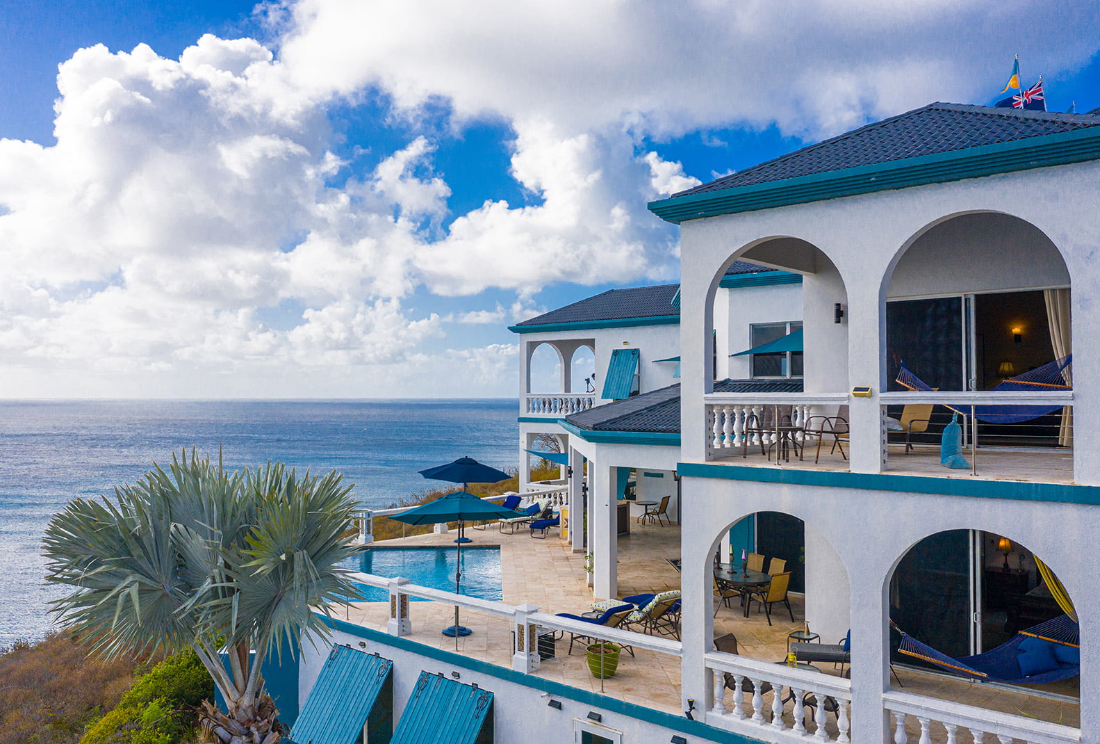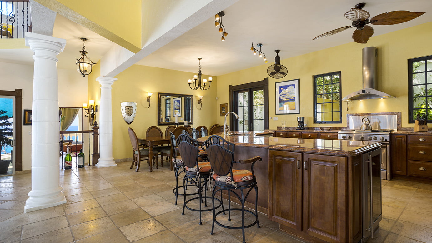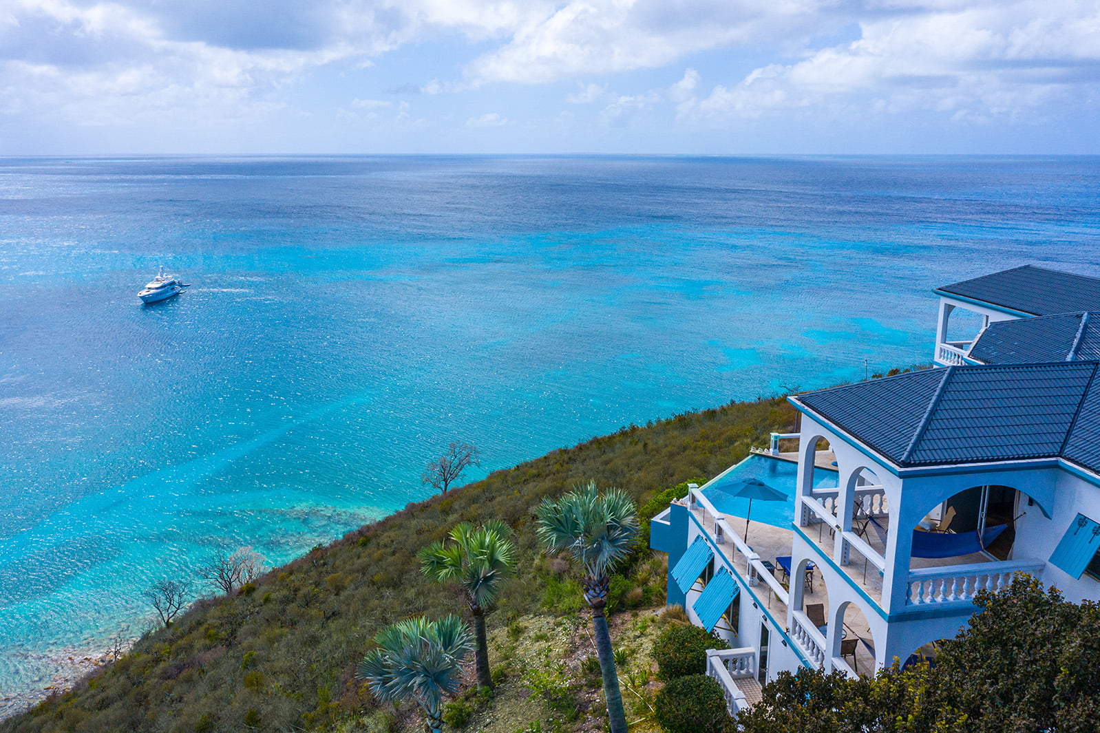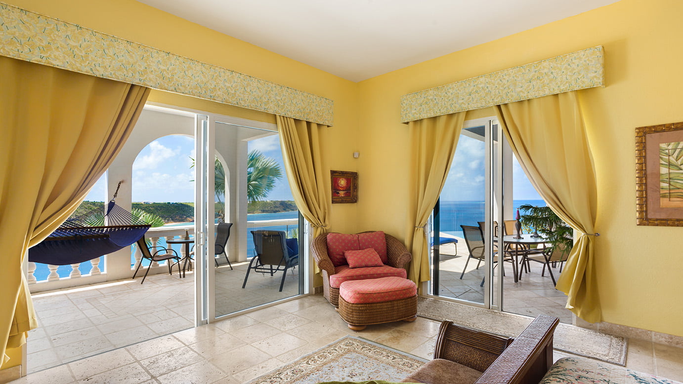 The 400 sq ft infinity edge pool has uninterrupted sea views right down the coast to Crocus Bay below and out to Sandy Island and Prickly Pear Cays.