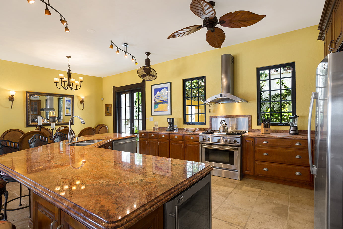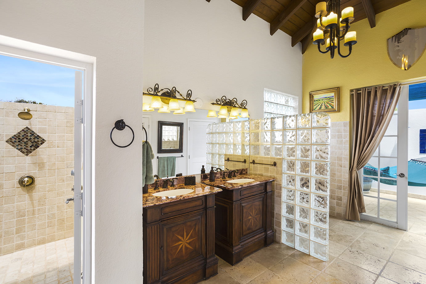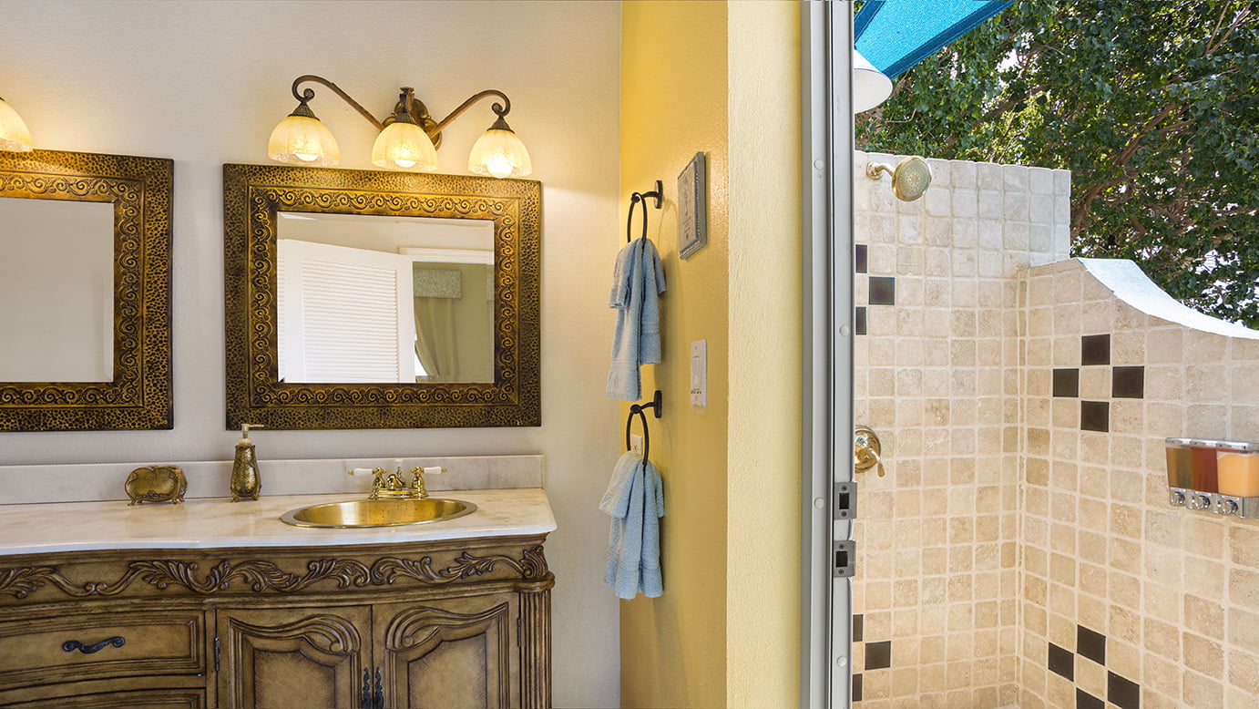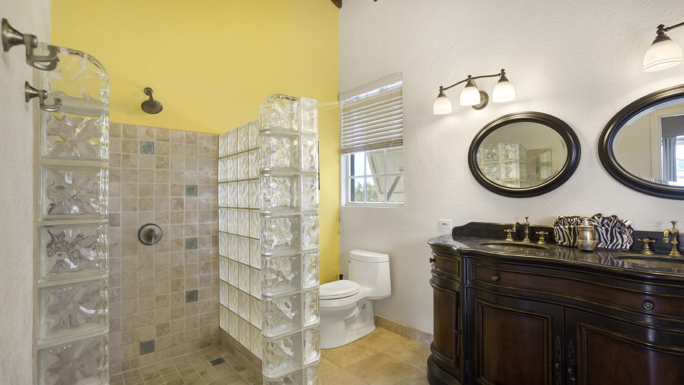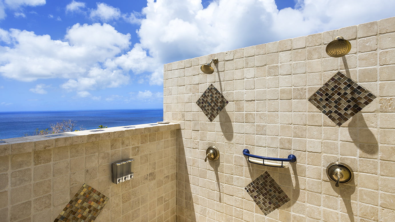 The first floor bedrooms have level access to the pool, outdoor grille/dining areas, living room with three steps to the kitchen/dining areas. Two bedrooms have stunning double headed outdoor showers.