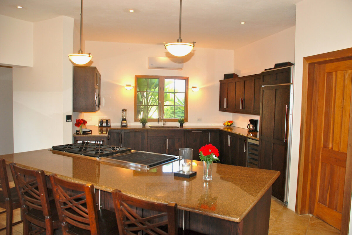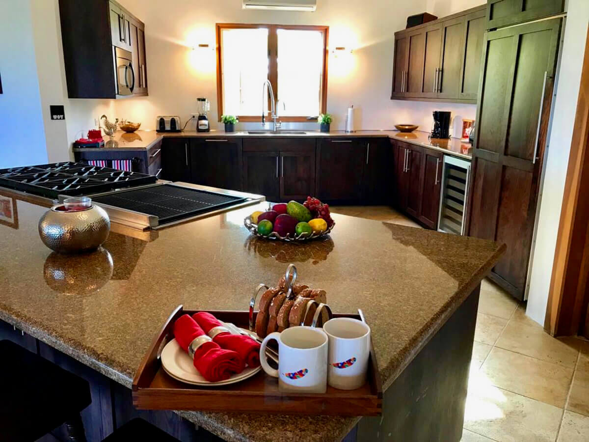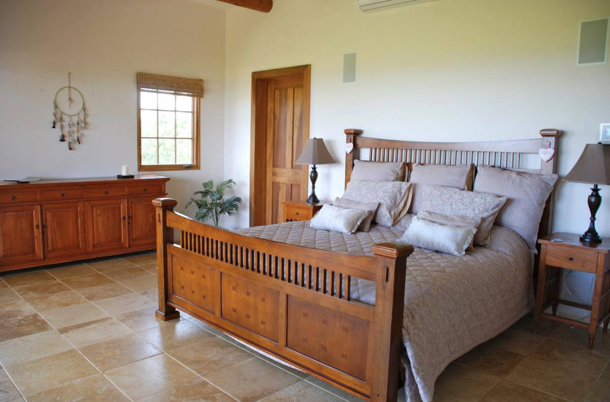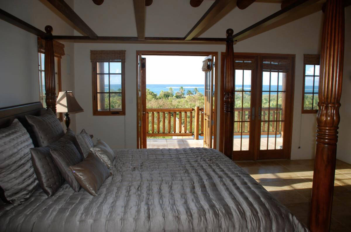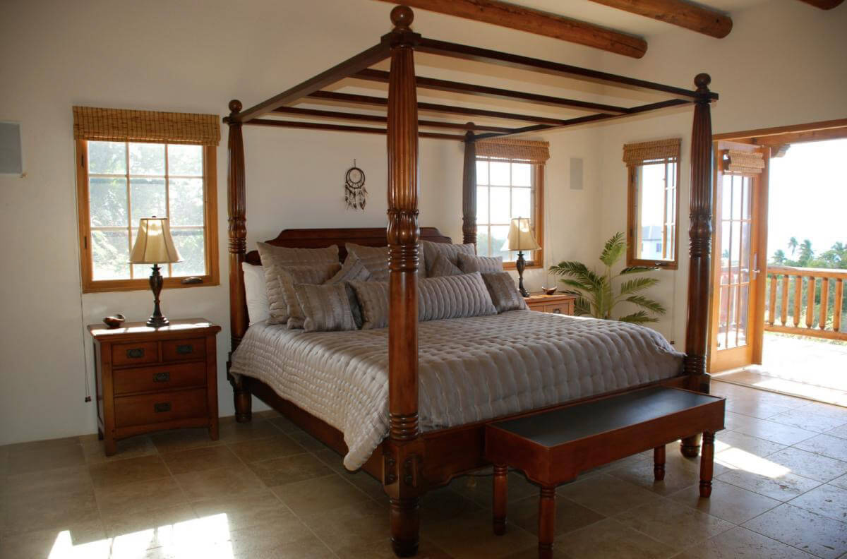 The kitchen, dining, and sitting areas open to the veranda to become one spacious living and dining area. The dining room has an imported Brazilian hardwood table that comfortably seats eight. The living area features a TV and a built-in fireplace, which uses liquid fuel gel to provide ambiance without heat. The air-conditioned, professionally designed chef’s kitchen features granite countertops and top quality appliances, including a Viking double oven, a Viking grill, a GE monogram six-burner gas stove, a warming oven, an American fridge, an ice maker, a wine fridge, and two dishwashers. All three bedrooms are air-conditioned and have ensuite bathrooms, Sonos sound systems, and flatscreen TVs. The master suite has a king bed, a walk-in dressing room, and a DVD player. Its ensuite bathroom has a deep tub, a walk-in shower, and a dual vanity. Plus, it has a private balcony overlooking Shoal Bay. The second suite has a four-poster king bed and french doors that open to the veranda. Its ensuite bathroom has a large shower and dual vanity. The third suite has a queen bed. It shares a bathroom with the office, which acts as an optional fourth suite. This fourth suite has a daybed and trundle.