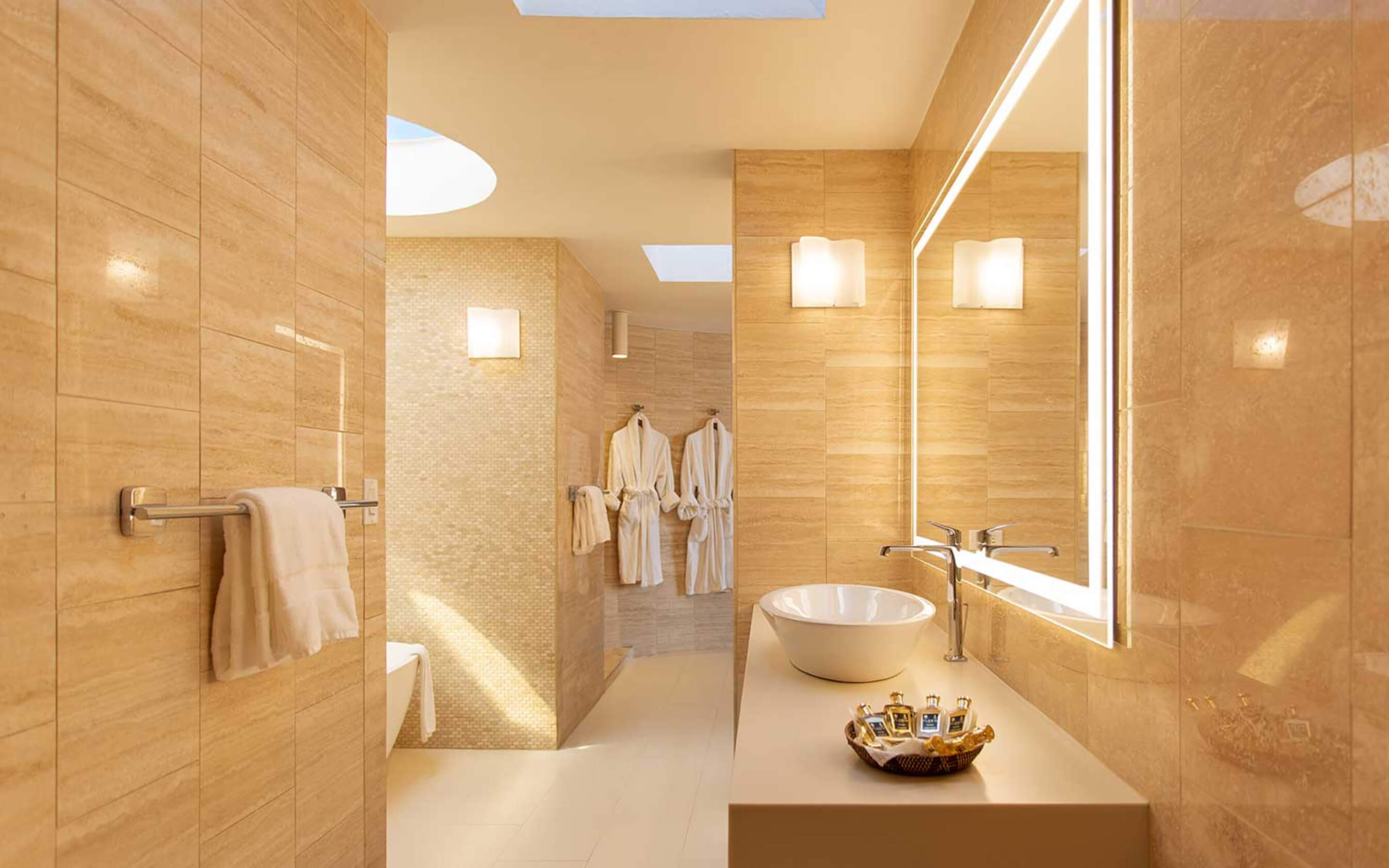 The Blue Diamond, all 13,000 sq ft of It's floor space, is shaped uniquely as a flower and features a master suite with a private terrace, office,jacuzzi and double shower. There is a Great Room with grand piano, an entertainment suite with private V shaped bar and massage and treatment room for guests to enjoy relaxing spa treatments.